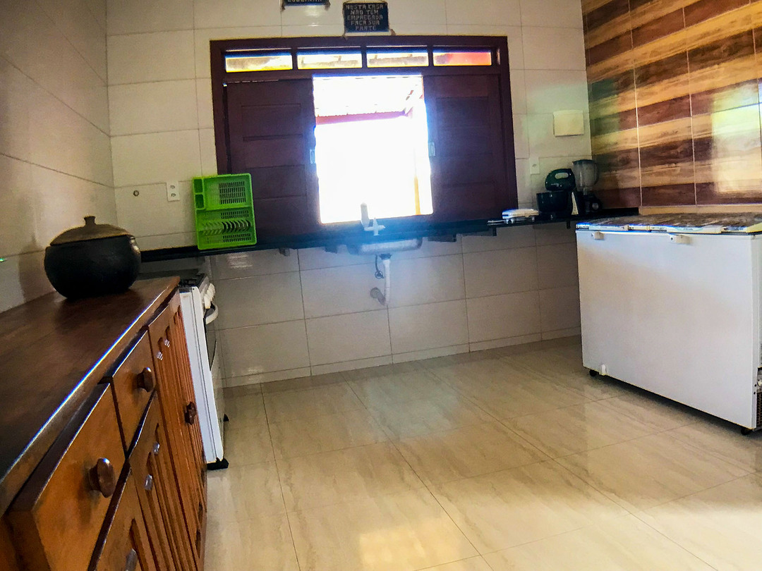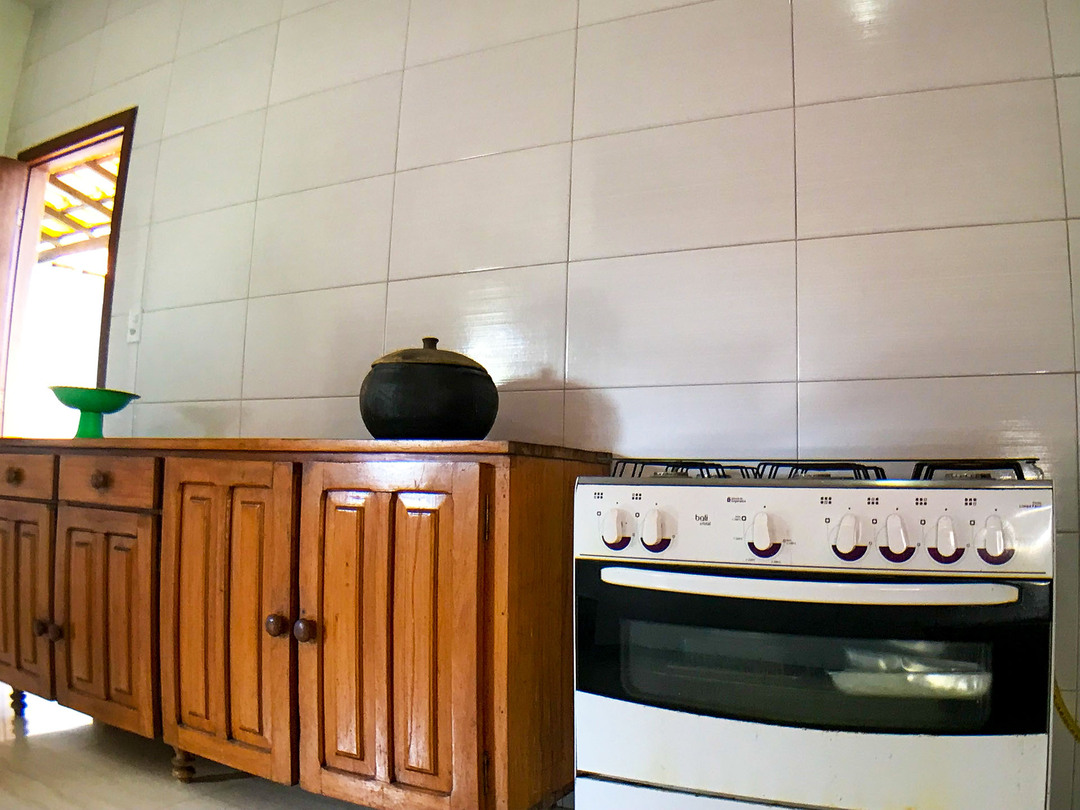 - A cozinha oferece fogão, geladeira, liquidificador, panelas, louças e utensílios variados