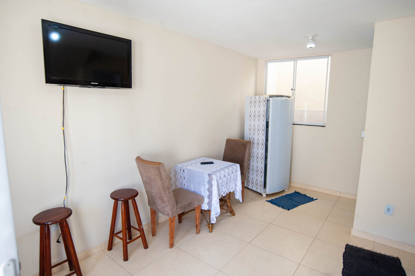 - Sala com sofá, smart TV, ventilador e mesa com 2 cadeiras