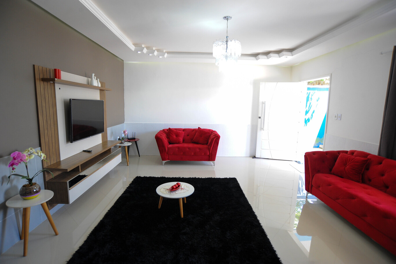 - A sala está equipada com cadeira, mesa de centro, poltrona, sofá e barzinho com sistema de som