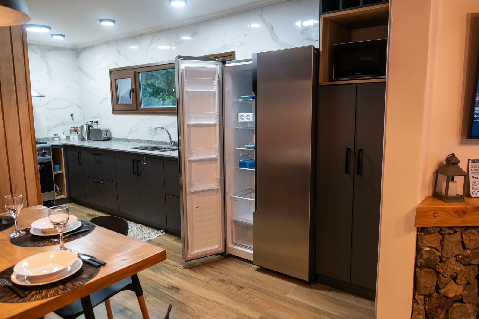 A cozinha americana está totalmente equipada com eletrodomésticos modernos, como geladeira, forno, micro-ondas e cafeteira.