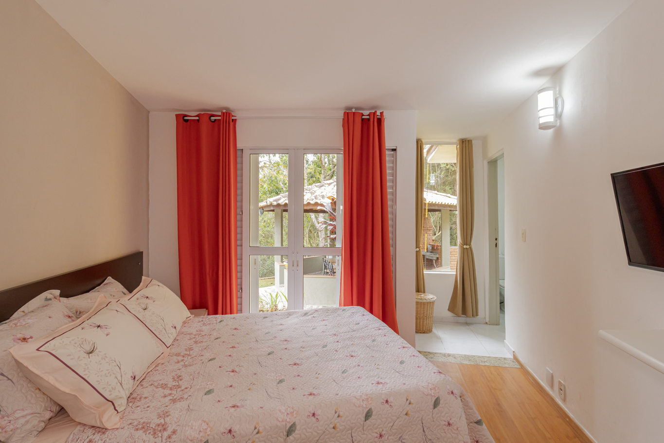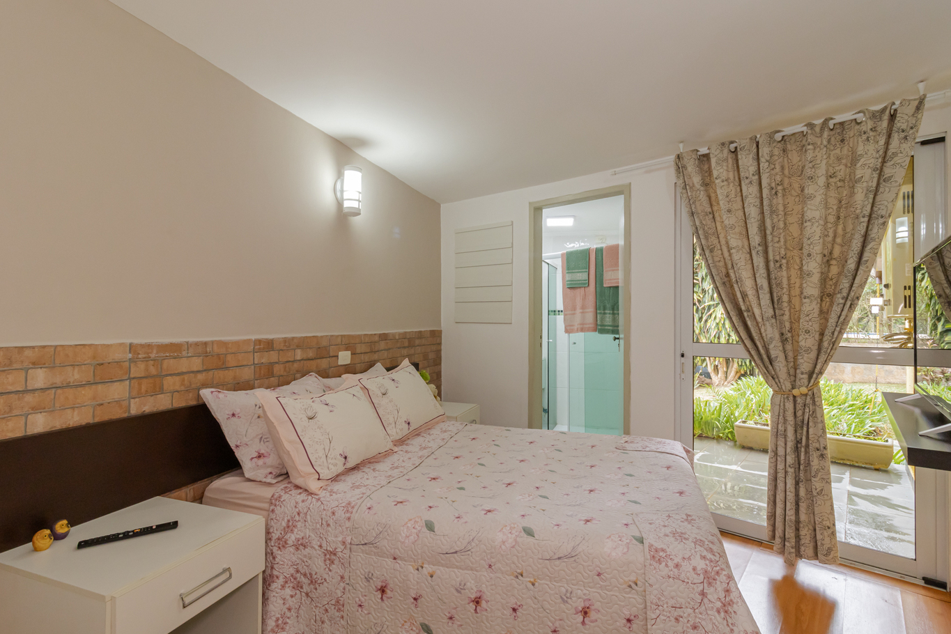 - Quarto 2 (suíte): cama de casal, armário, Smart TV e banheiro privativo