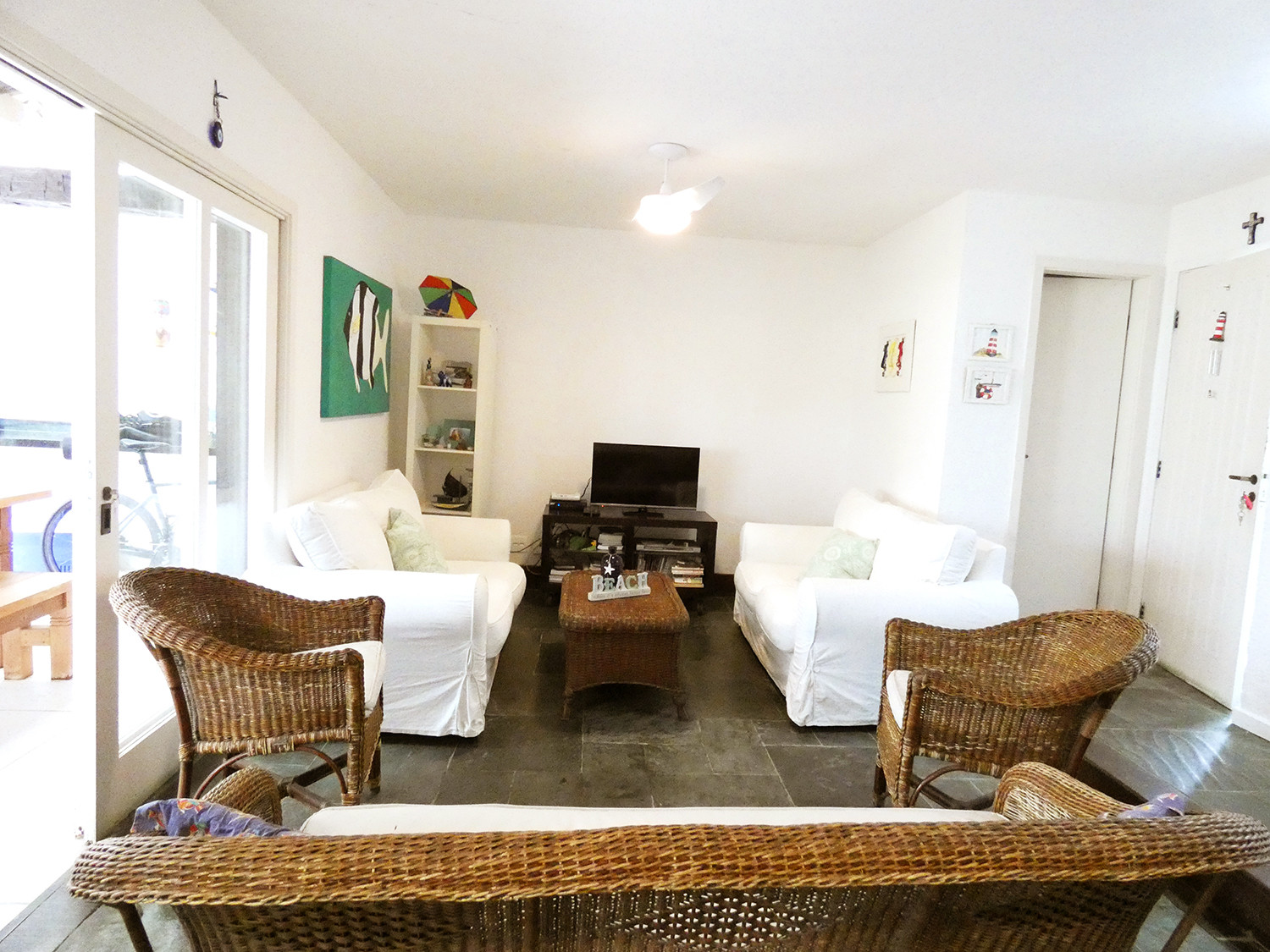 A sala está equipada com sofá, TV, mesa de jantar, ventilador de teto, livros/cds e itens de decoração.