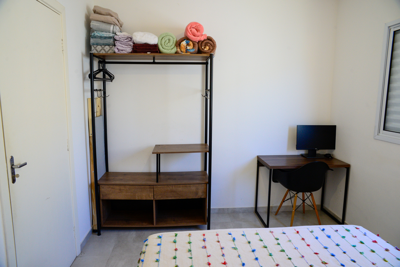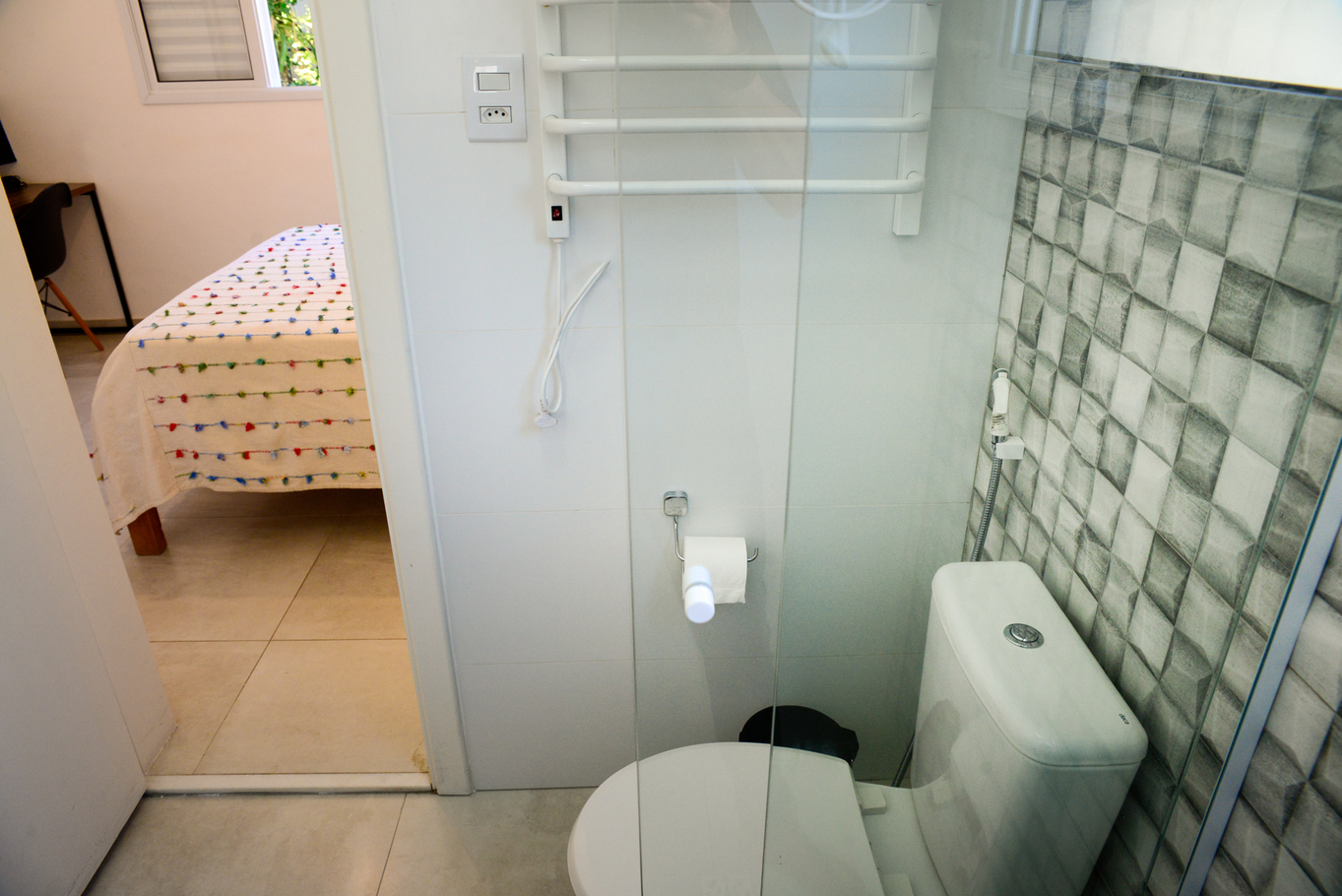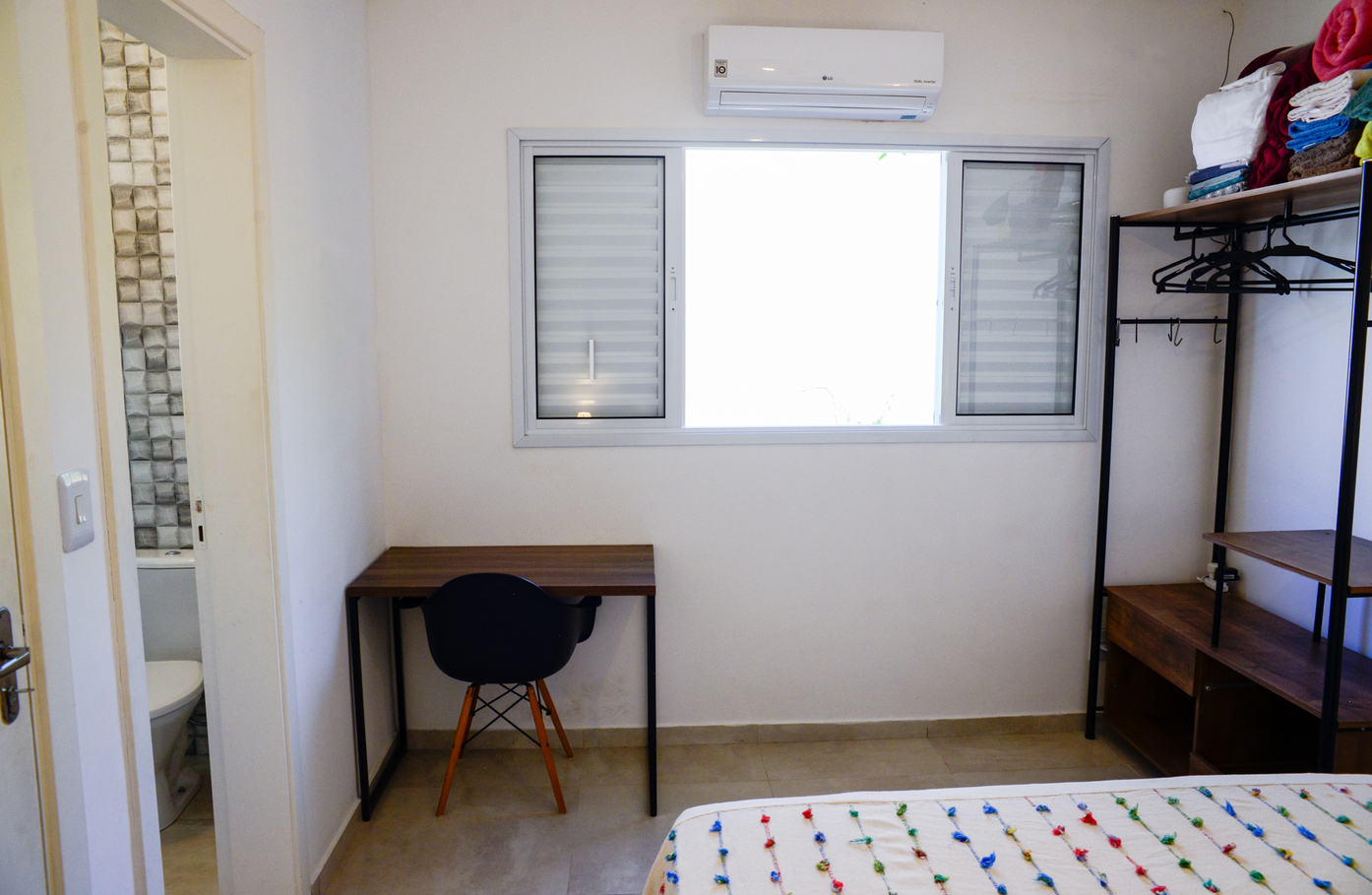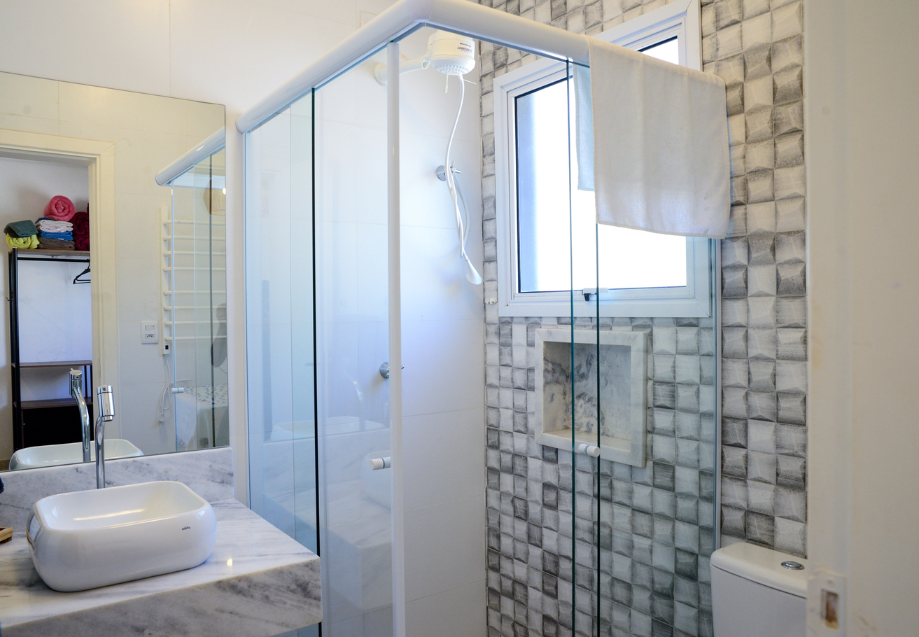 - As suítes possuem 1 cama de casal, armário, protetor de colchão, chuveiro elétrico e box de vidro