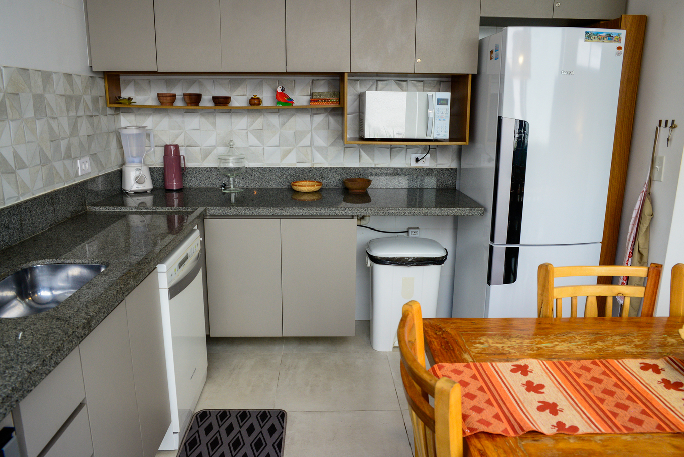- A cozinha é totalmente equipada com diversos utensílios, incluindo cafeteira, freezer, fogão, forno, geladeira, liquidificador e máquina de lavar louça (exceto sal, pimenta e óleo)