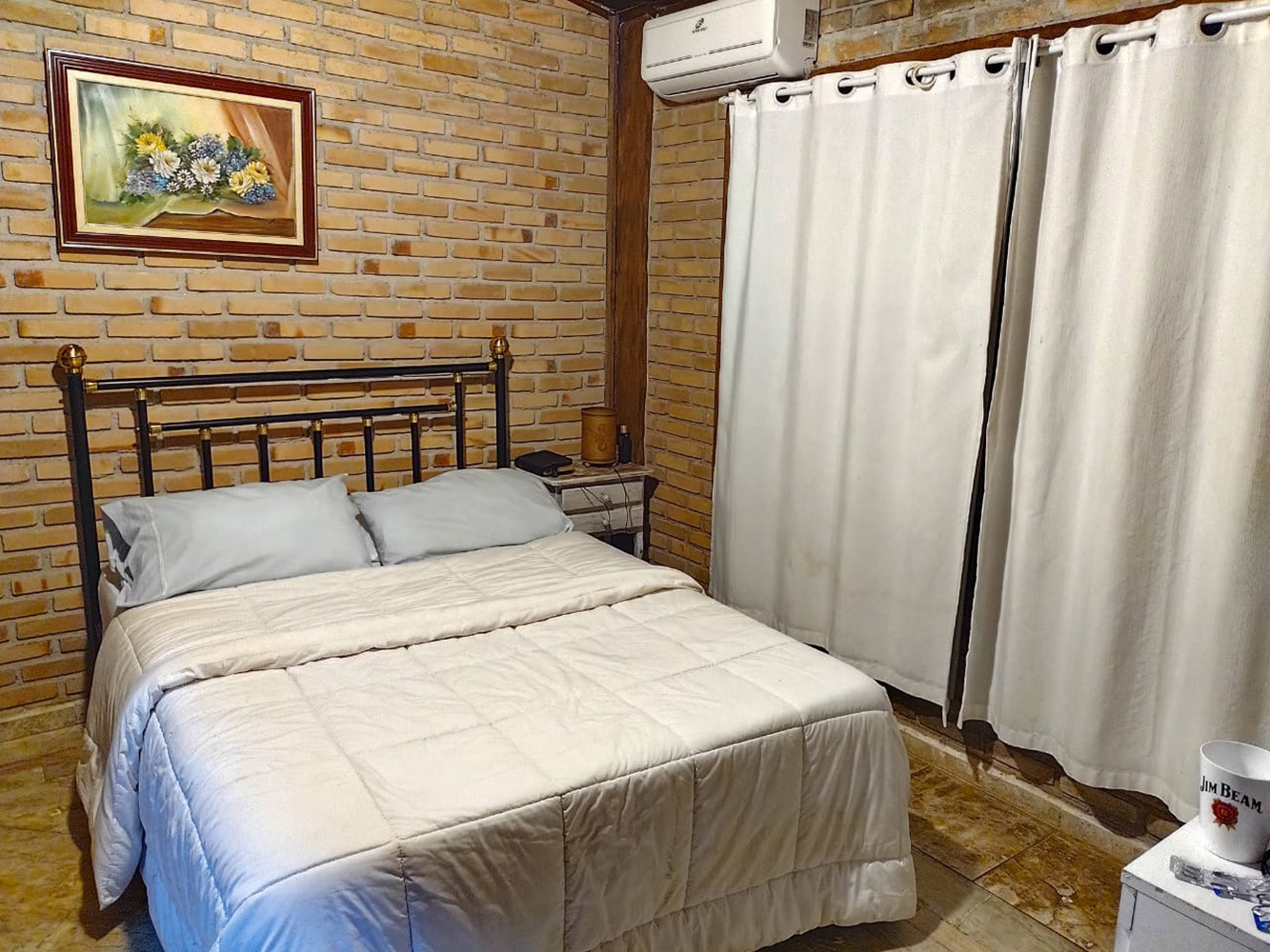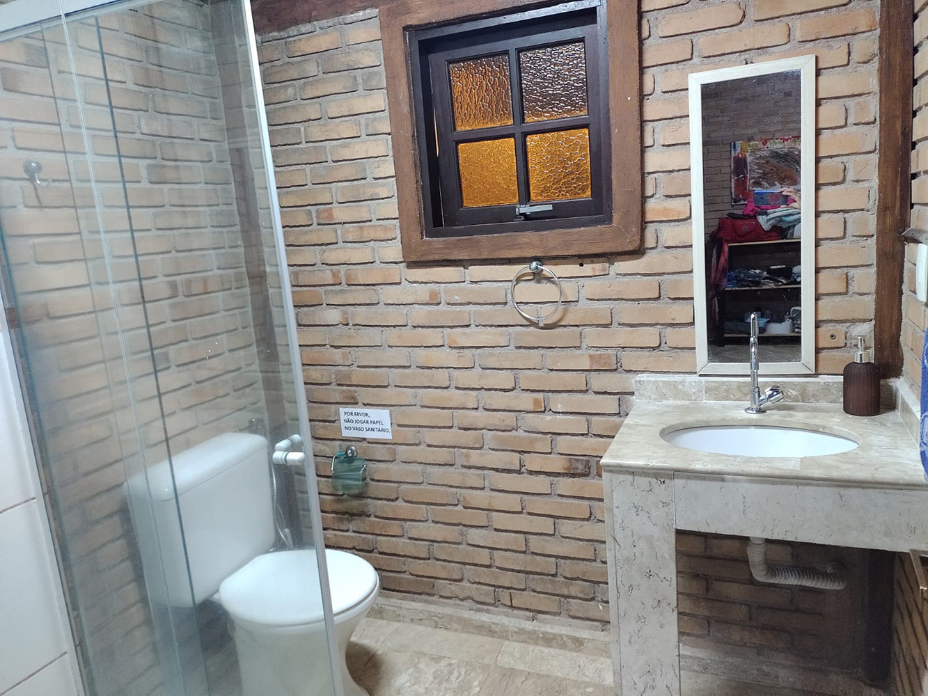 - Todos os quartos são suítes com chuveiro elétrico, box de vidro e em um deles há secador de cabelo. Neles, você encontrará armário, edredom, protetor de colchão e ventilador de teto