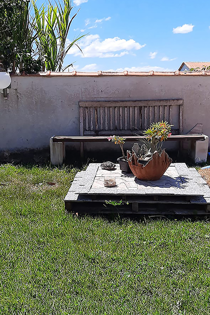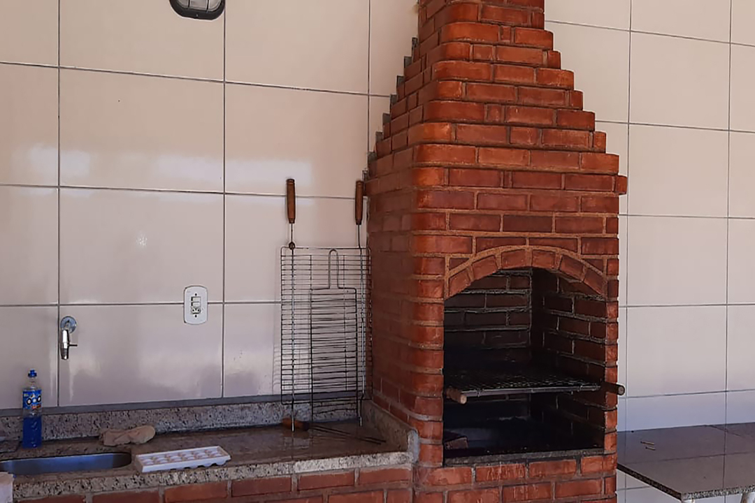 - Na área externa da nossa casa há piscina com guarda-sol, área gourmet com churrasqueira com duas mesas de mármore dentro da área gourmet e duas mesas plasticas com cadeiras na parte de fora onde fica a piscina, e um chuveirão exclusivo para higienização pré e pós-piscina.