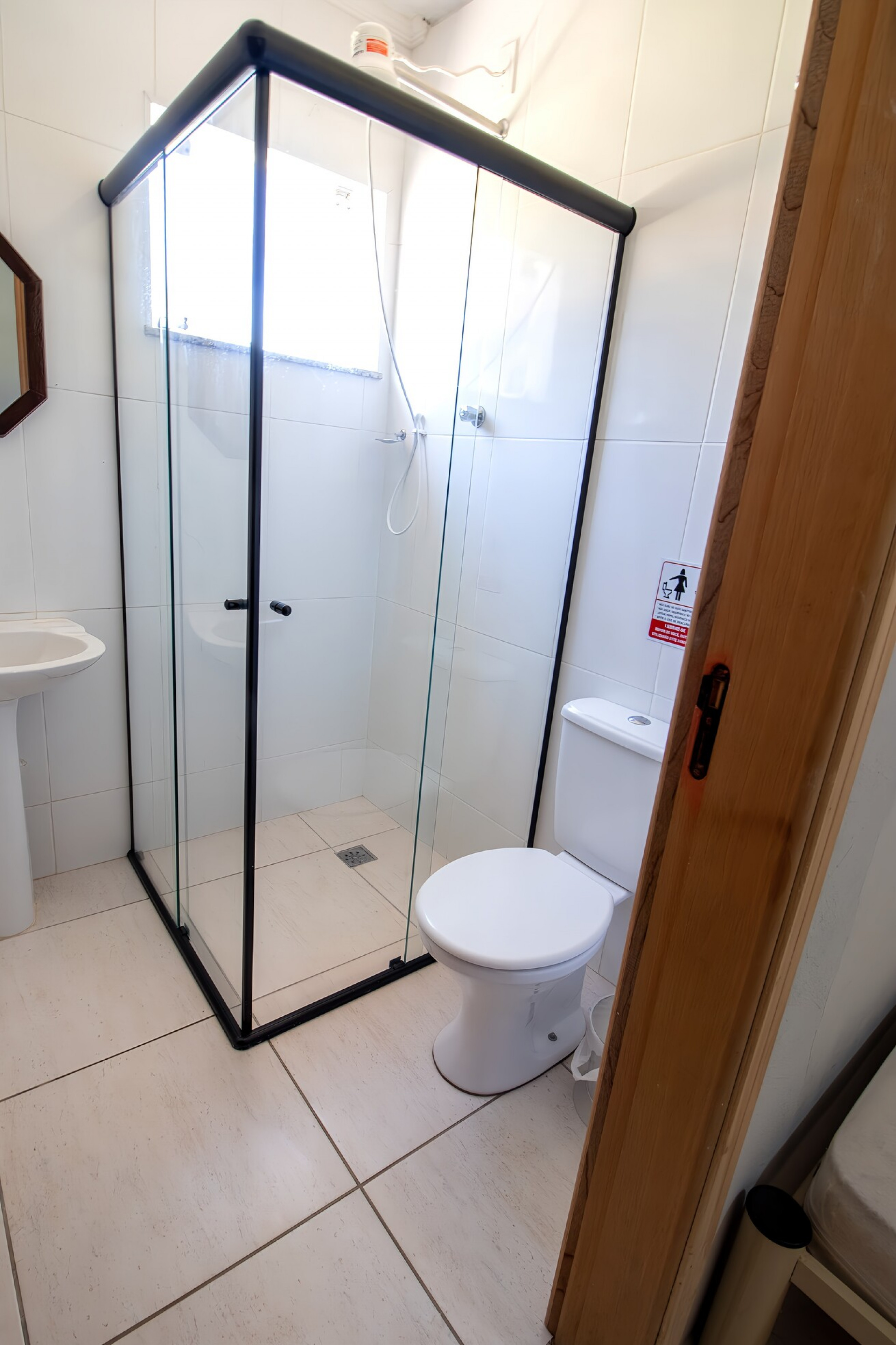 - Os banheiros possuem chuveiro elétrico, box de vidro blindex e secador de cabelo