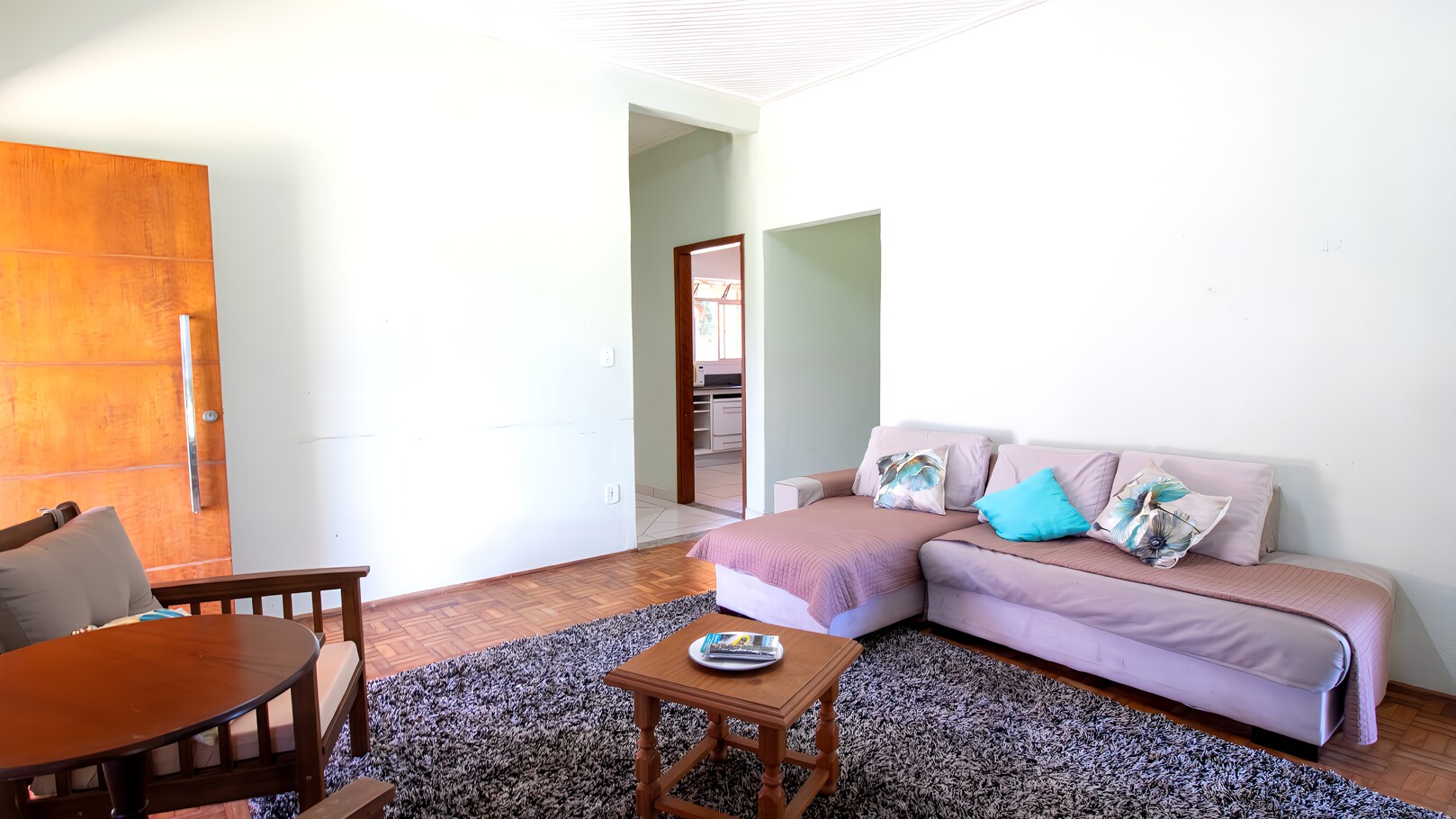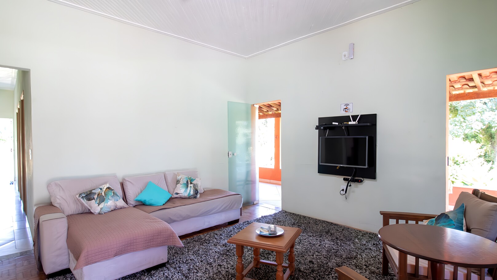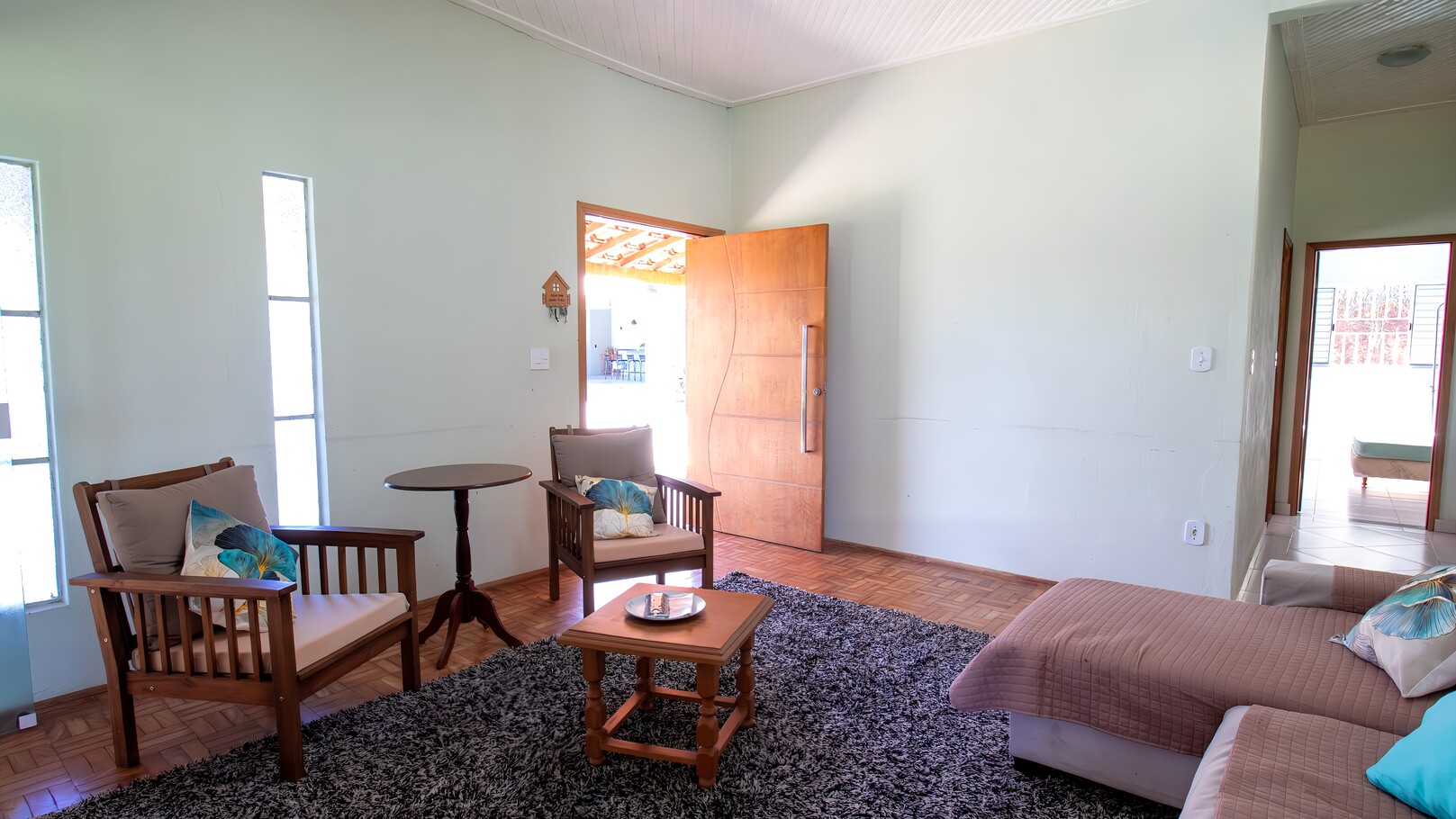 - A sala está equipada com cadeira, mesa de centro e sofá
