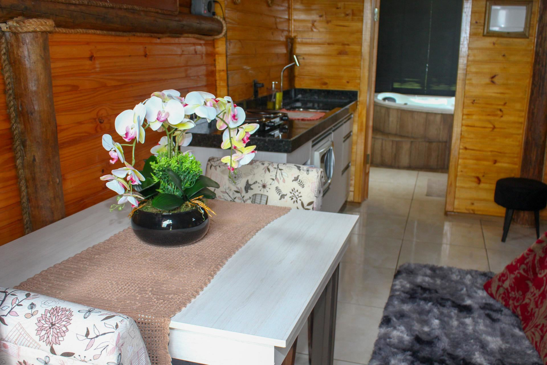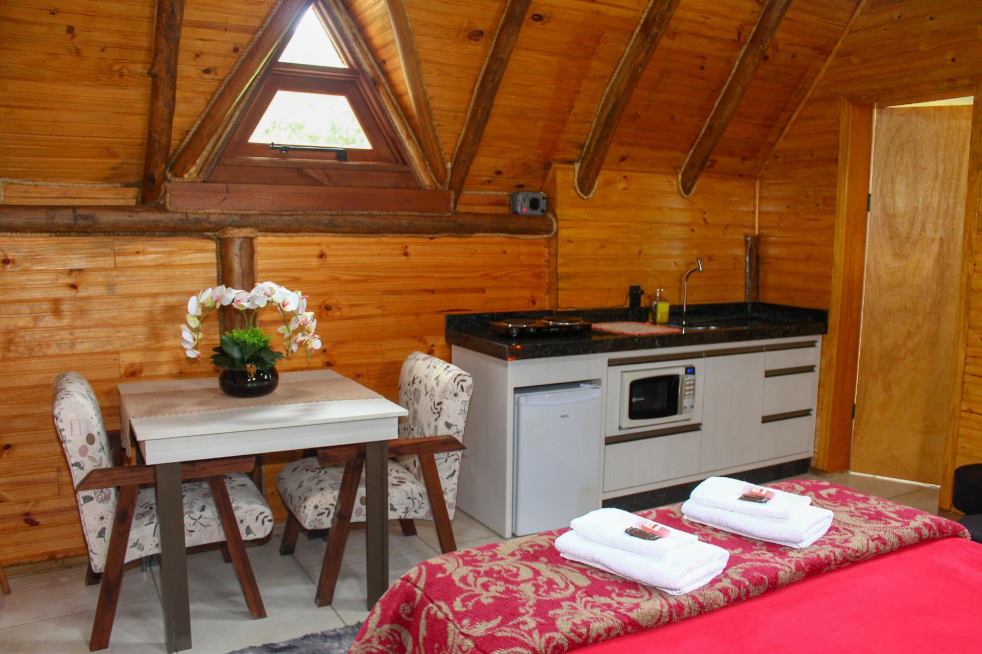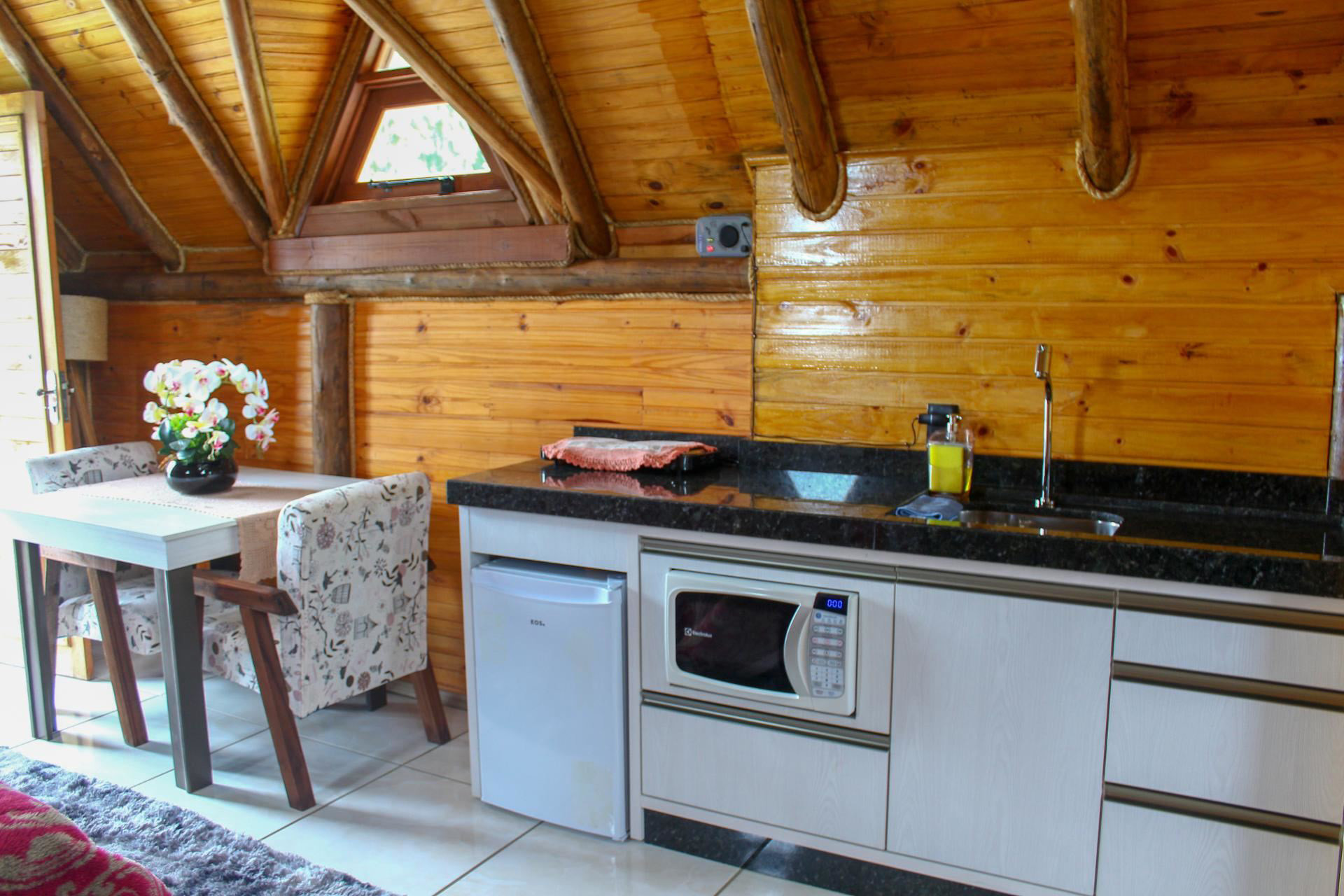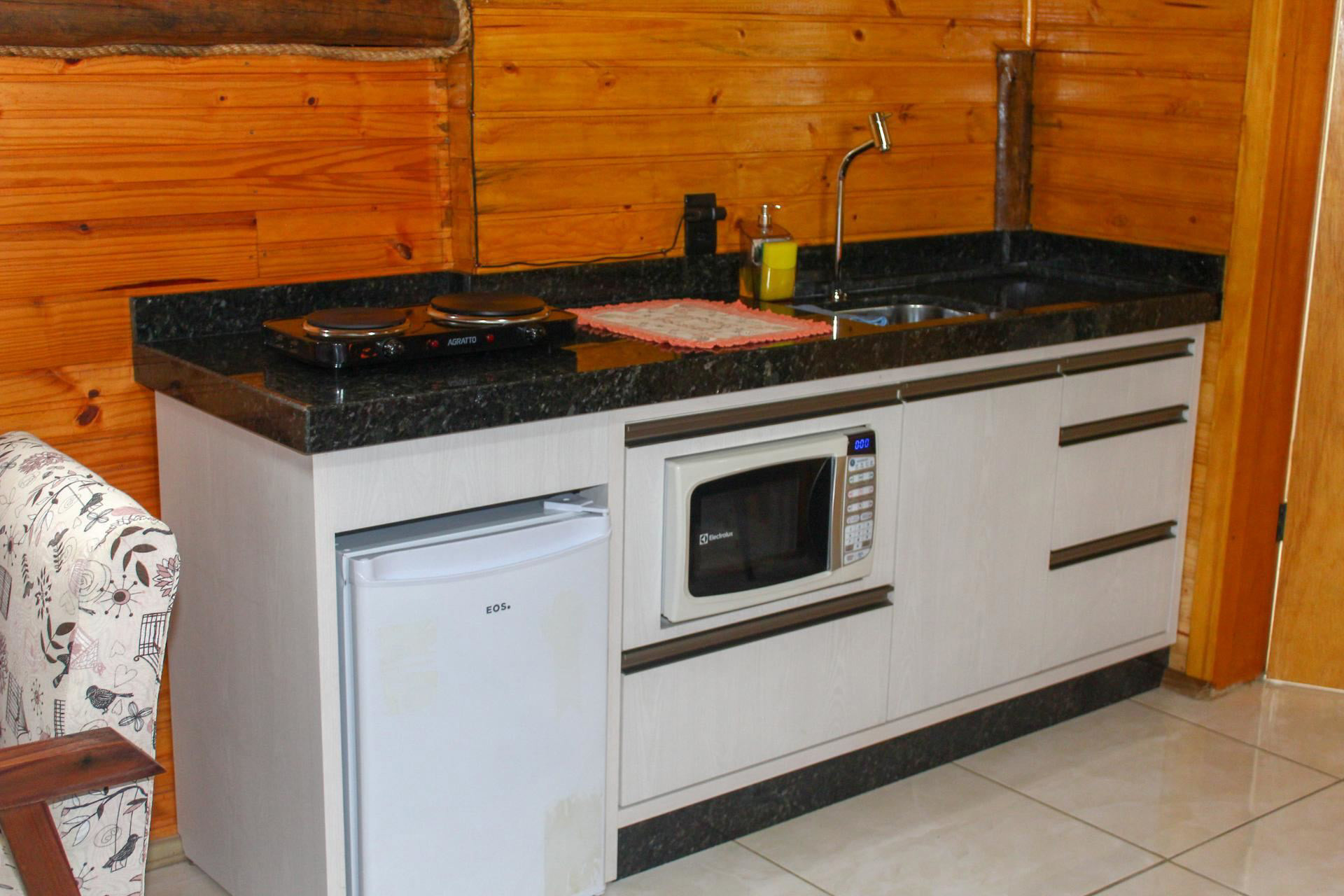 - A cozinha é equipada com todos os utensílios necessários para preparar suas refeições, incluindo fogareiro elétrico de bocas, frigobar, microondas, sanduicheira, balcão e mesa com poltrona