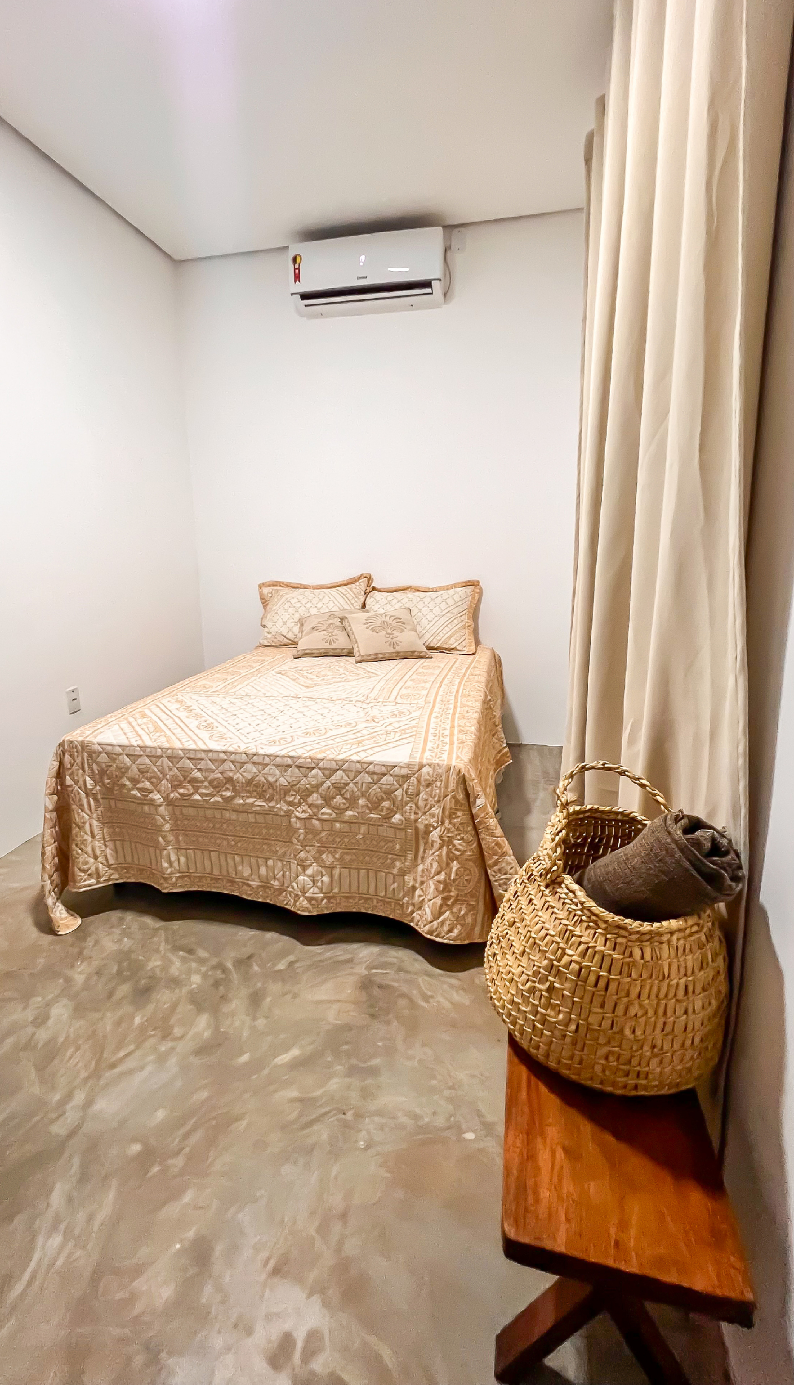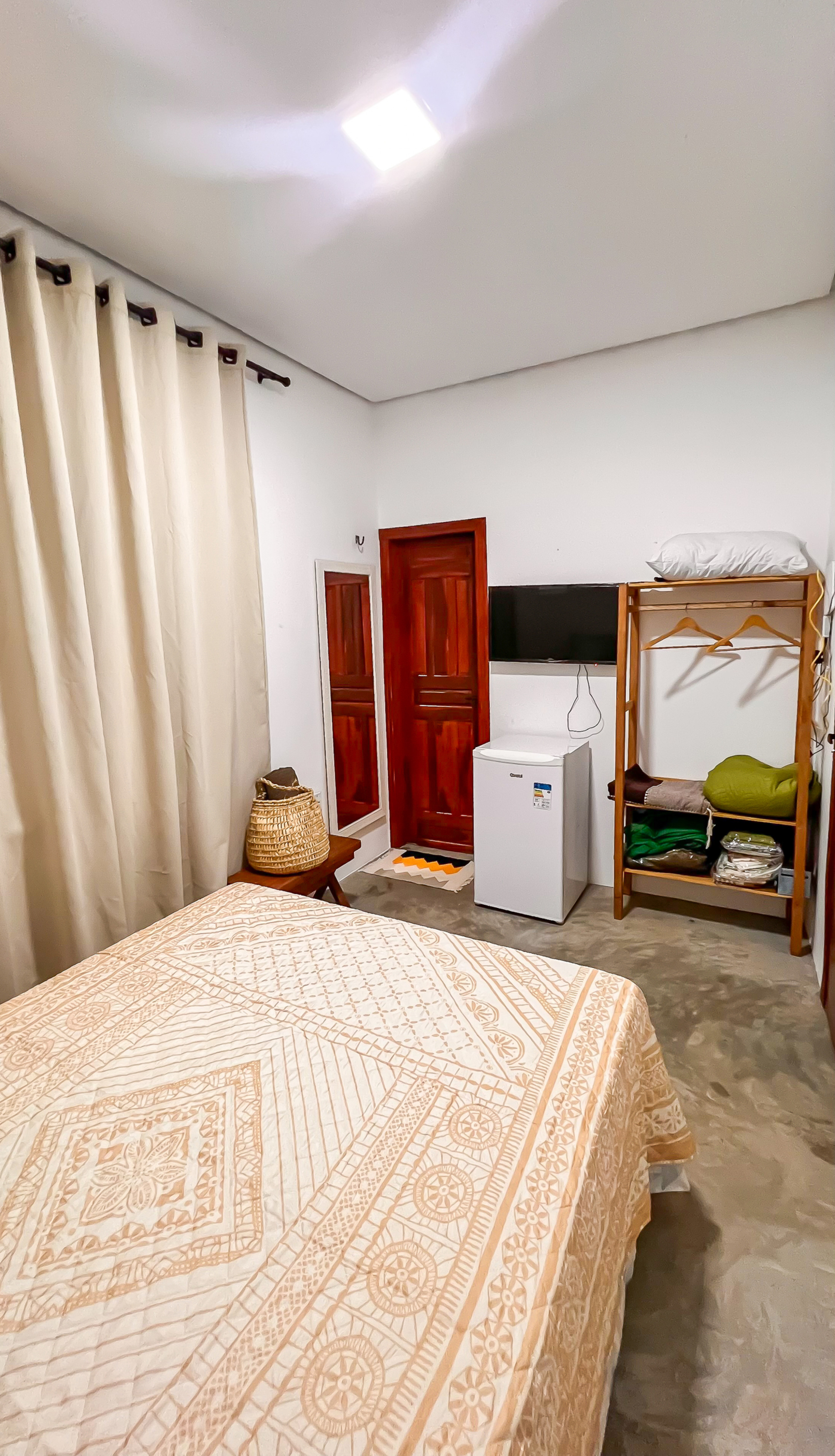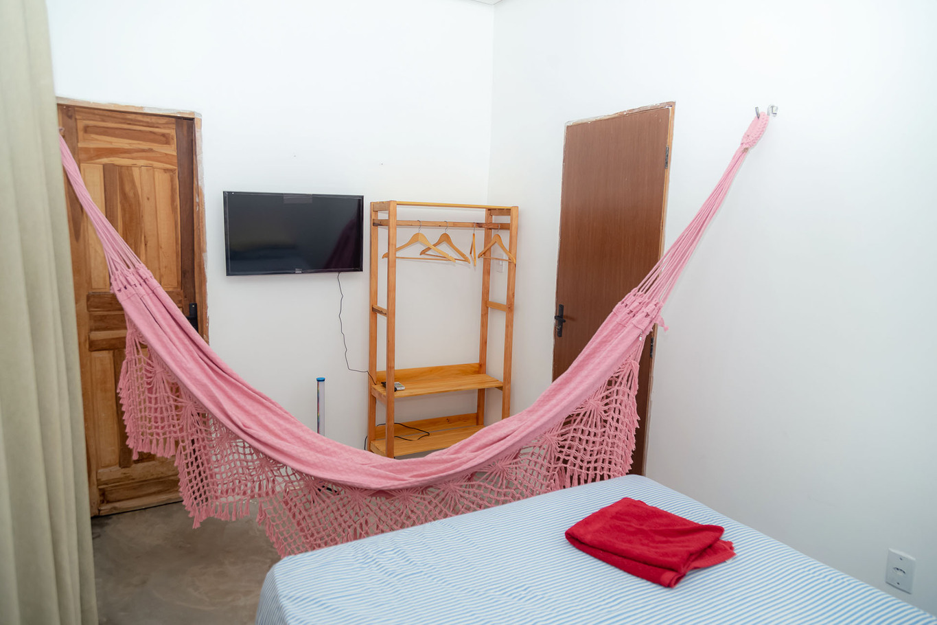 - A suíte conta com 1 cama de casal, 2 redes de descanso, edredom / cobertor e chuveiro