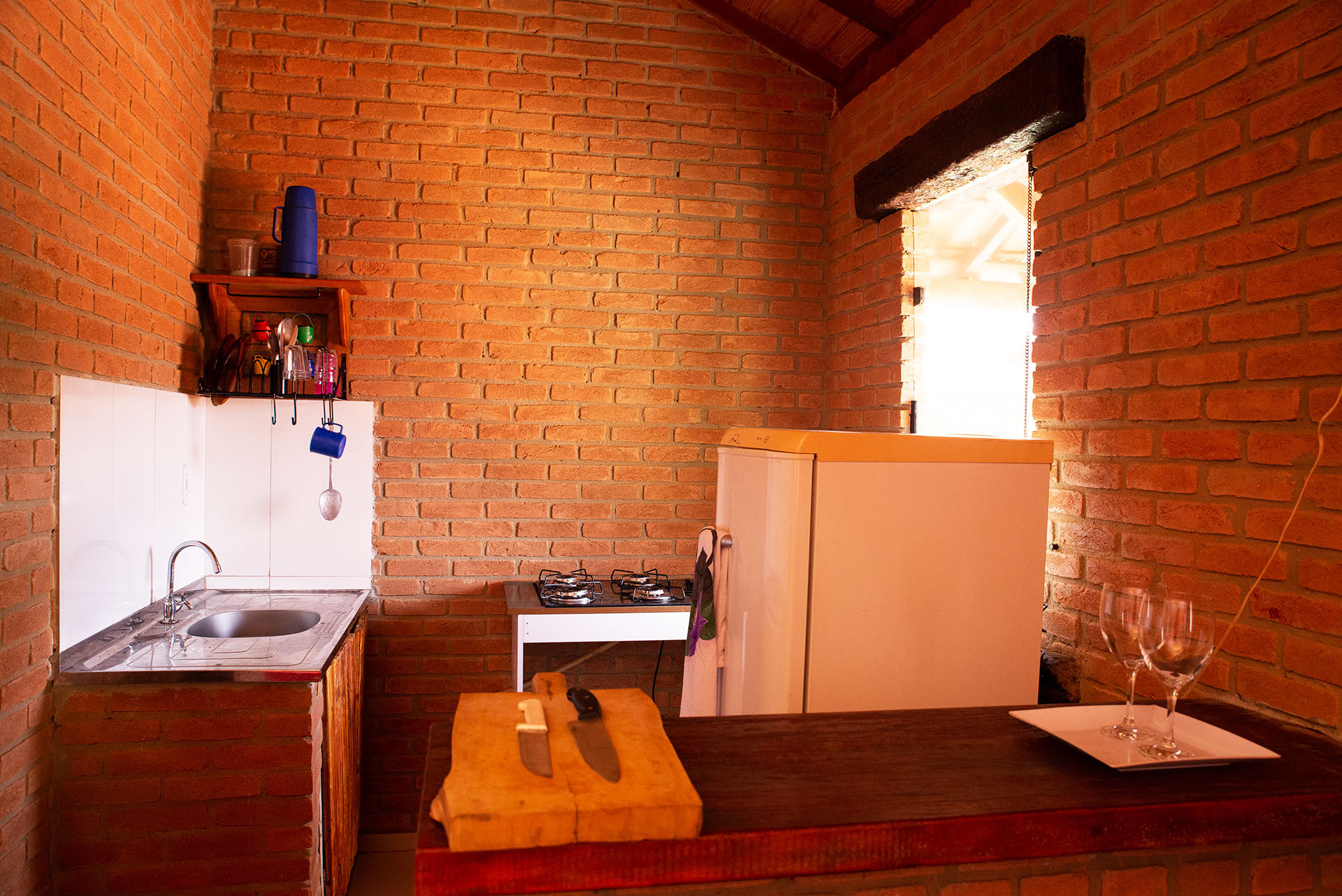 - Cozinha equipada com todos os utensílios necessários para realizar suas refeições, incluindo fogão, geladeira, liquidificador e um balcão