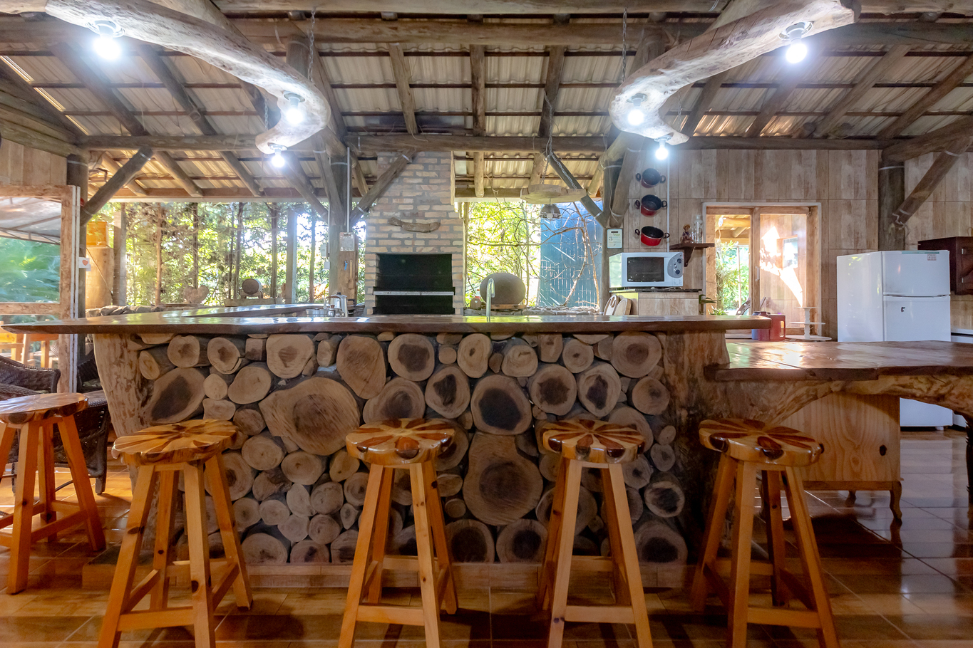 - A cozinha é separada do imóvel, localizada no espaço de eventos. Ela é equipada com diversos utensílios, incluindo cafeteira de cápsula, chaleira elétrica, fogão, geladeira e chaleira (exceto sal, pimenta e óleo)