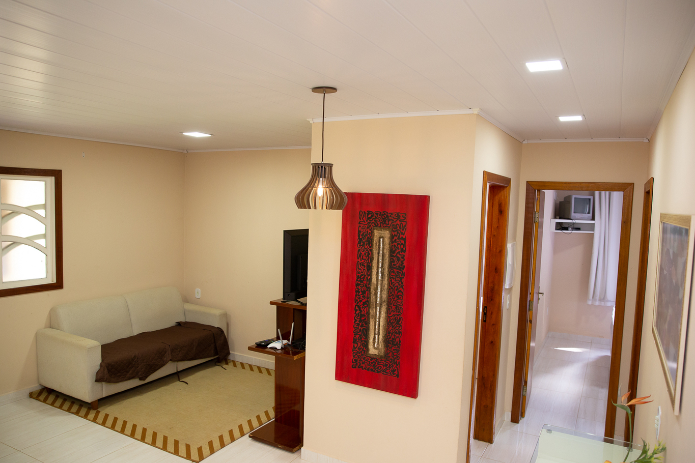 - Quarto 1(suíte): 2 camas de casal, ar-condicionado, smart TV, armário e banheiro privativo com box de vidro e chuveiro elétrico