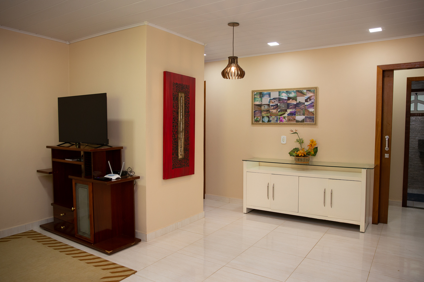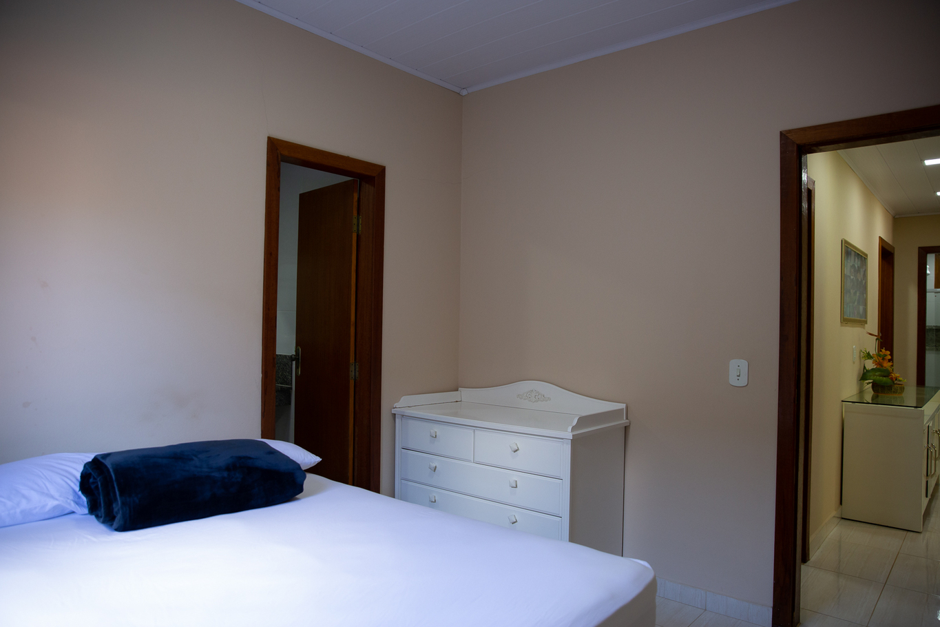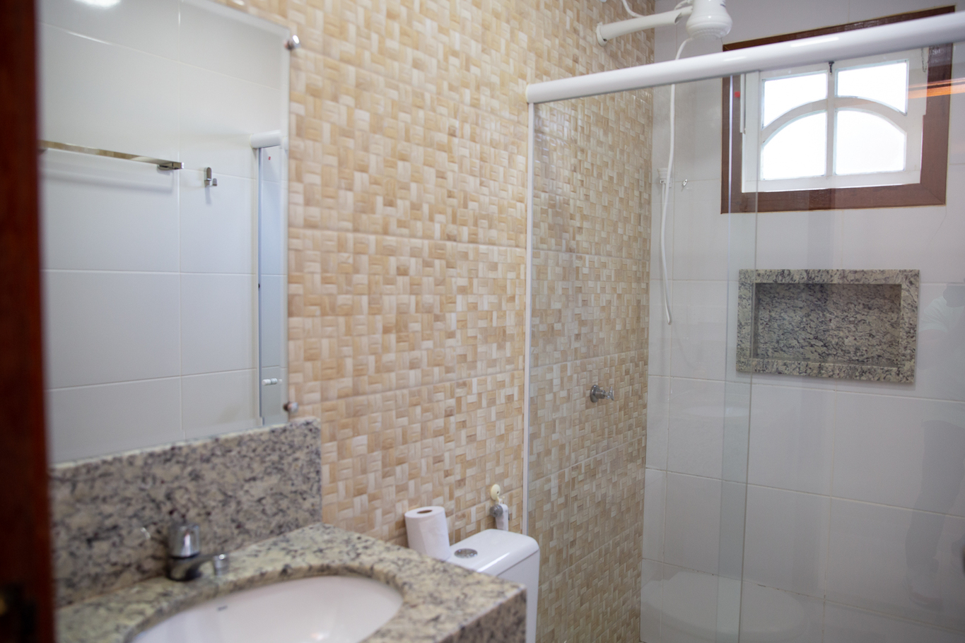 - Quarto 3(suíte): 1 cama de casal, ar-condicionado, smart TV, armário e banheiro privativo com box de vidro e chuveiro elétrico