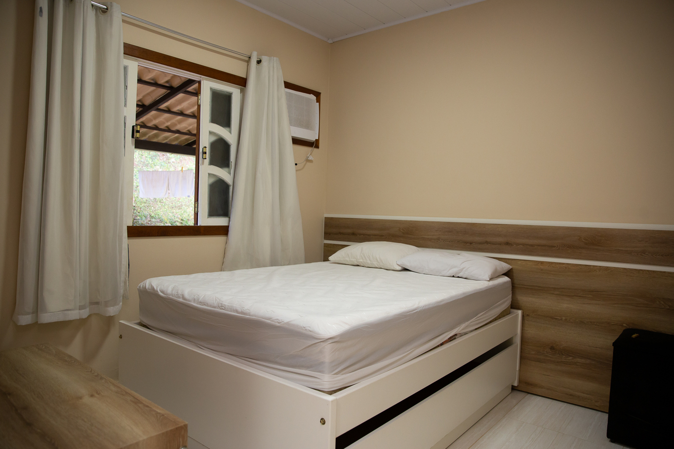 - Quarto 2(suíte): 1 cama de casal, ar-condicionado, smart TV, armário e banheiro privativo com box de vidro e chuveiro elétrico