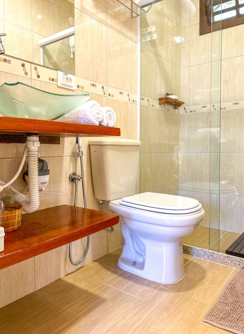 - Banheiro equipado c/ chuveiro elétrico, box blindex e secador de cabelo