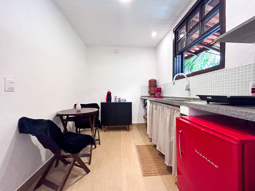 - Cozinha com todos os utensílios para preparar deliciosos pratos, incluindo cafeteira, placa de indução, mini forno, frigobar com refrigerantes, água e cervejas e micro-ondas