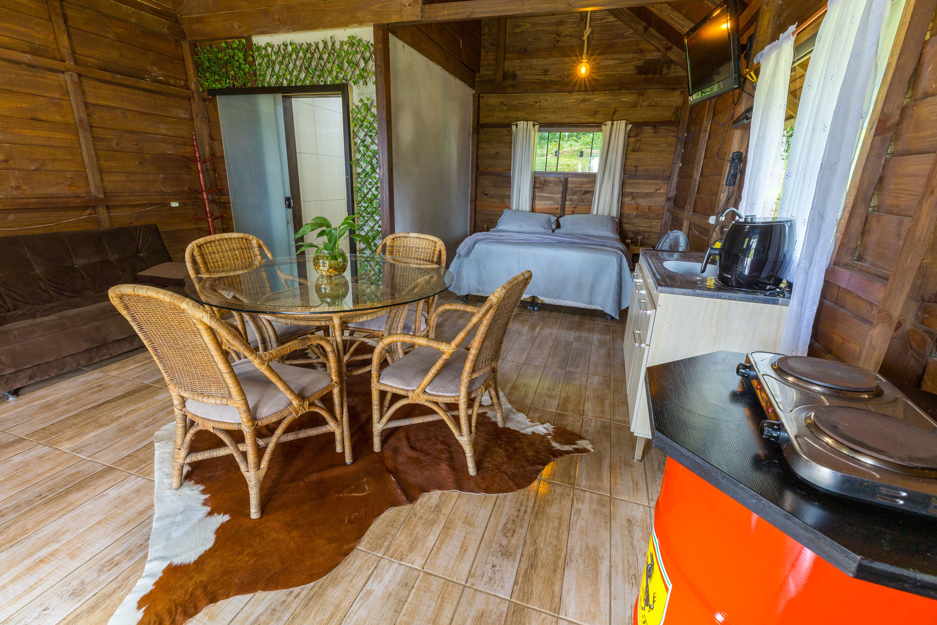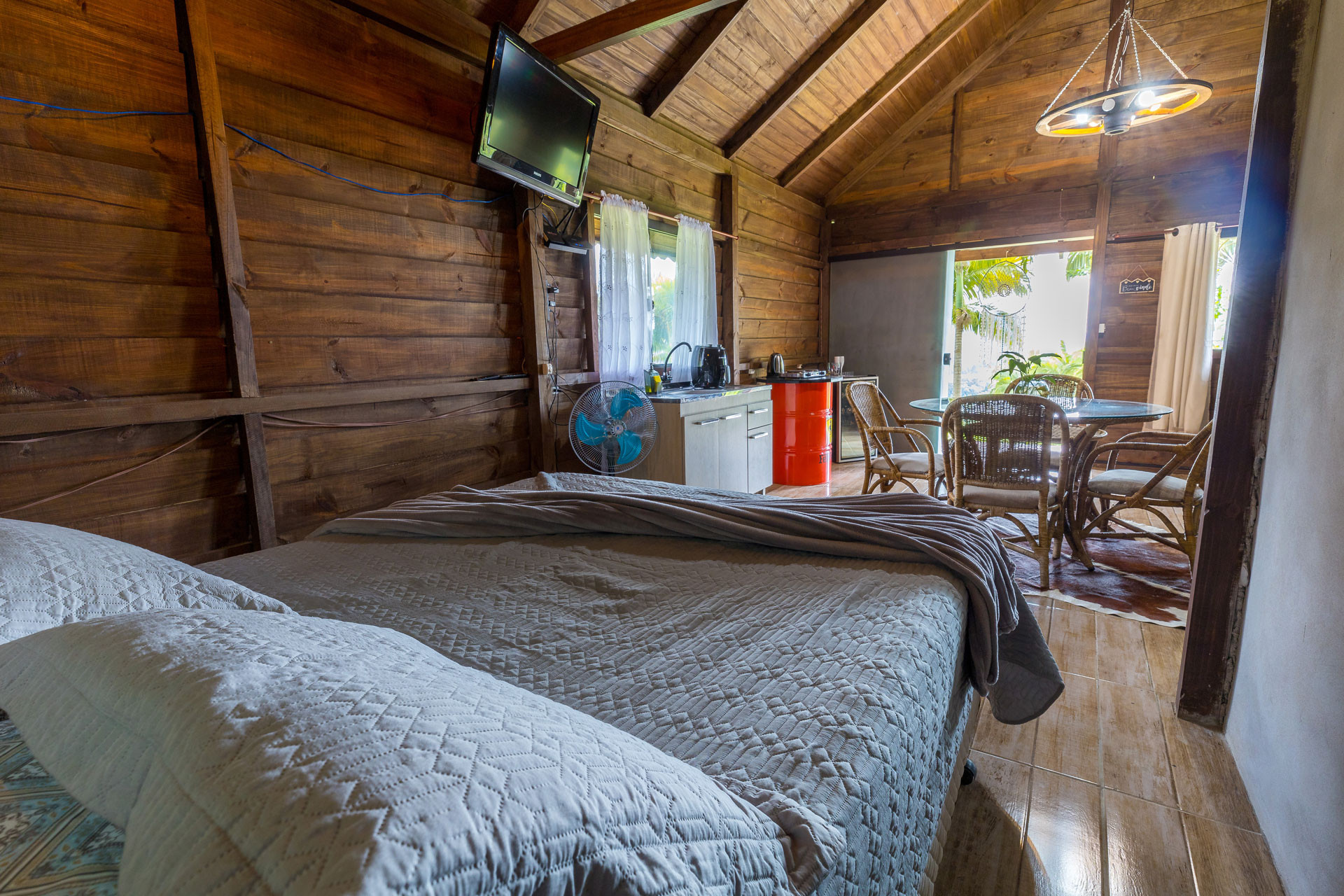 - No quarto há 1 cama queen size, 1 colchão extra de casal, edredom / cobertor, protetor de colchão e tv