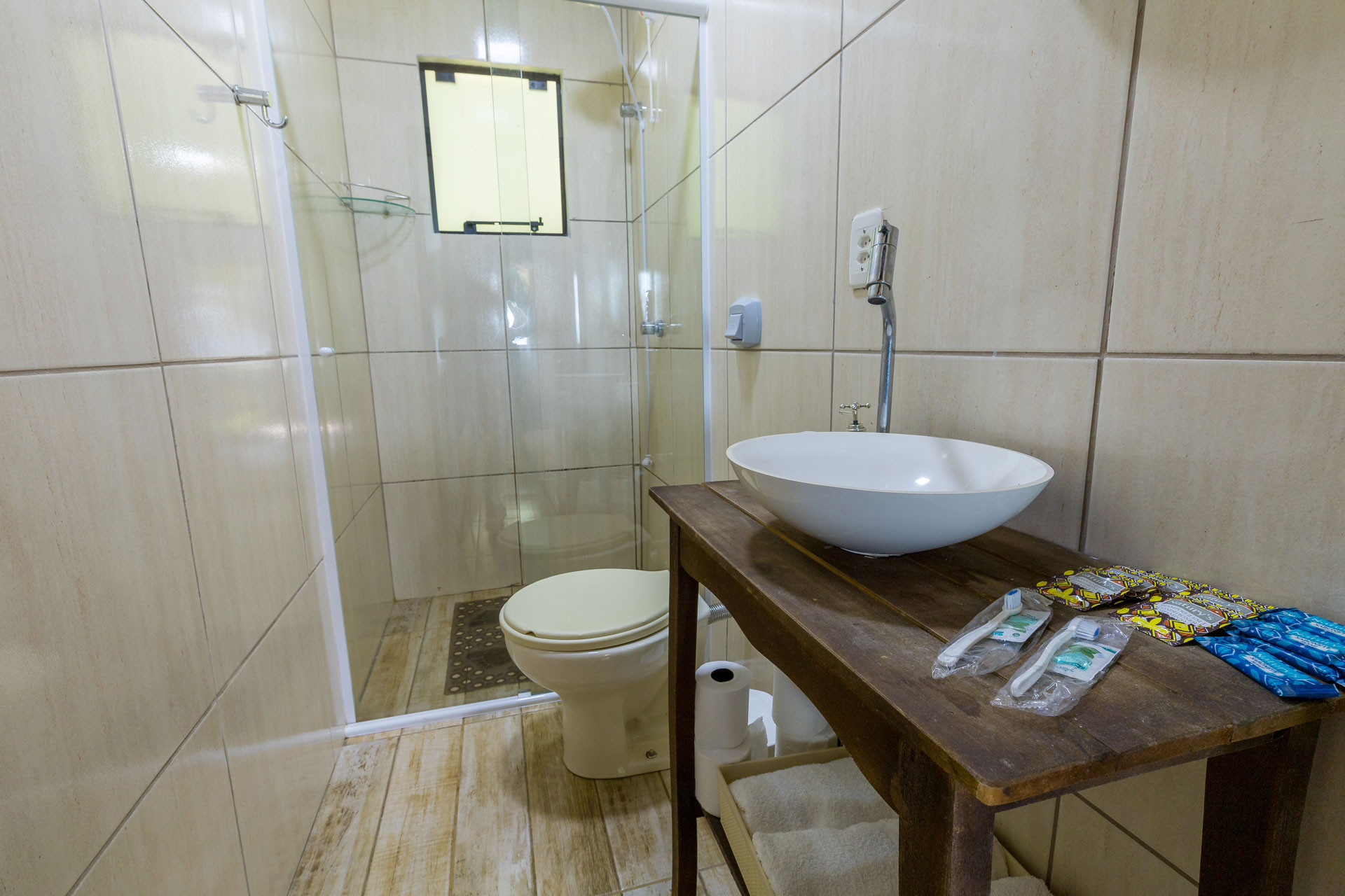 - O banheiro possui chuveiro elétrico, box de vidro/acrílico e secador de cabelo