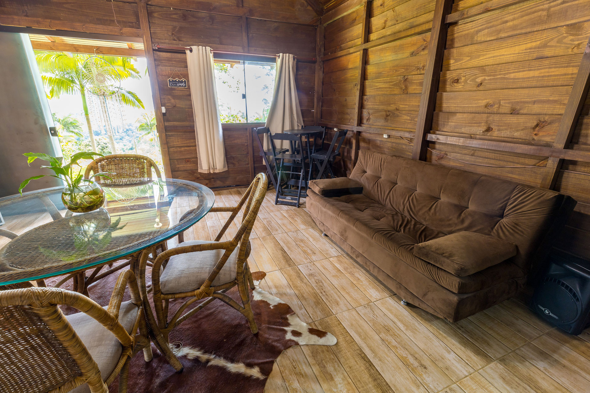 - Na sala você encontra cadeira, sistema de som e sofá-cama