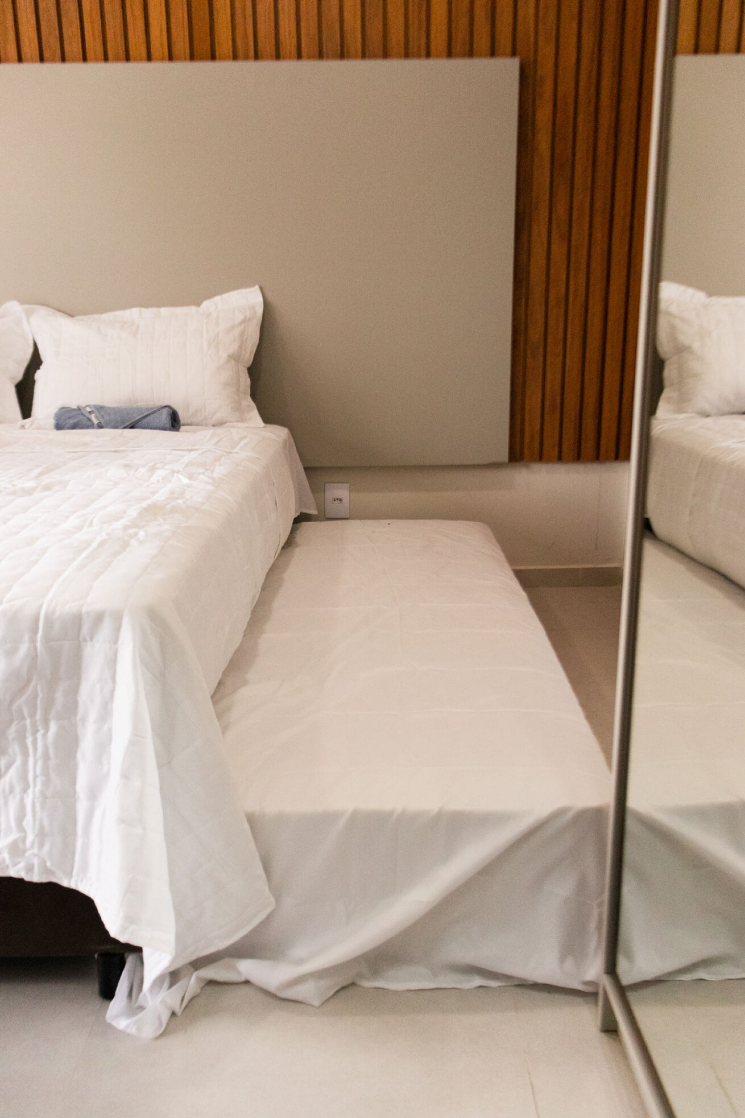 - No quarto 2 há 1 cama queen size e 2 camas auxiliares de solteiro