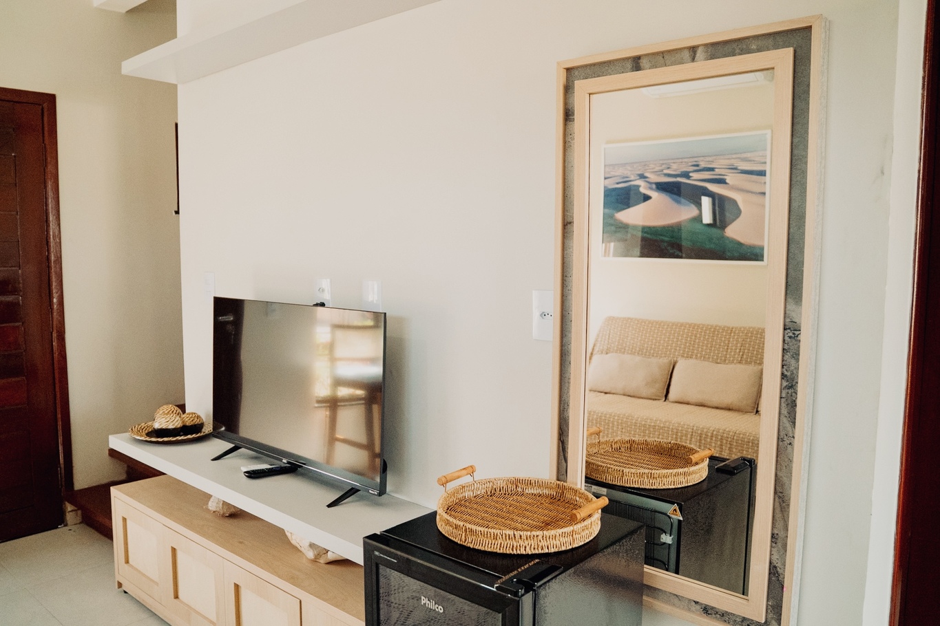 - Sala de Estar ampla e confortável, com mesa de jantar, cervejeira, bancos, espelho, sofá-cama, Smart TV e TV a cabo