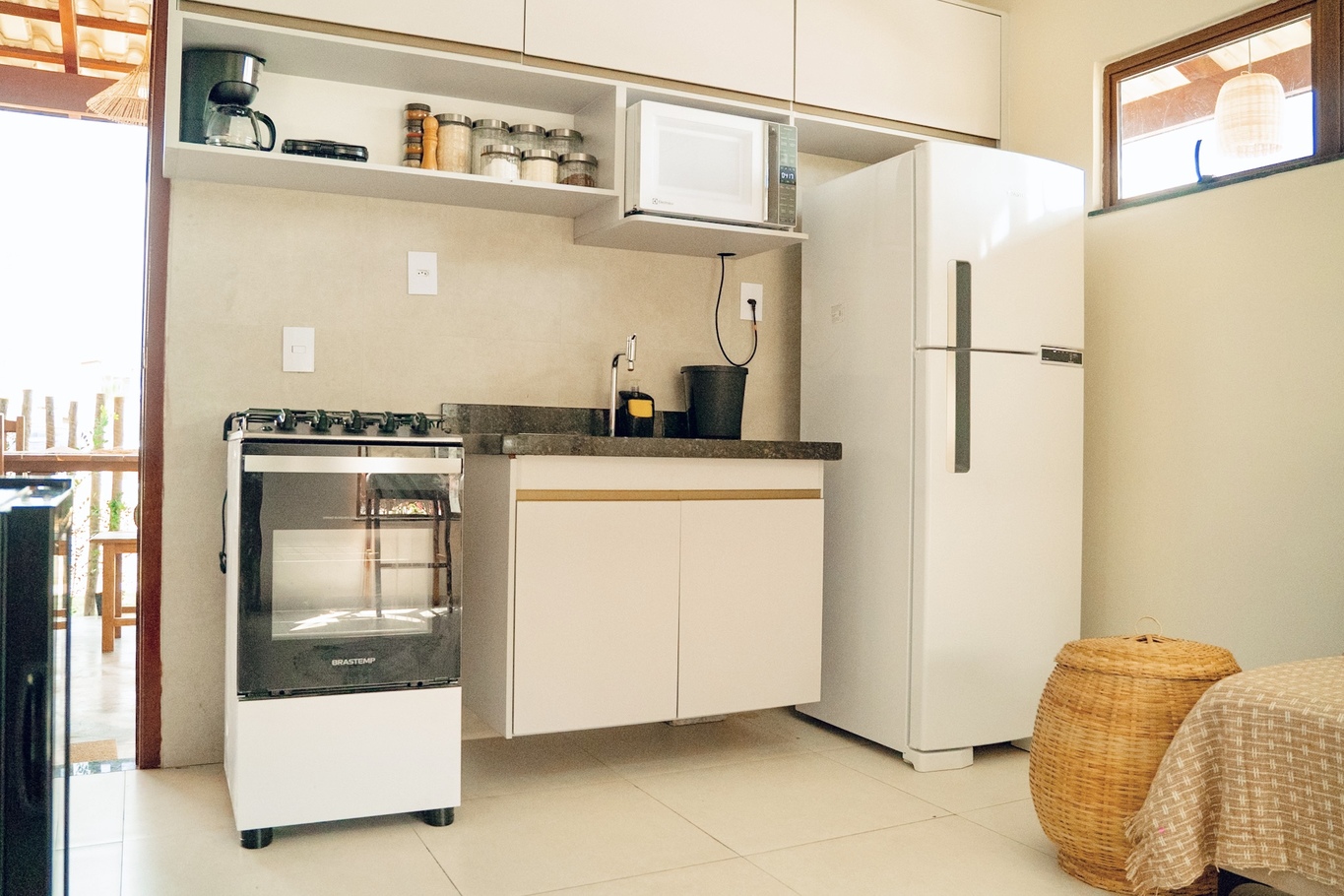 - Cozinha Equipada com pratos, copos, talheres, panelas, cafeteira, freezer, fritadeira, fogão, forno, geladeira, liquidificador, microondas, chaleira e utensílios de cozinha(exceto óleo e sal)