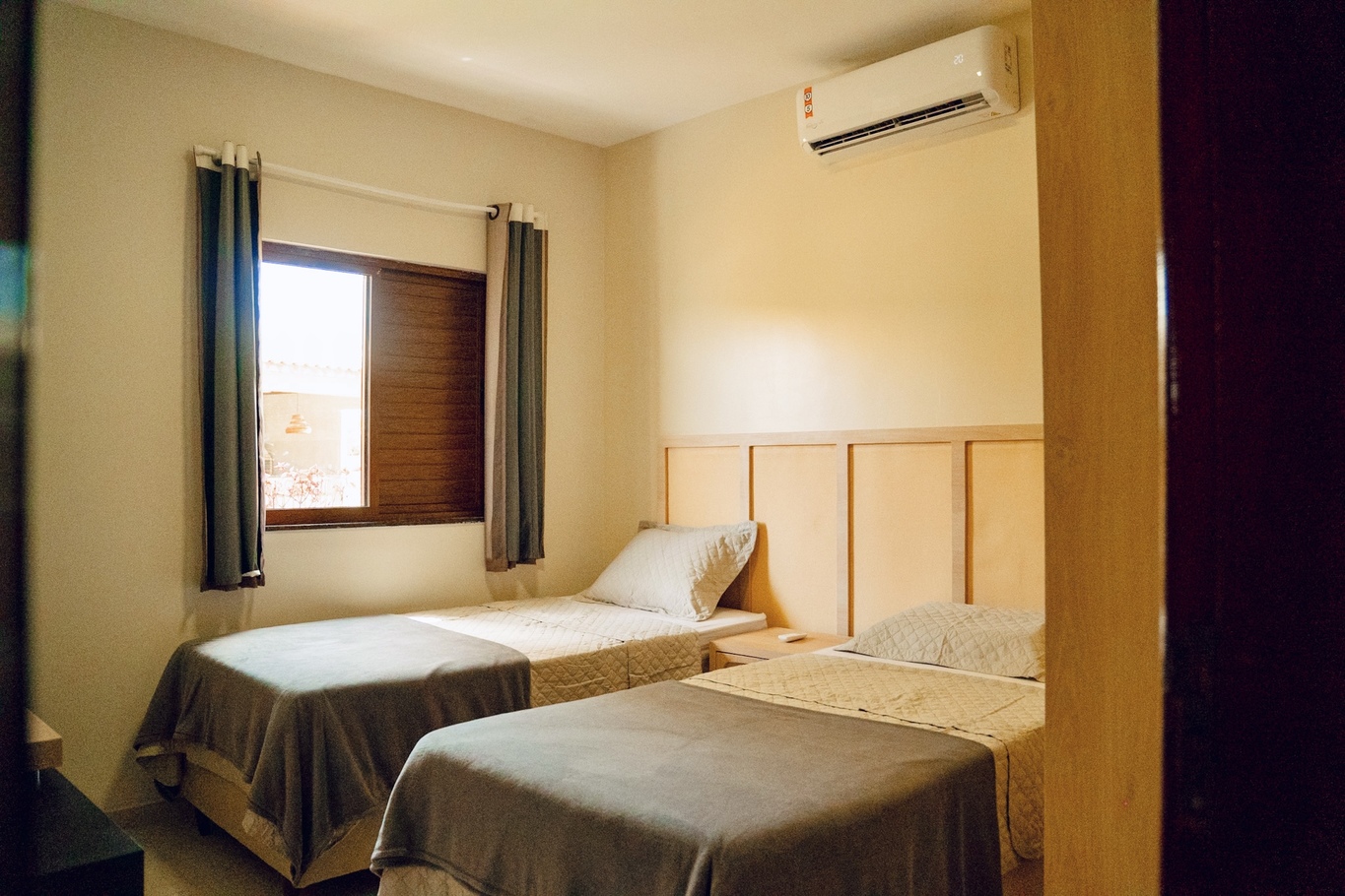 - Quarto 3: 2 camas de solteiro, ar-condicionado, armário, edredom/cobertor e cortina blackout para um sono tranquilo