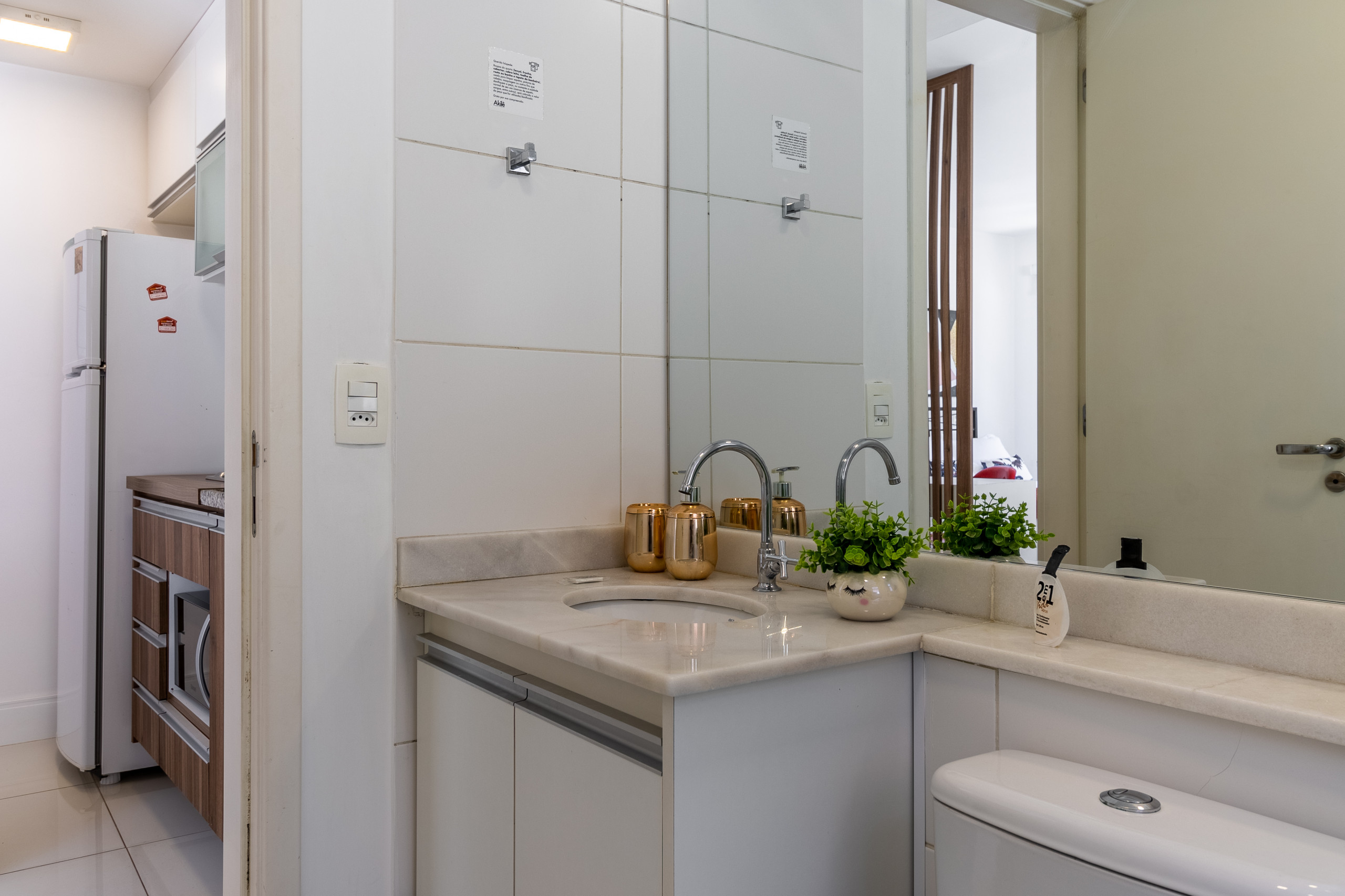 banheiro completo. Oferecemos 1 toalha de banho por hóspede, 1 toalha de rosto e 1 piso por apartamento (toalhas e piso extra solicitados durante a estadia tem custo adicional).