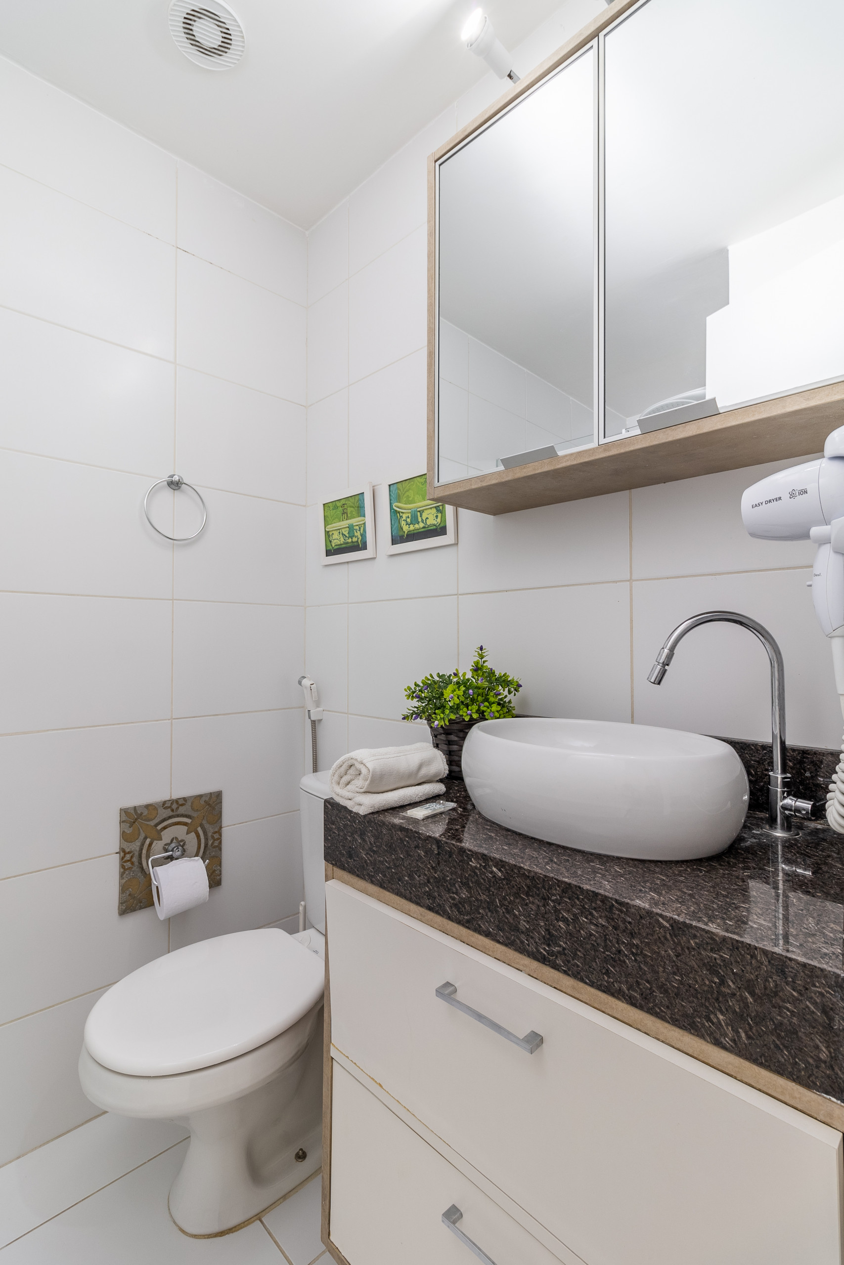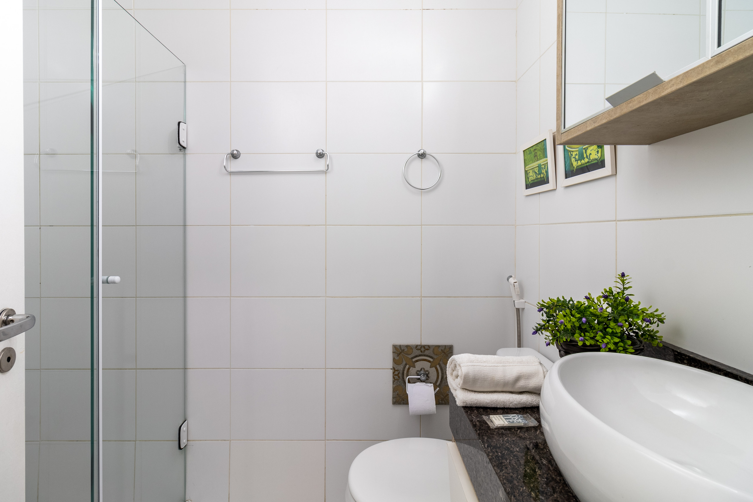 banheiro completo. Oferecemos 1 toalha de banho por hóspede, 1 toalha de rosto e 1 piso por apartamento (toalhas e piso extra solicitados durante a estadia tem custo adicional).