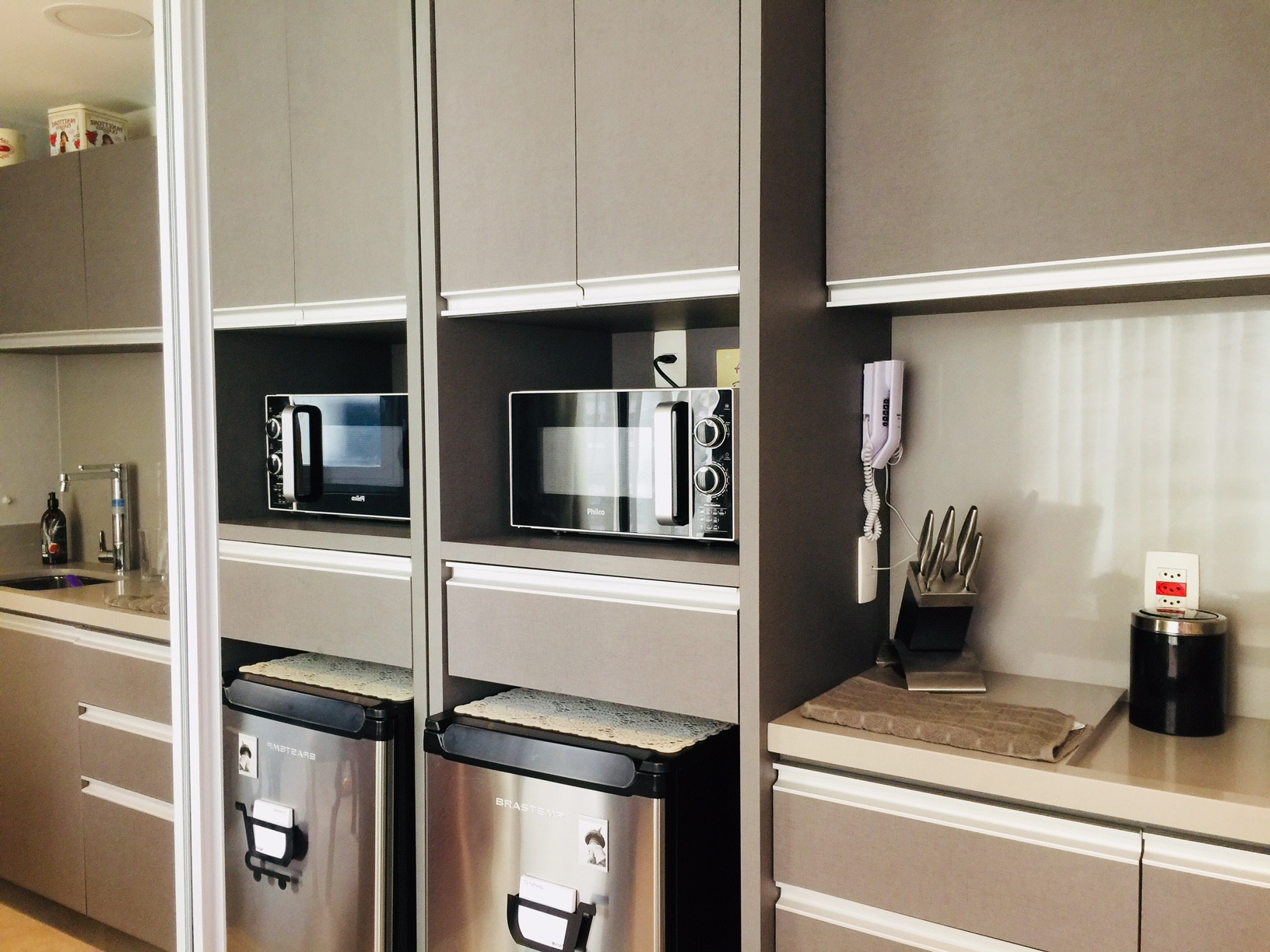 Fogão, refrigerador, cafeteira, micro-ondas, sanduicheira, torradeira e armários.