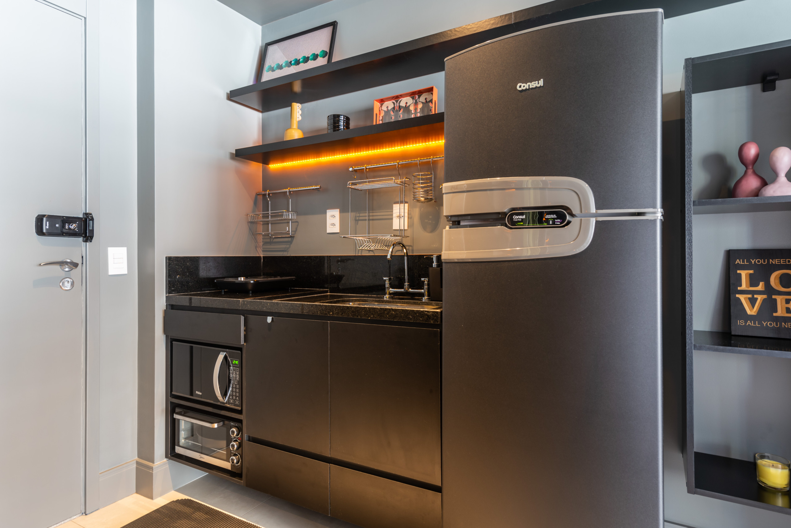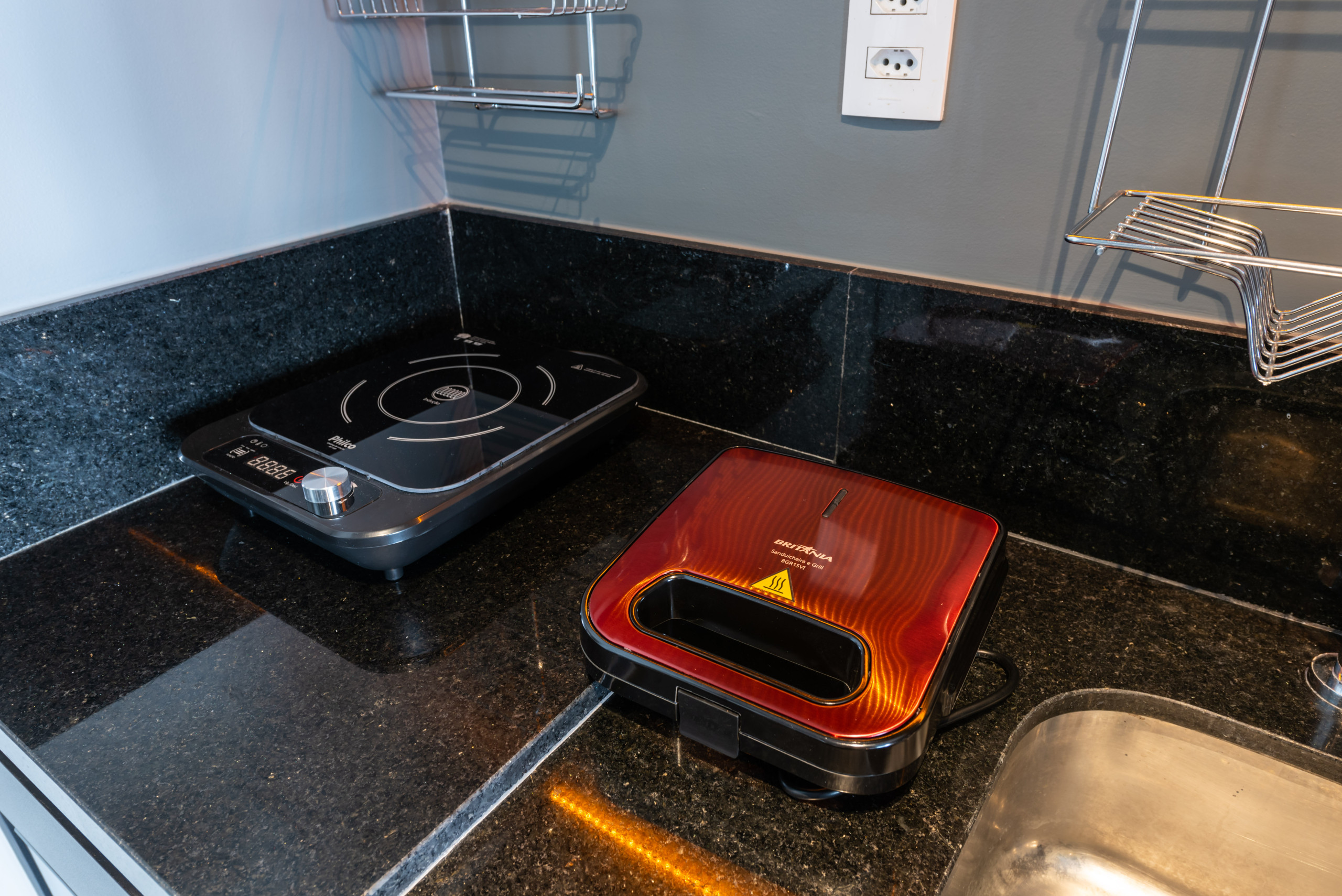 Cozinha equipada com cooktop, geladeira, cafeteira, sanduicheira e utensílios básicos.