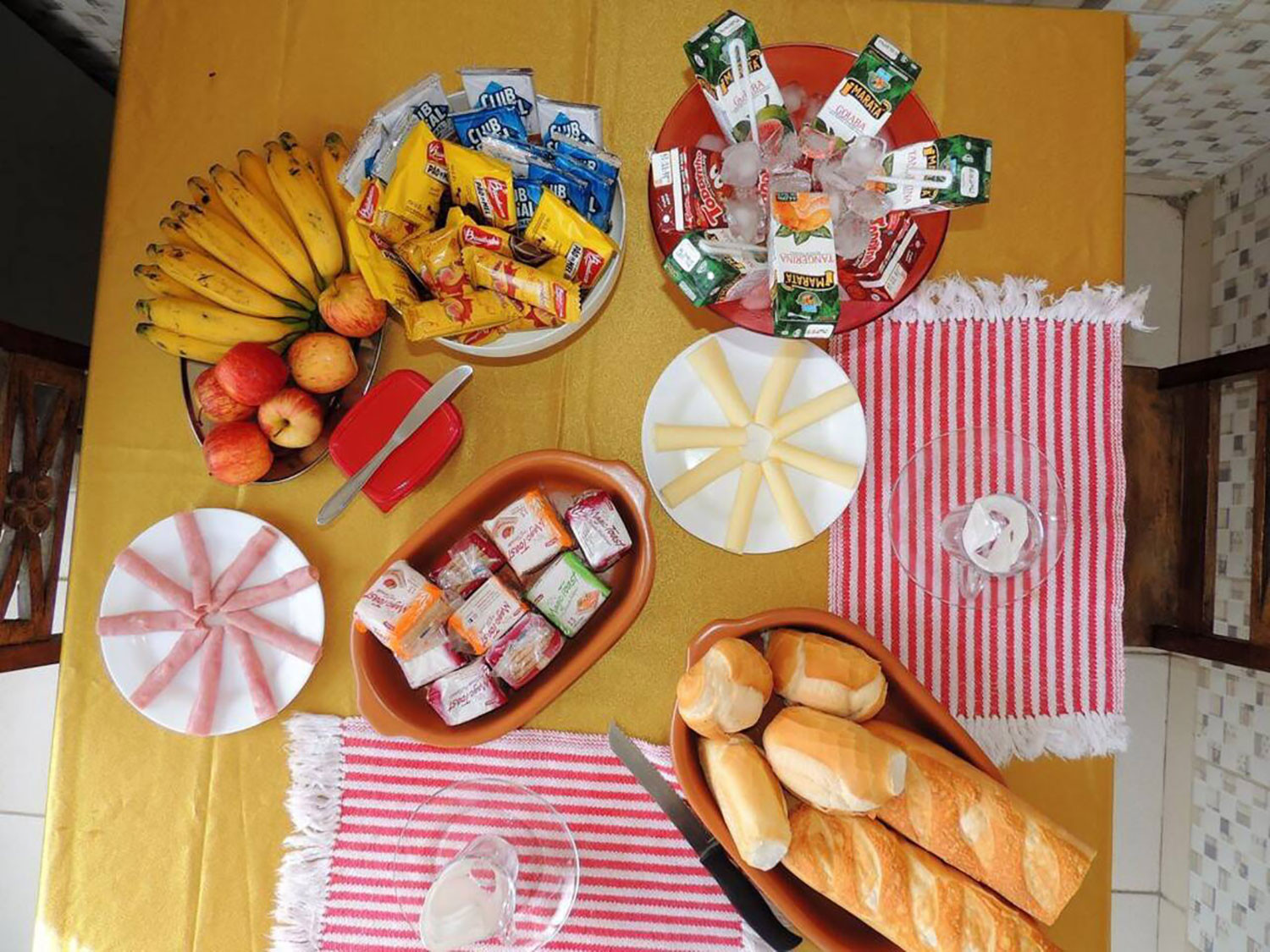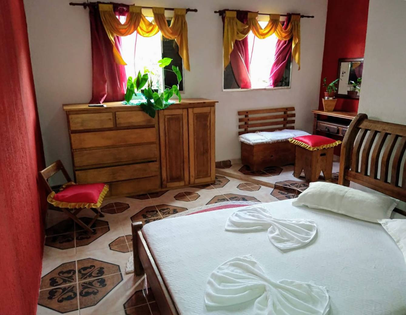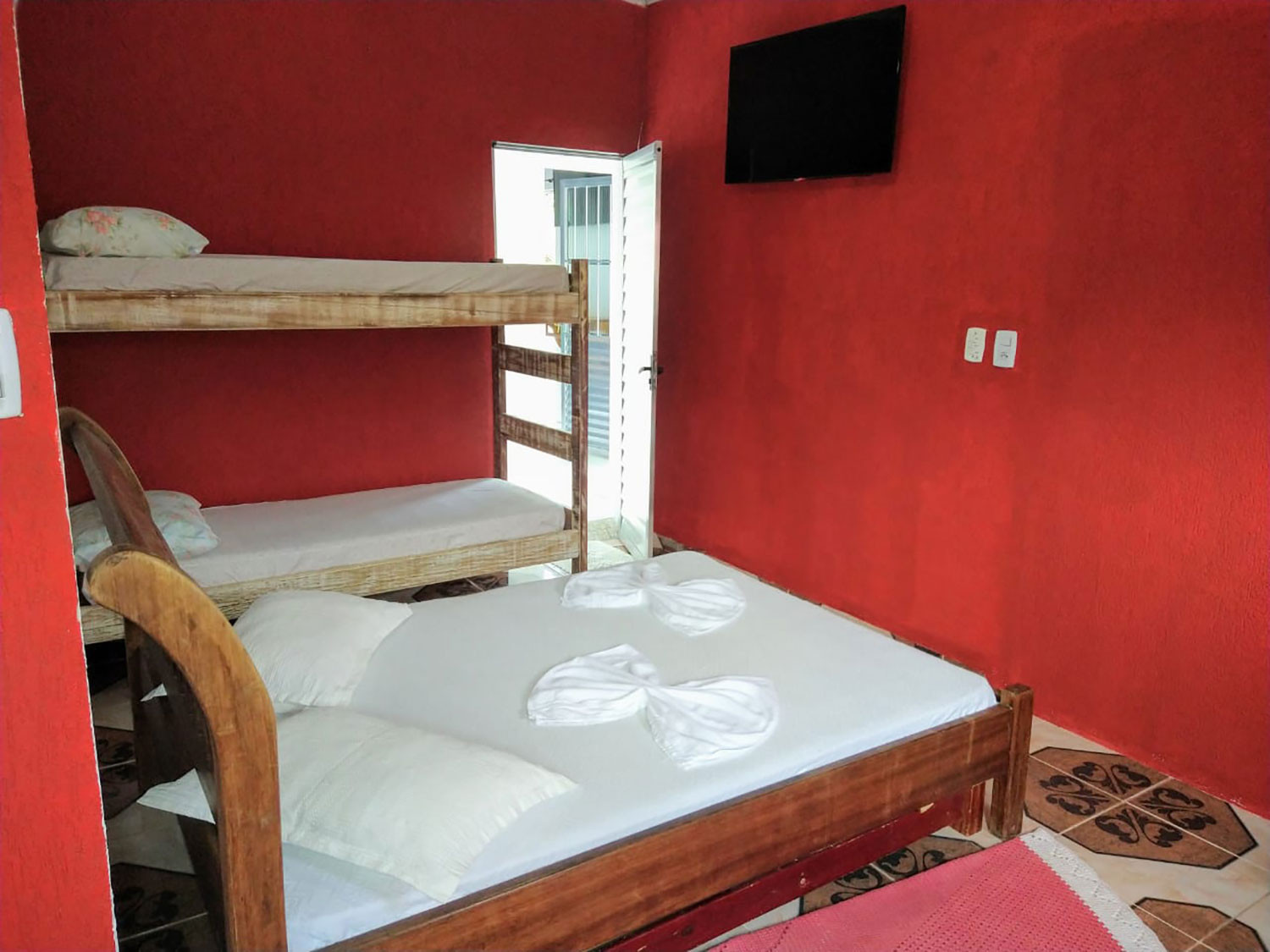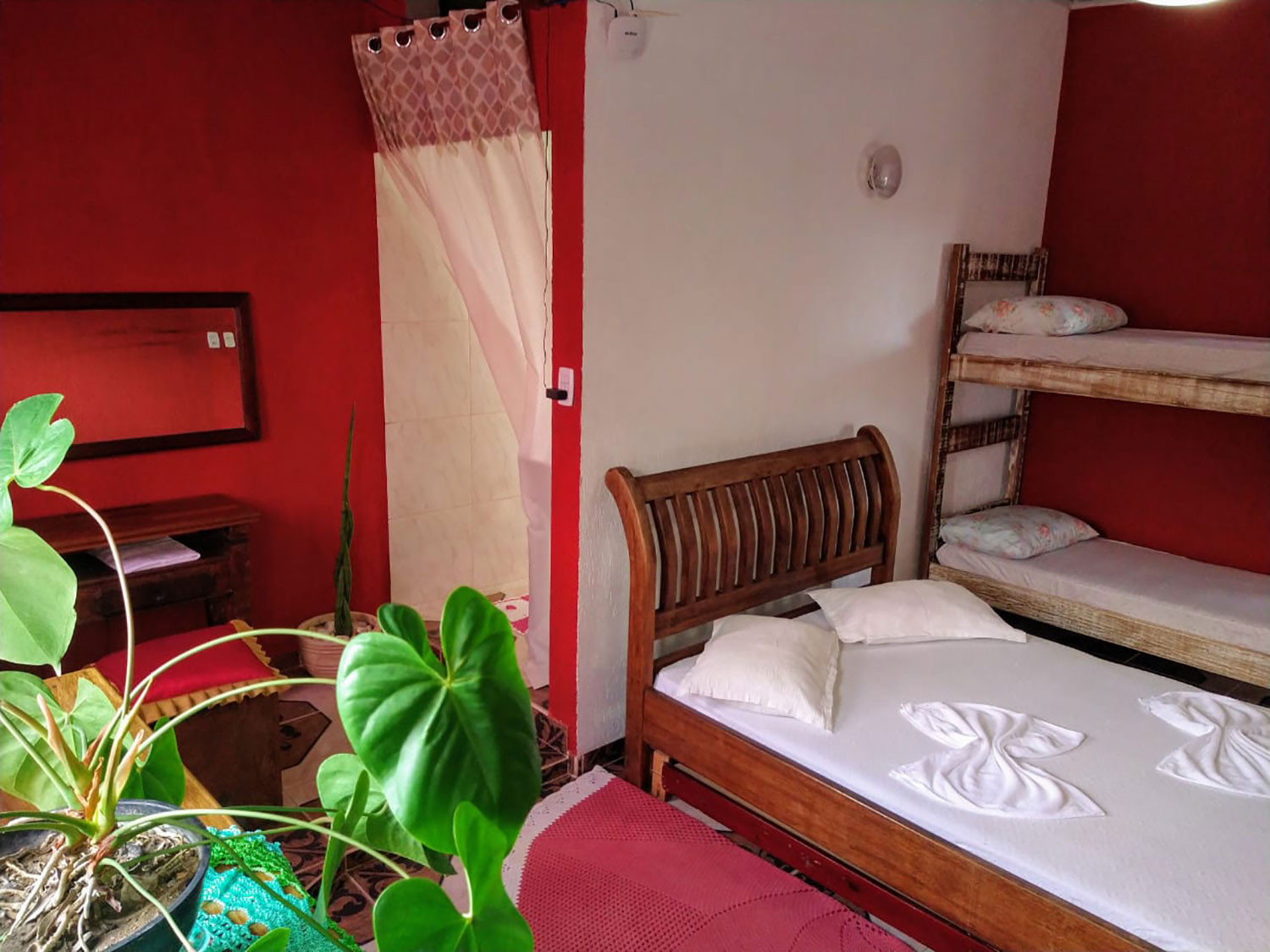 - Na suíte você encontra 1 cama de casal, 1 beliche, 1 sofá e 1 colchão extra, além de TV de tela plana, ventilador de teto, cômoda, aparador, espelho e janela com cortina.
