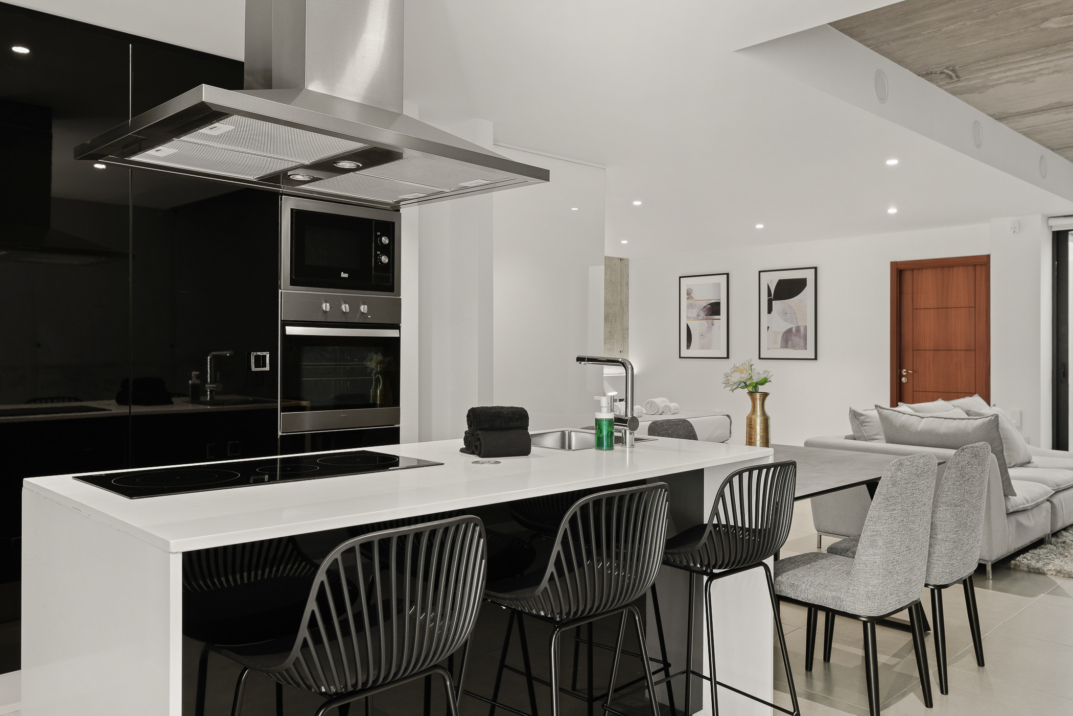A cozinha americana, de vitrocerâmica, está equipada com geladeira, micro-ondas, forno, congelador, máquina de lavar louça, louça/talheres, utensílios/cozinha, cafeteira, torradeira, jarro elétrico e liquidificador.