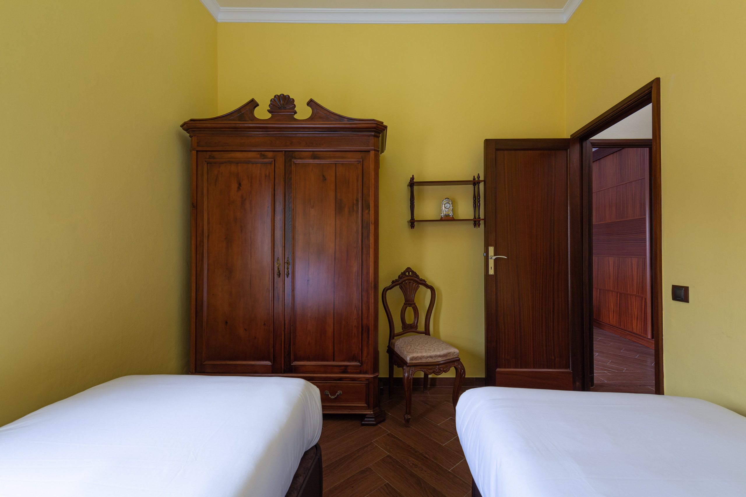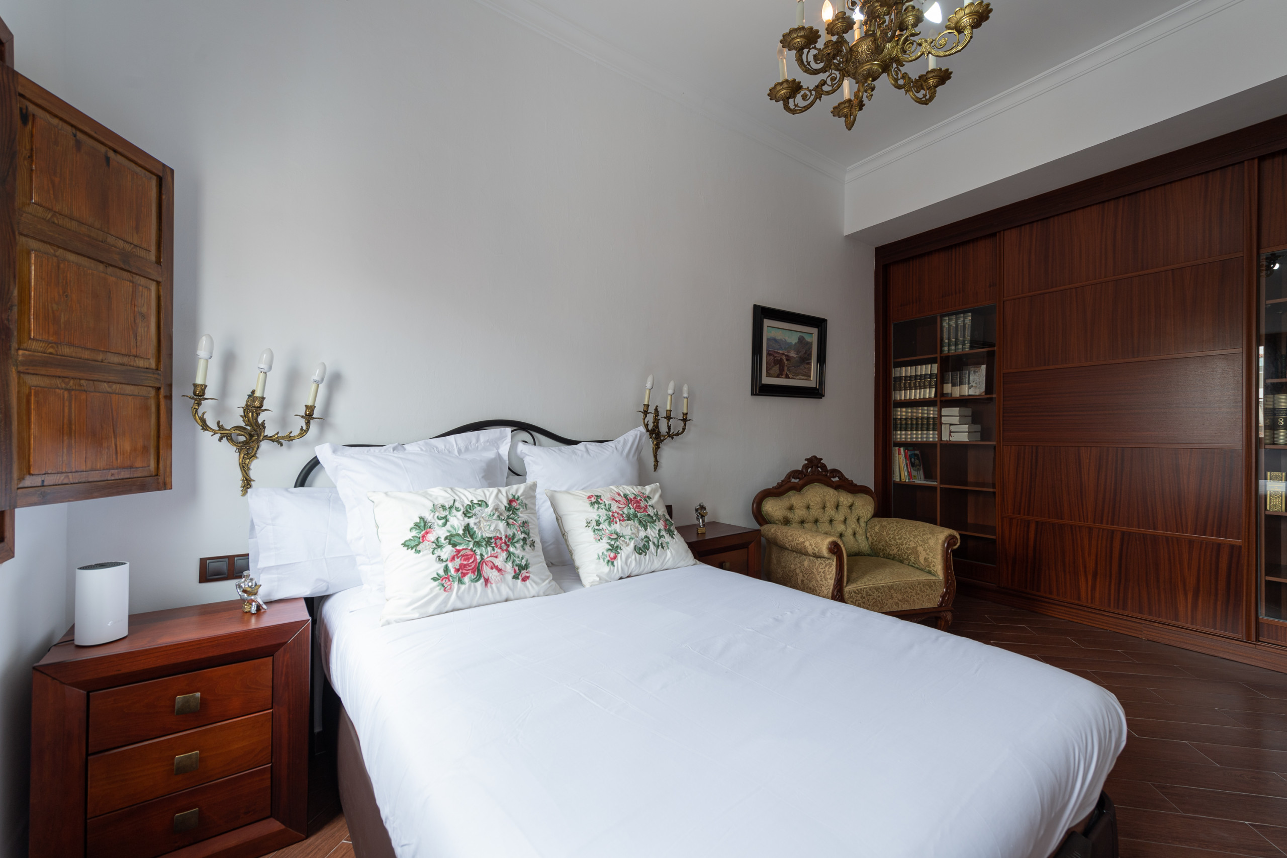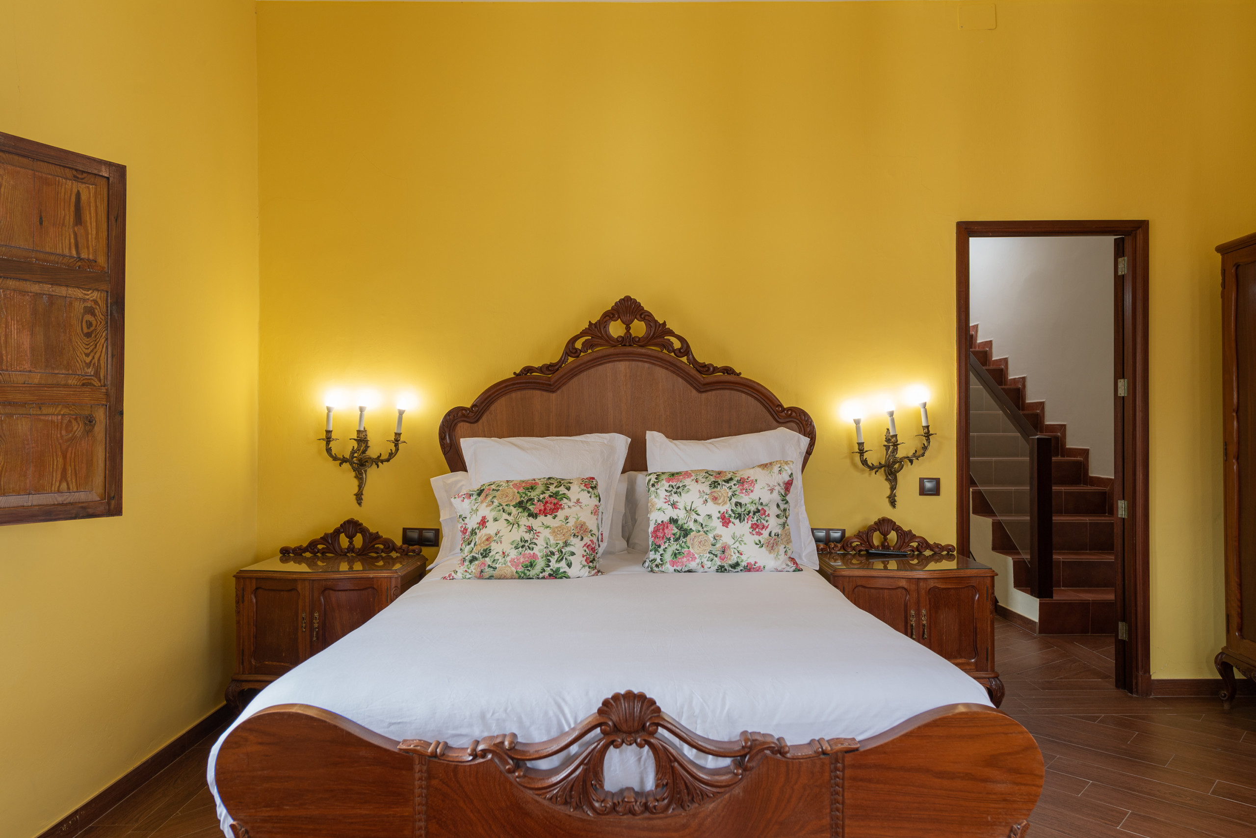 The main bedroom, with a double bed, decorated in an elegant colonial style, with plenty of natural light and a small balcony with charming views.