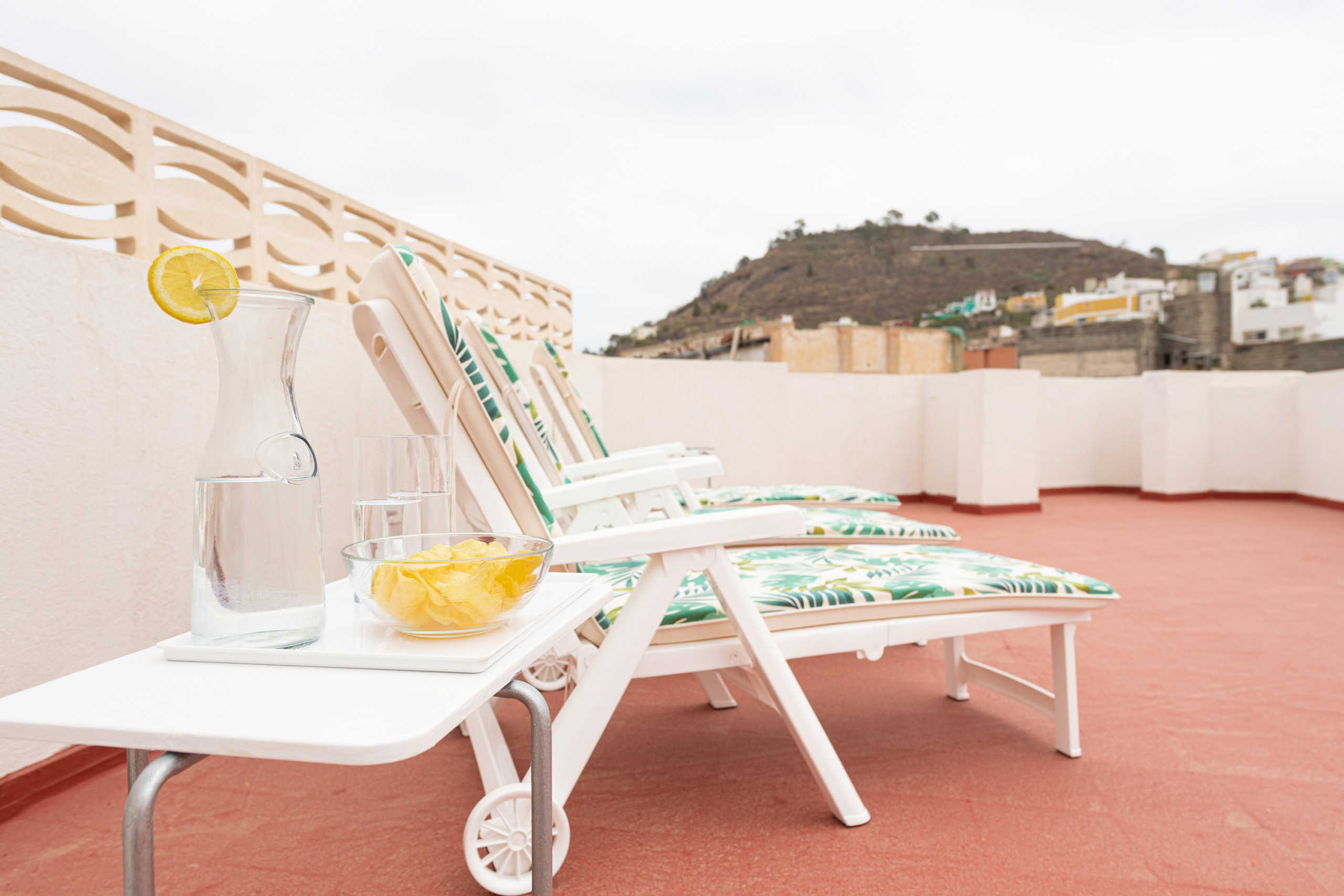 A spectacular private terrace equipped with hammocks, where you can relax while enjoying impressive panoramic views of the Cathedral, the mountains and the city of Arucas.