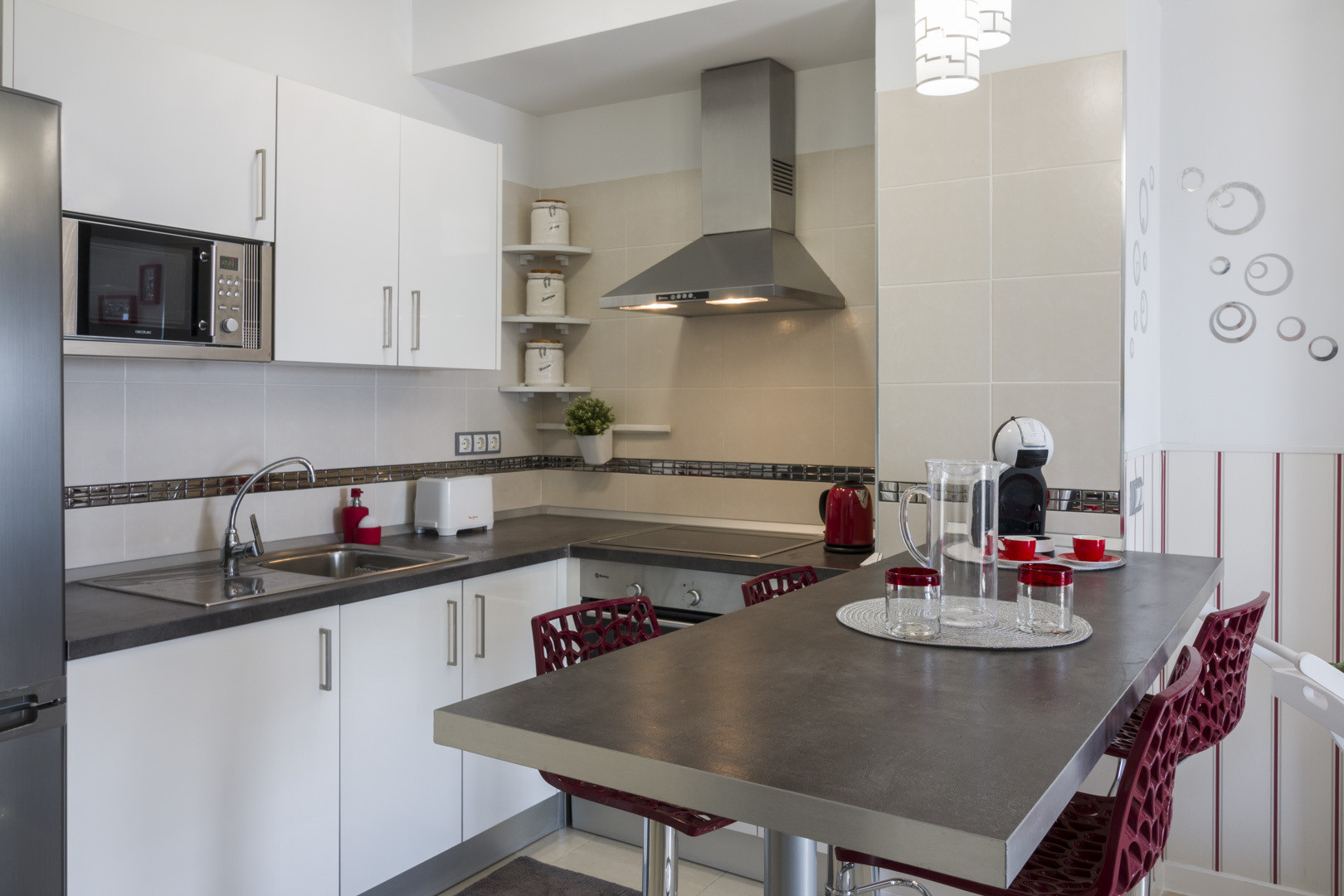 - 1 open-plan kitchen with ceramic hob, equipped with fridge, microwave, oven, freezer, washing machine, crockery/cutlery, kitchen utensils, coffee maker and toaster.