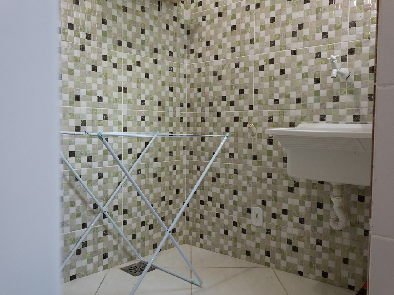 - Cozinha ampla e equipada com fogão, geladeira duplex, liquidificador, micro-ondas, filtro d’água, panelas, louça e utensílios variados