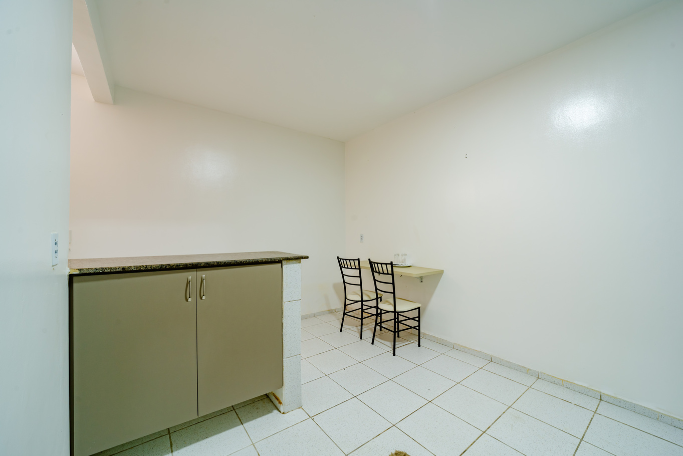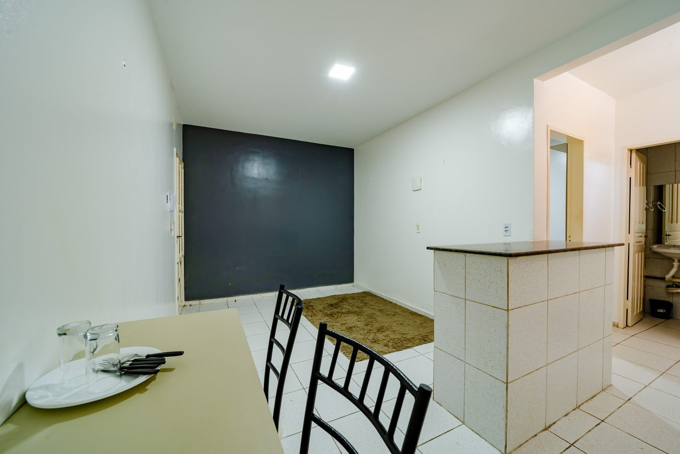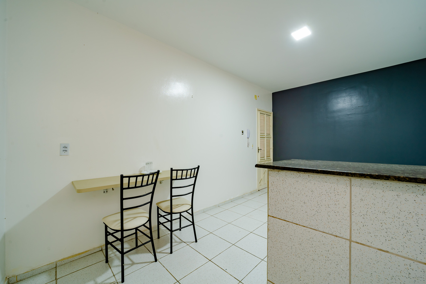 - Living room with multifunctional counter for meals and work