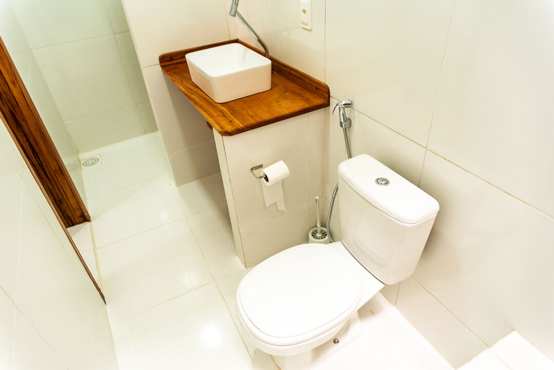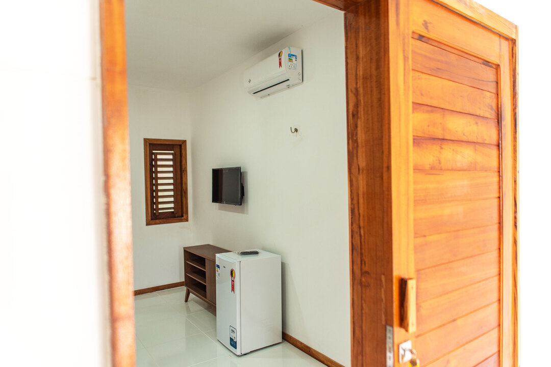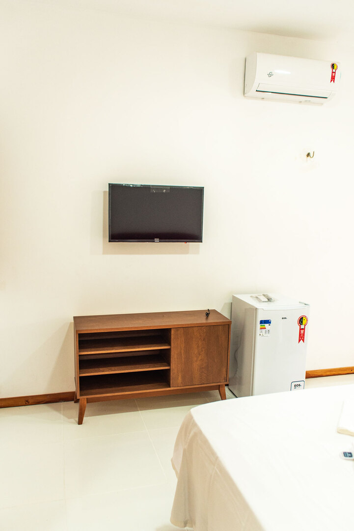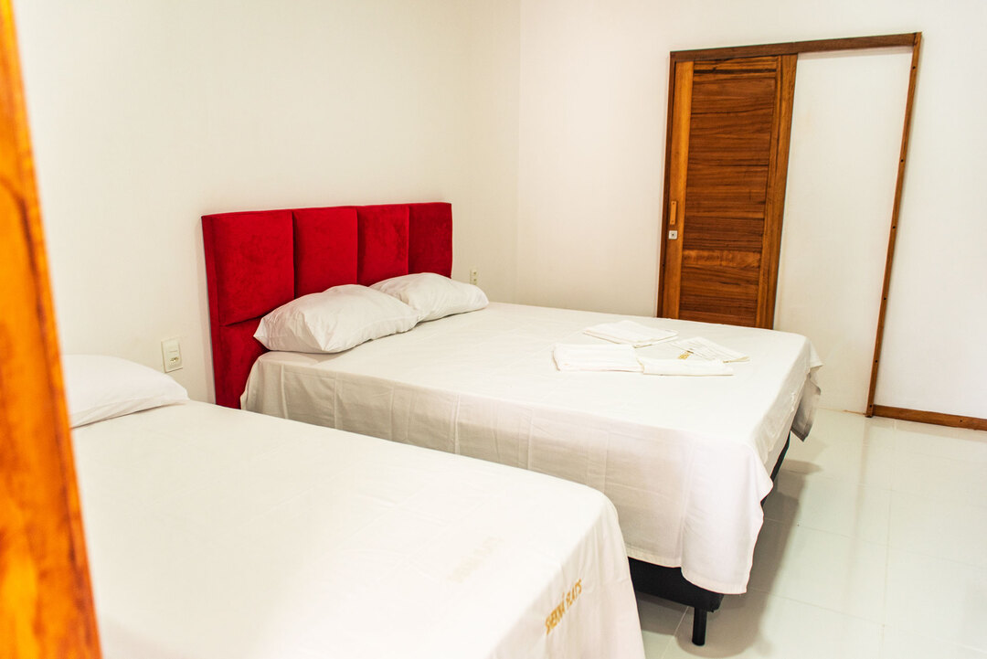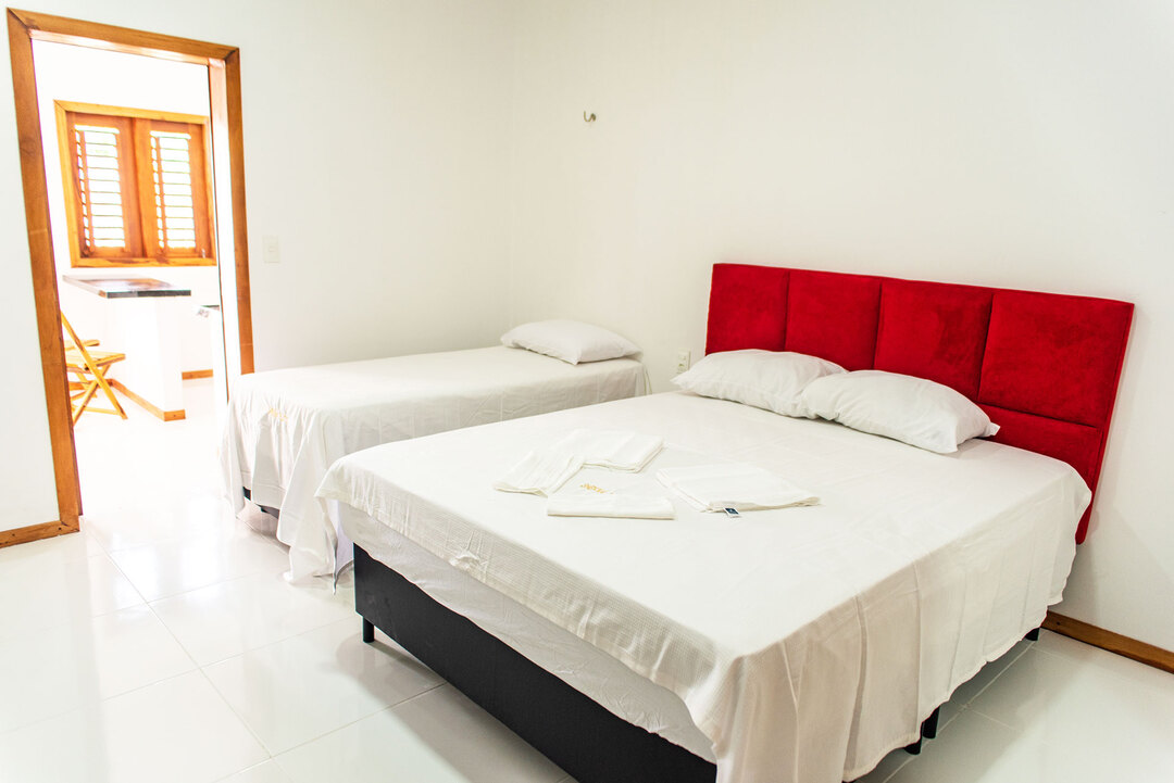 - Na suíte há 1 cama queen size, 1 cama de solteiro, frigobar, armário, chuveiro frio e box de revestimento