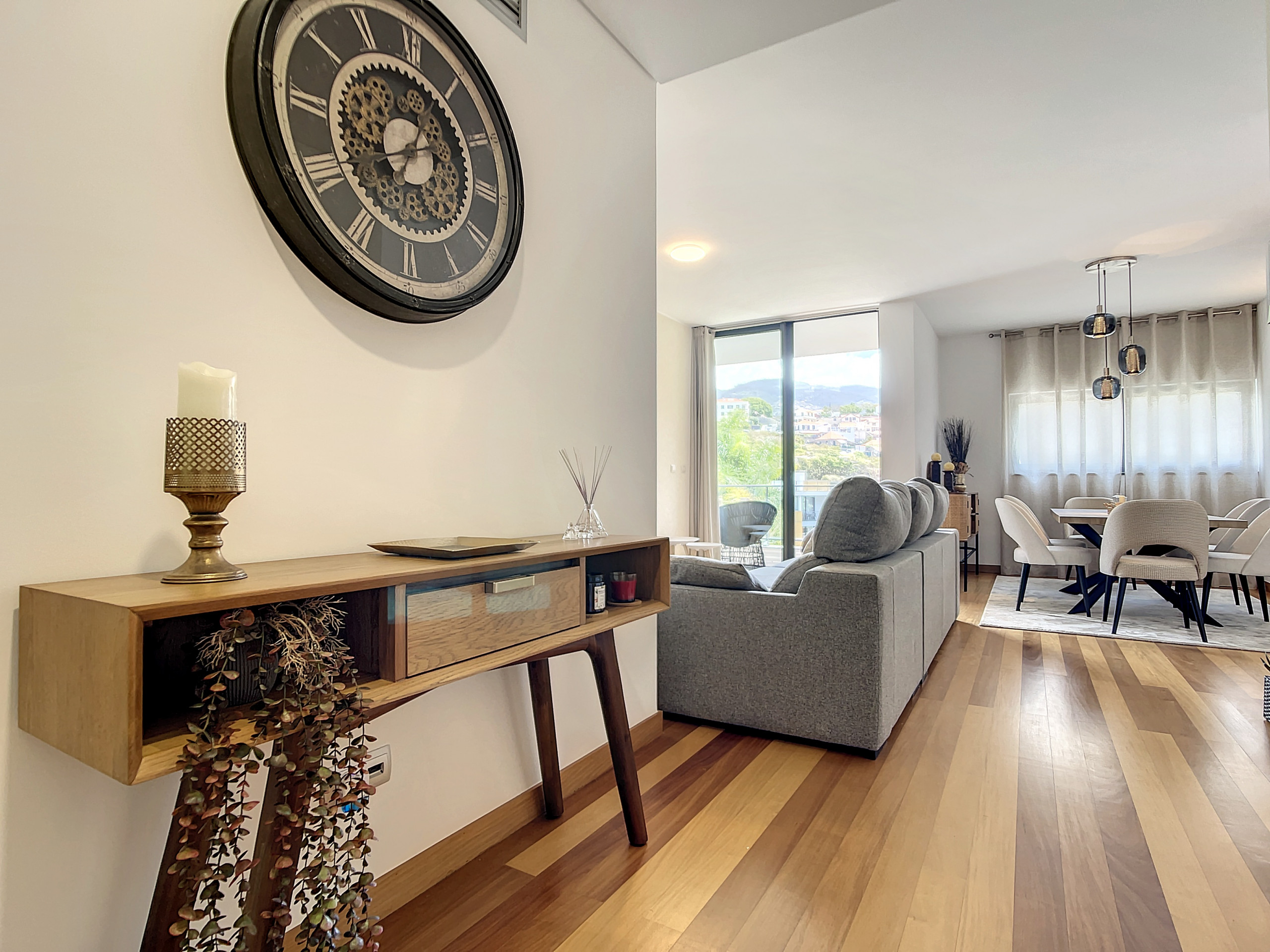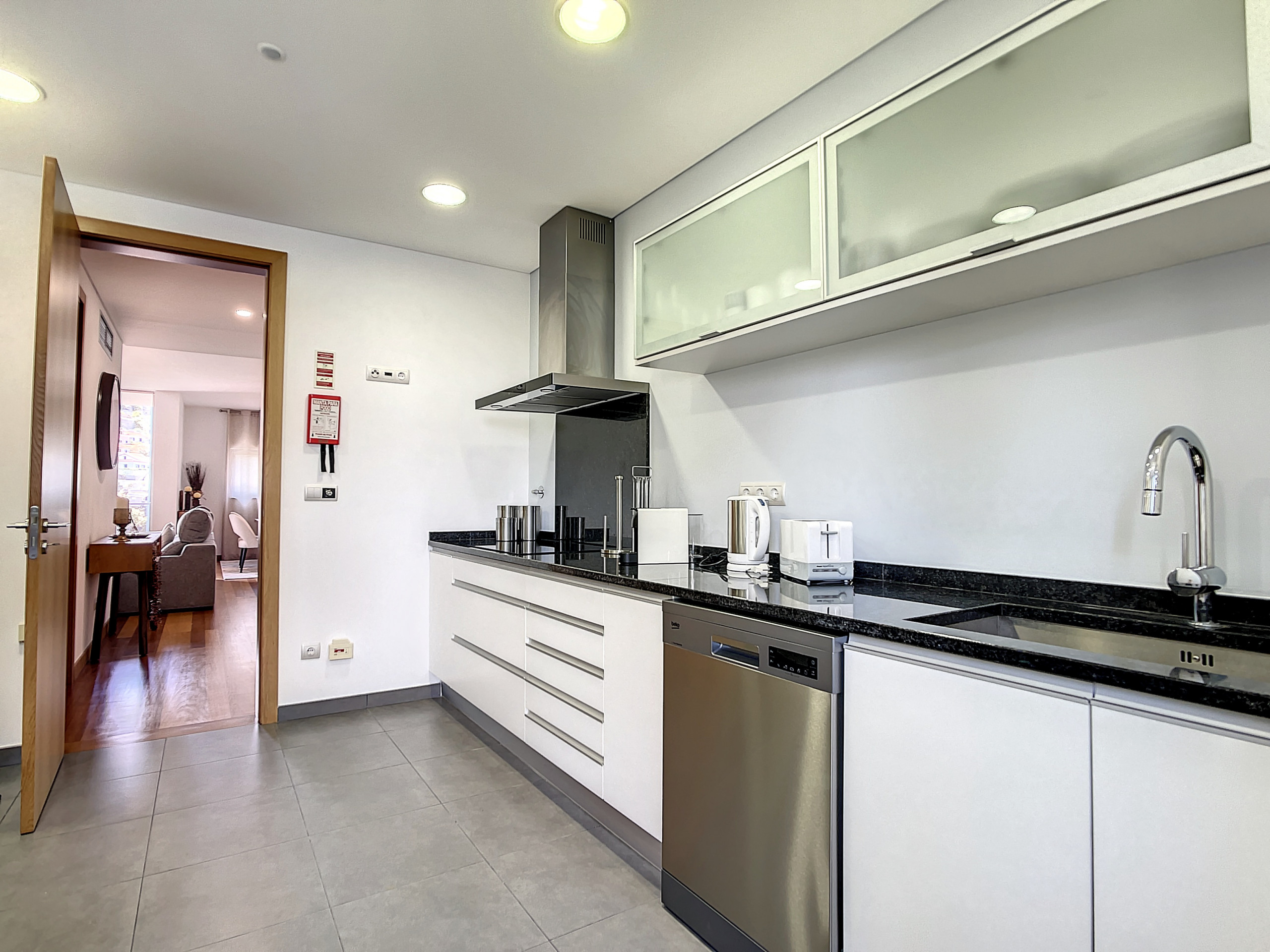 As you step out onto the balcony, be captivated by the panoramic views of the majestic mountains and the vibrant cityscape of Funchal. The balcony serves as a delightful space to unwind and savor a cup of Nespresso coffee, which is readily available in the well-equipped kitchen. The kitchen features modern appliances, including a fridge, freezer, oven, microwave, and dishwasher, as well as all the necessary utensils and cookware.