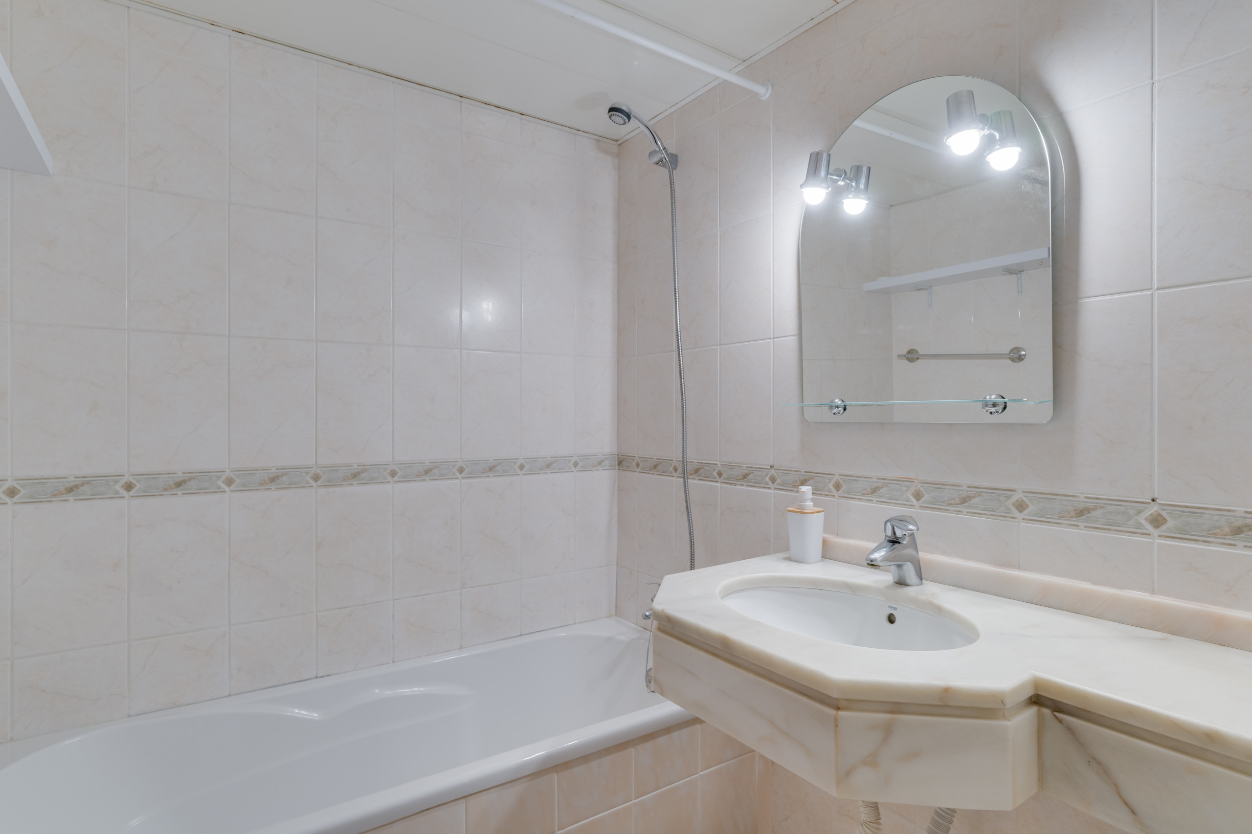 The apartment features three comfortable bedrooms: two with queen-size beds and one with two individual beds. There are two bathrooms, one with a bathtub for a relaxing soak and the other with a shower for quick refreshment.