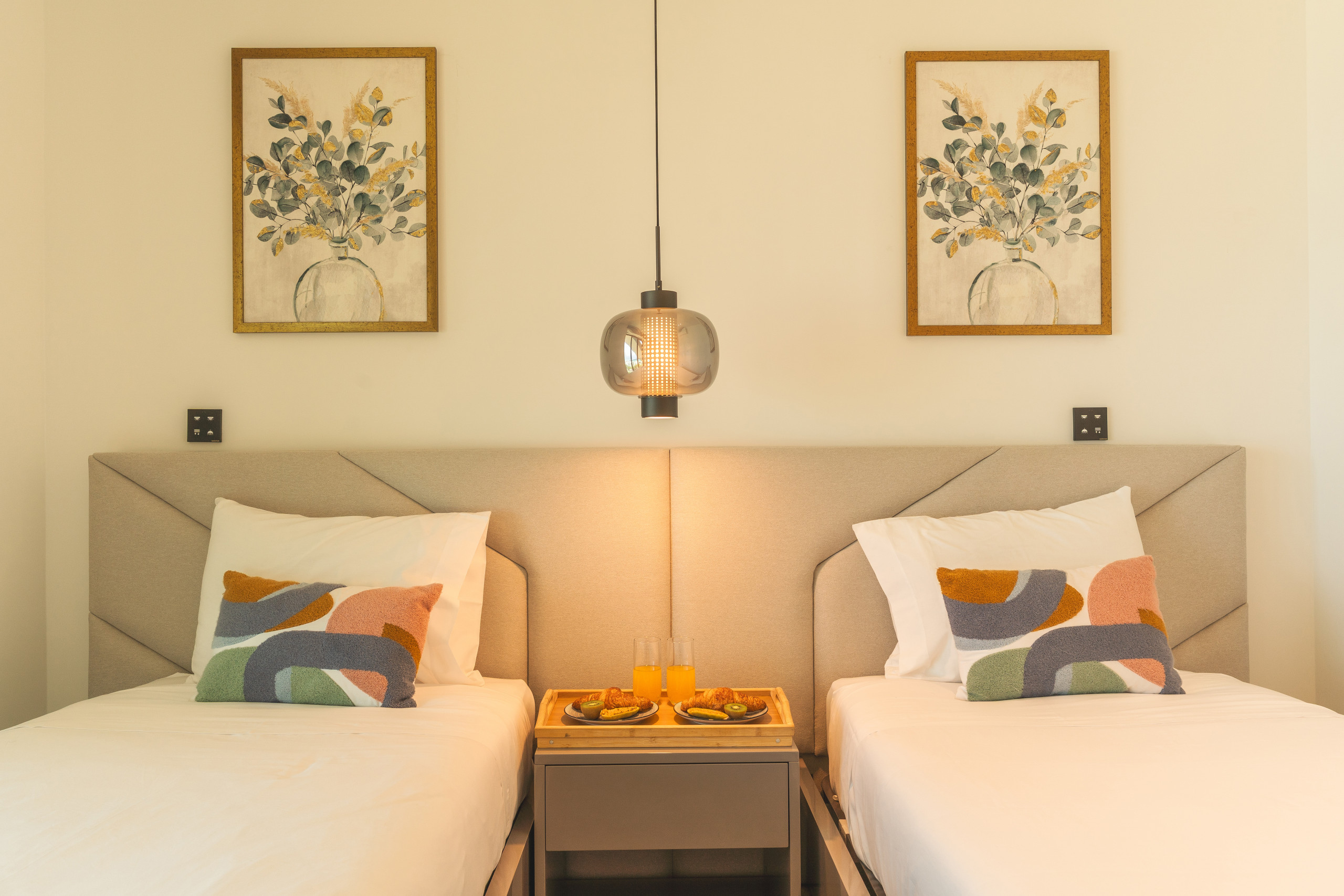 Accommodating up to six guests, the apartment features three thoughtfully designed bedrooms. Two have queen-size beds, ideal for couples or solo travelers, while the third offers two single beds for friends or family. With two bathrooms equipped with showers, one with a bathtub, and an additional toilet, guest convenience is ensured.