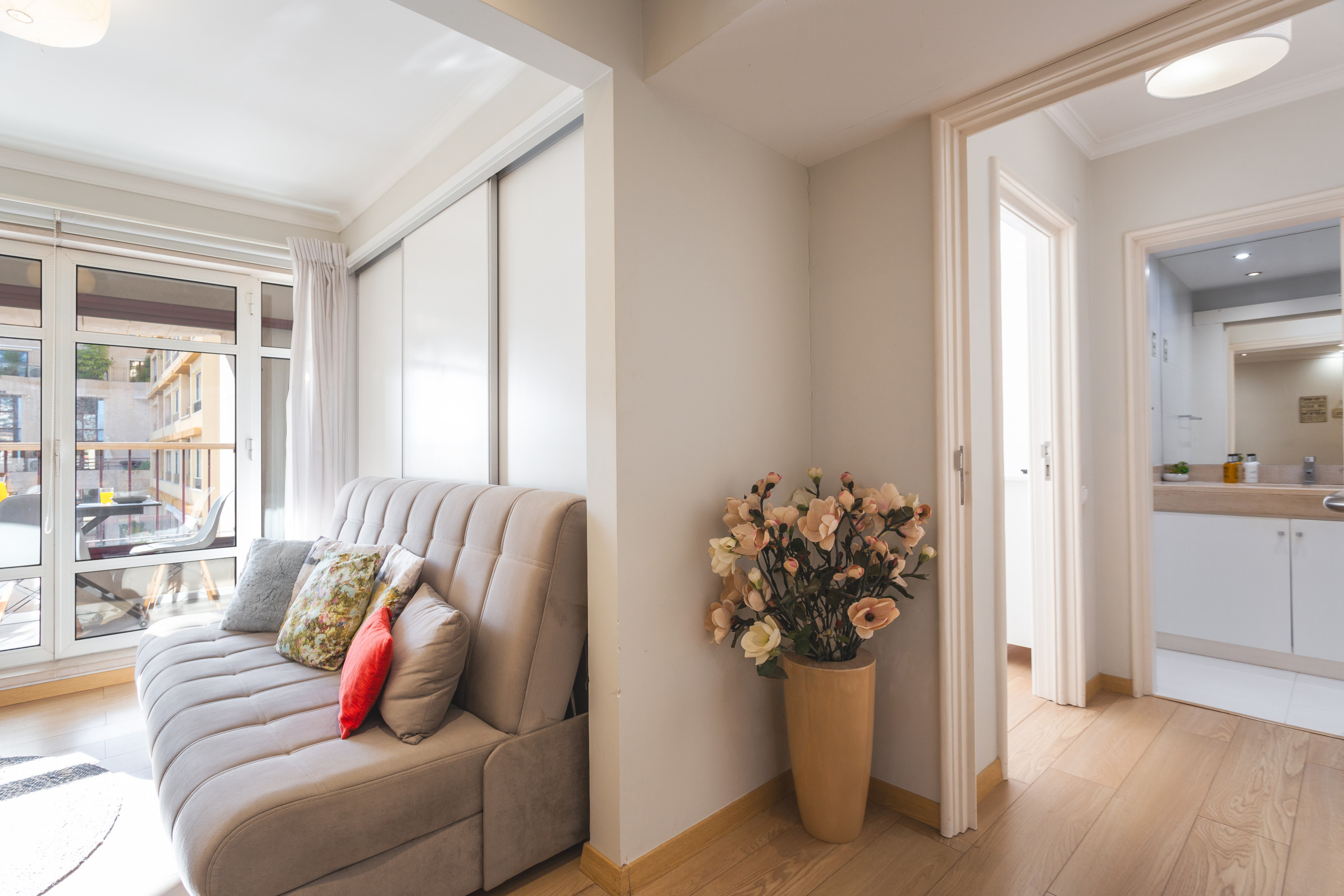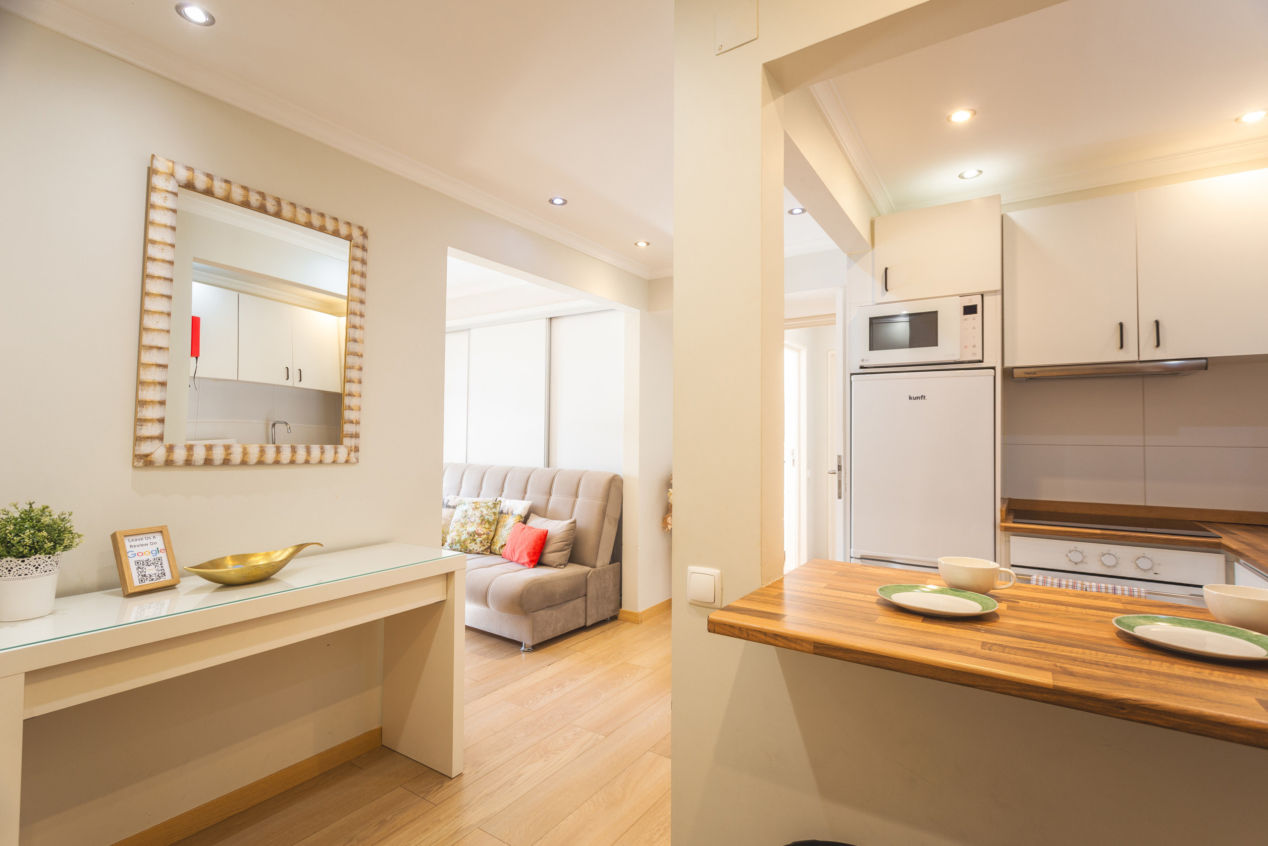 The apartment accommodates up to 4 guests and features a spacious bedroom with a queen-size bed. The living area is inviting and functional, with a smart TV and a comfortable sofa bed for additional guests. The fully equipped kitchen includes all essentials for preparing meals, such as a fridge, freezer, microwave, hob, cutlery, and plates.