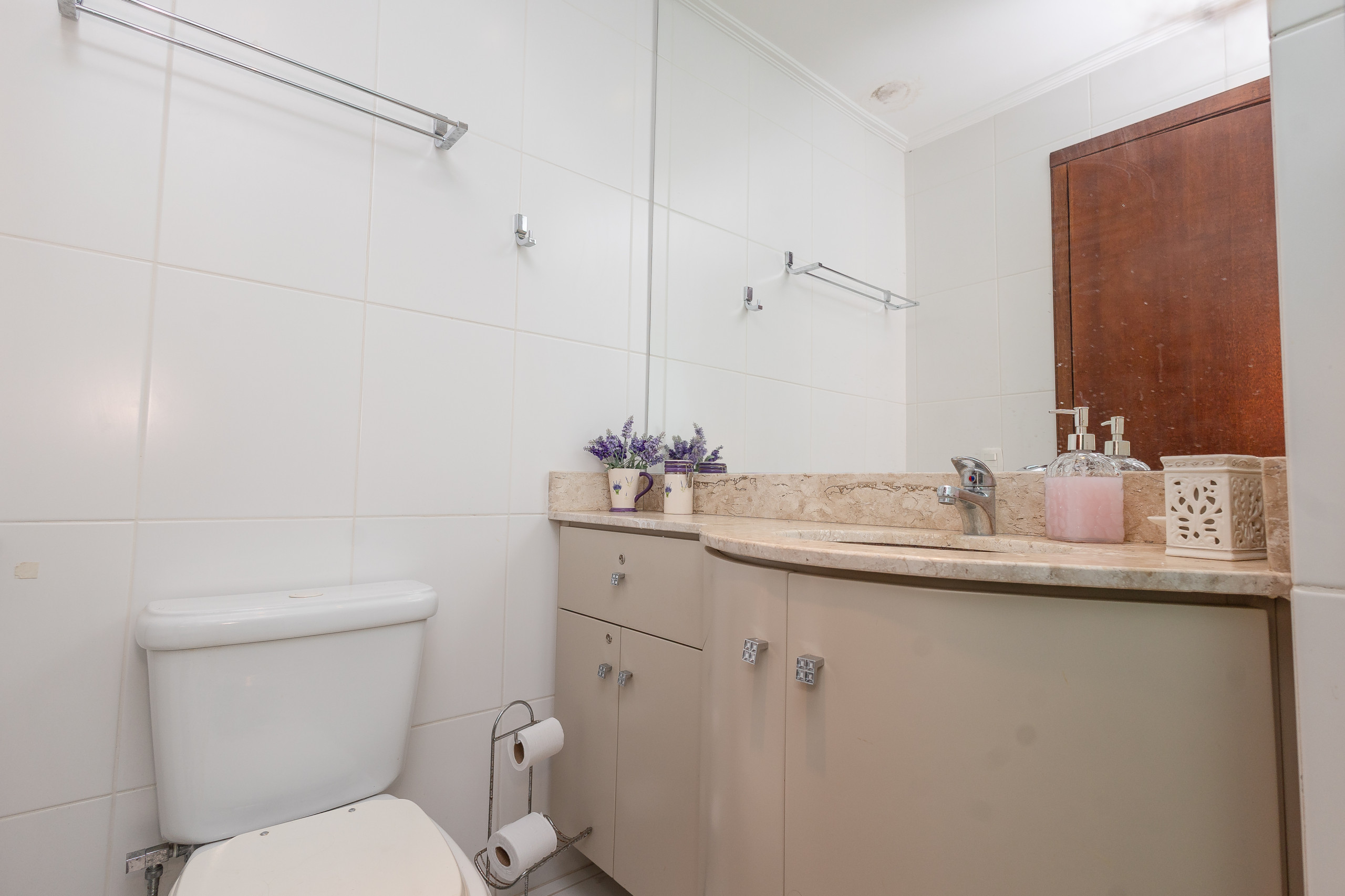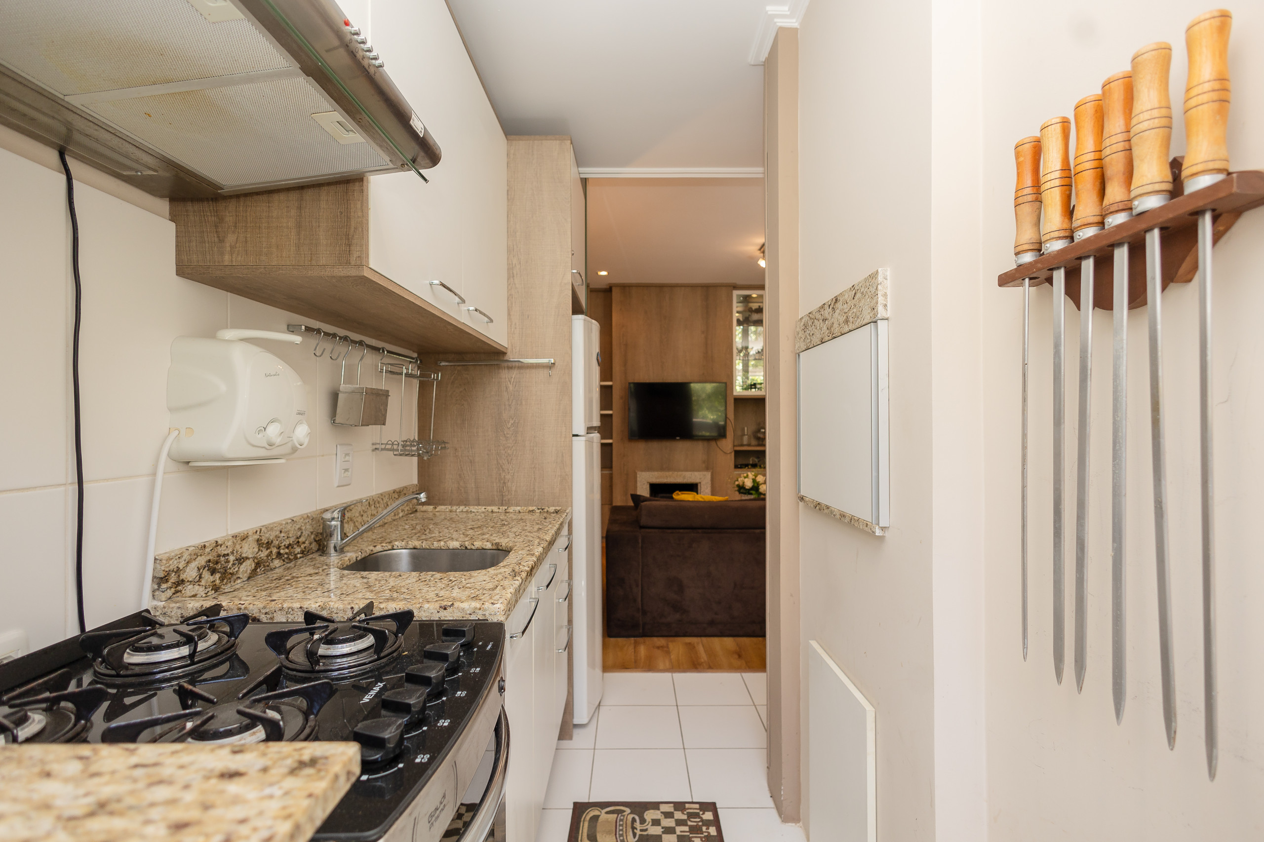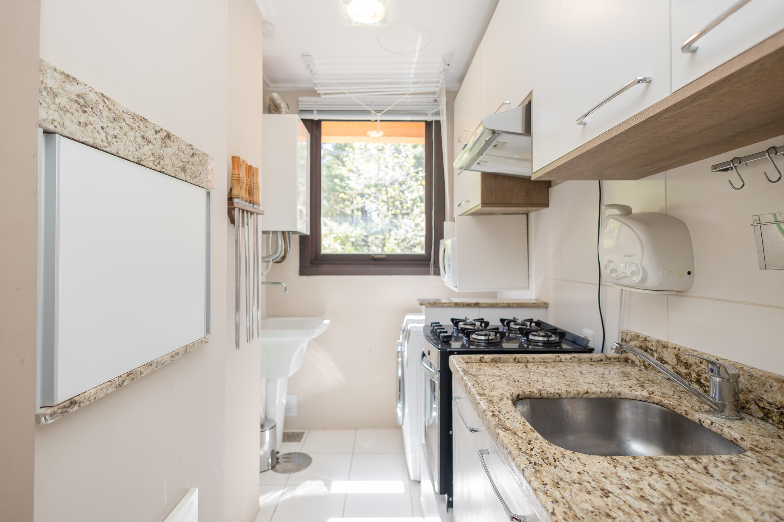 The complete kitchen has a refrigerator, coffee maker, sandwich maker, microwave, oven and stove. At the table, up to 06 guests can sit for meals or to simply enjoy a hot chocolate or a wine. The apartment also has a laundry with wash and dry.