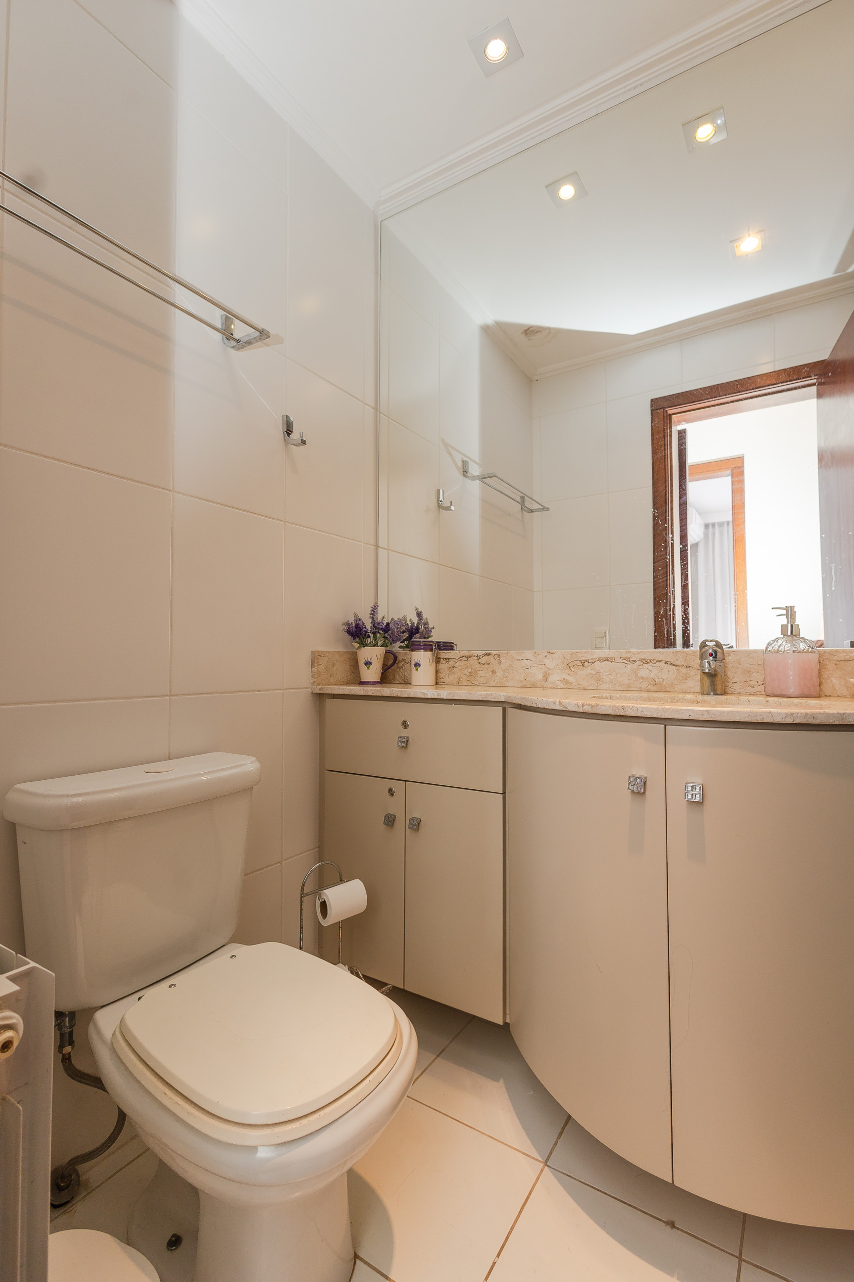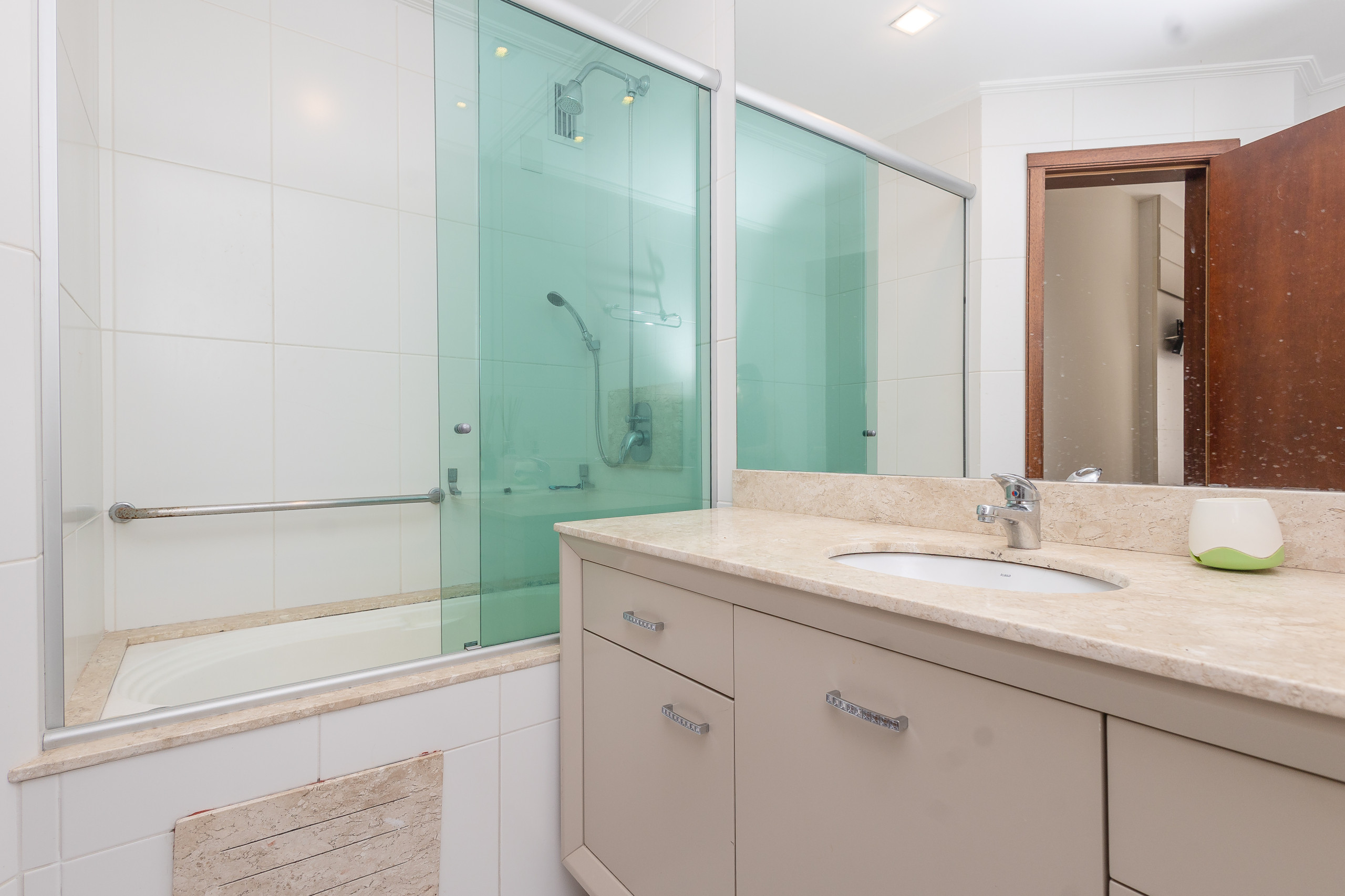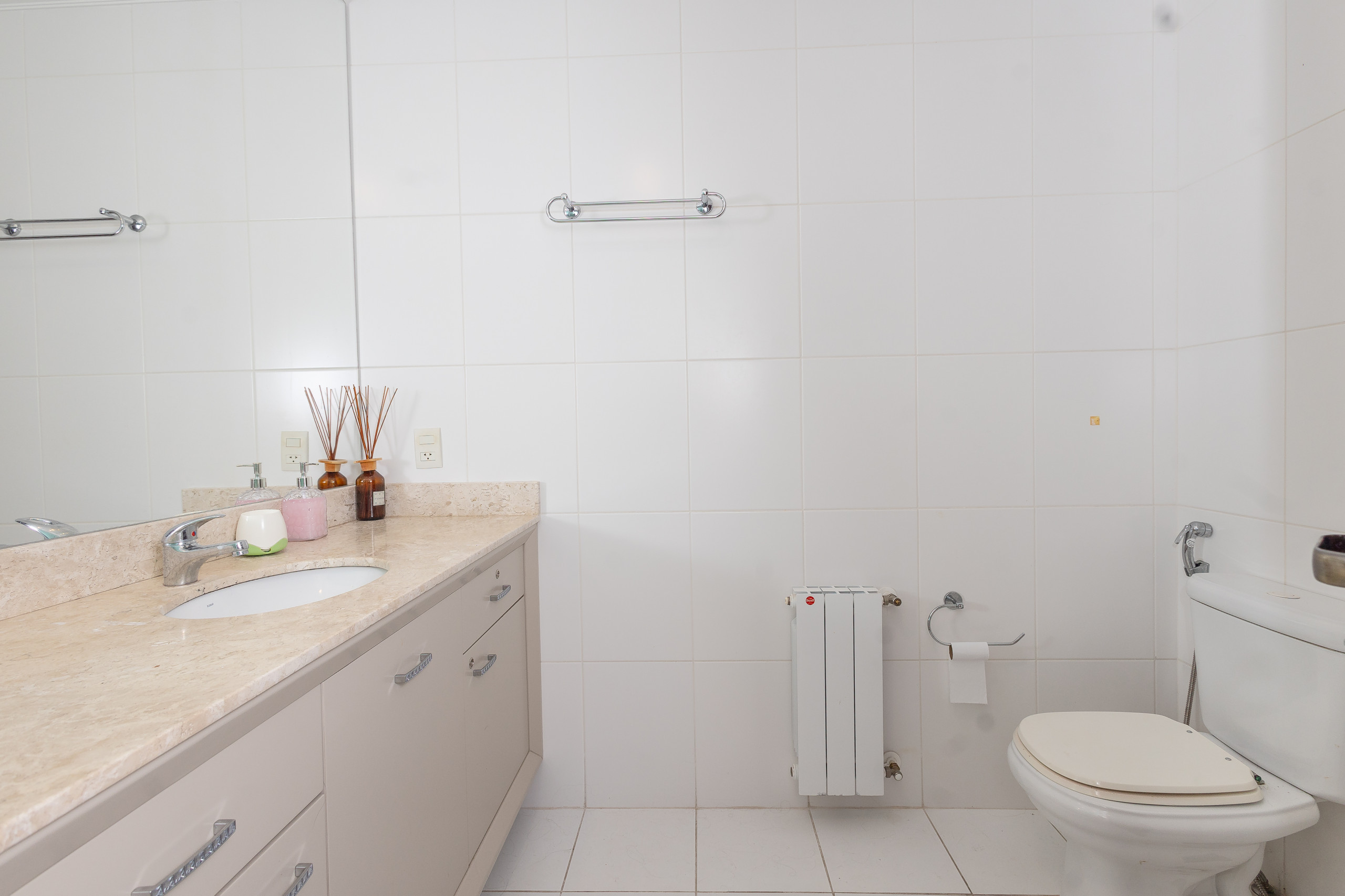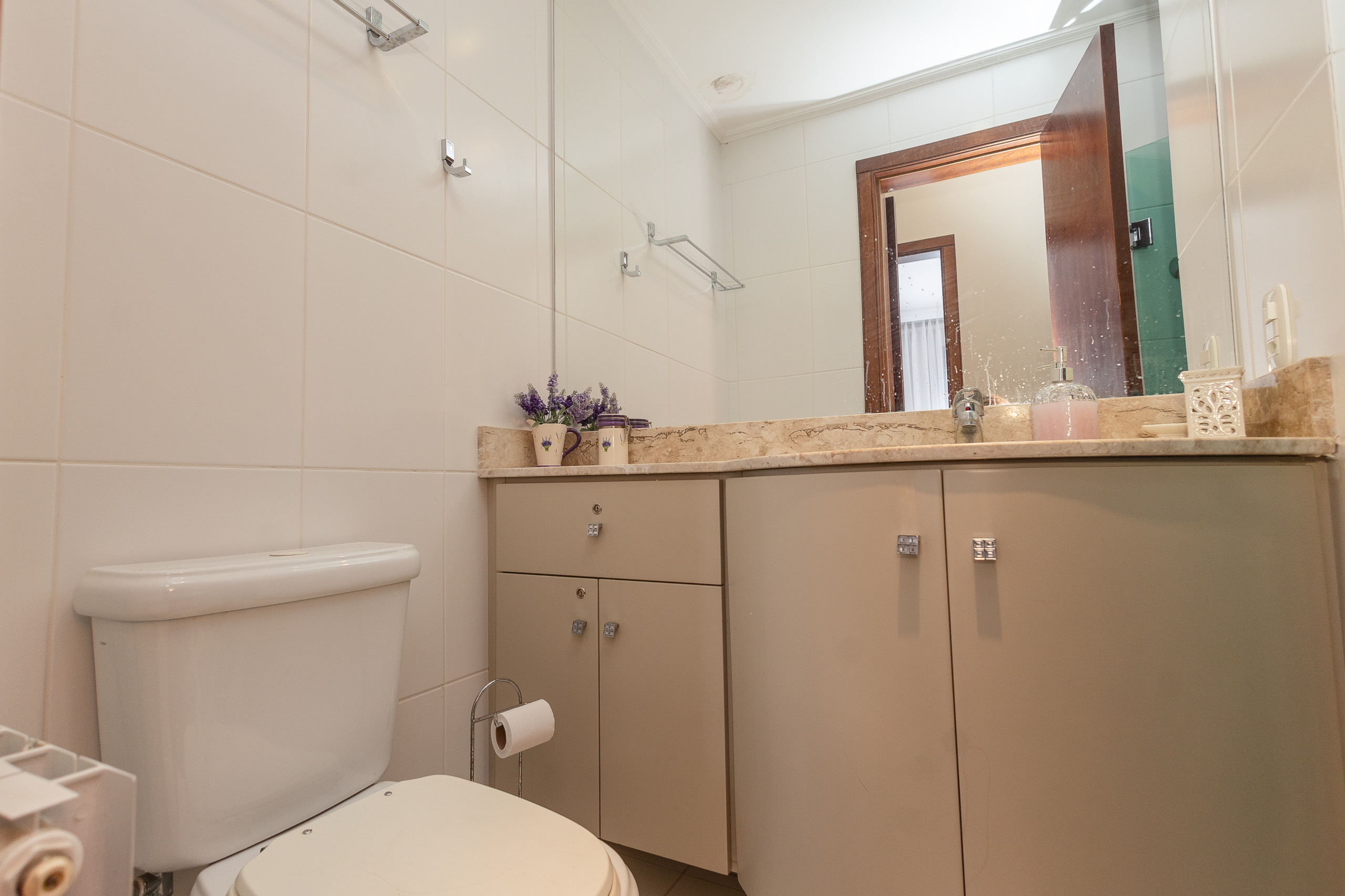 The complete kitchen has a refrigerator, coffee maker, sandwich maker, microwave, oven and stove. At the table, up to 06 guests can sit for meals or to simply enjoy a hot chocolate or a wine. The apartment also has a laundry with wash and dry.