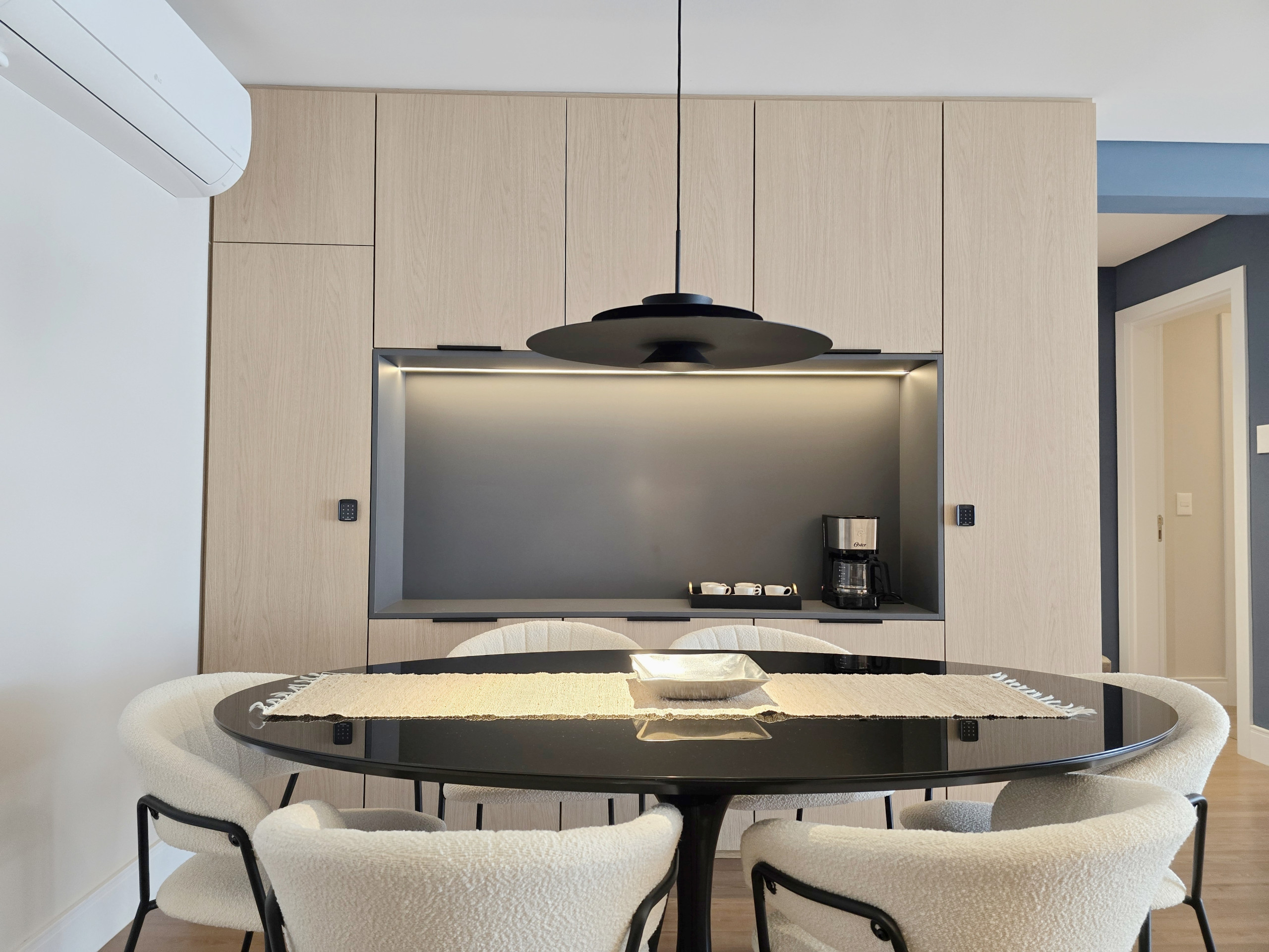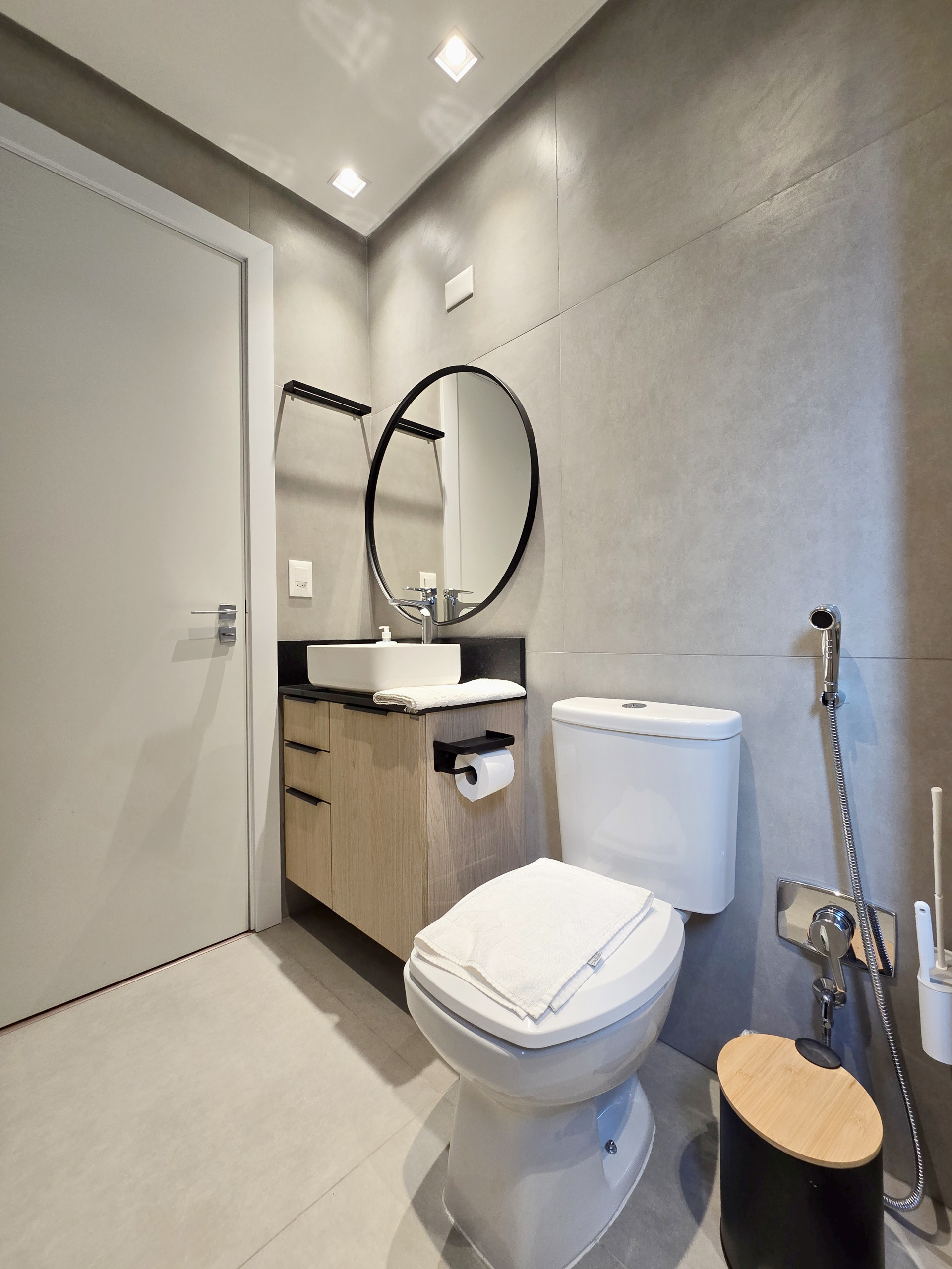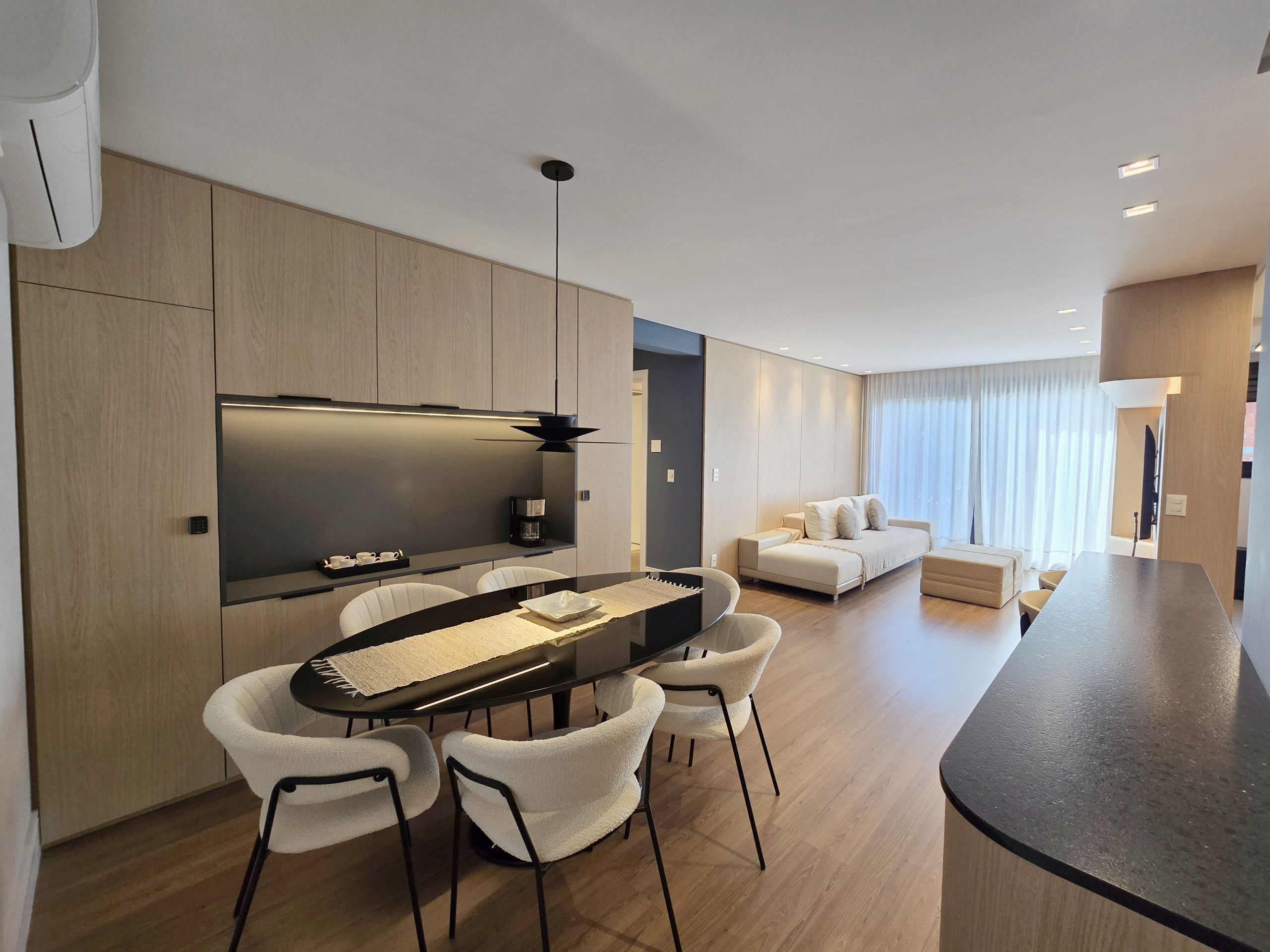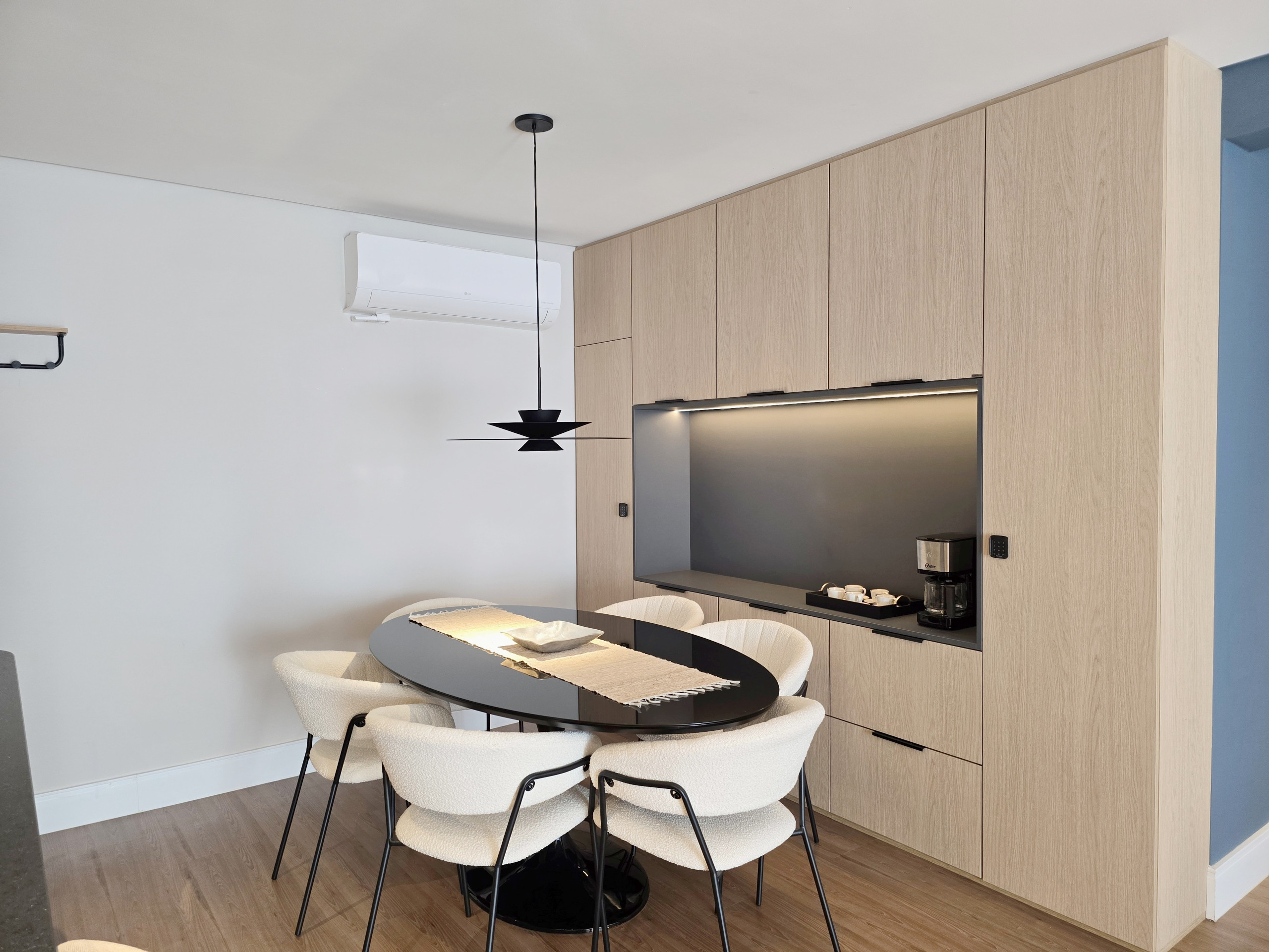 The complete kitchen has a dishwasher, barbecue grill, refrigerator, coffee maker, sandwich maker, microwave, blender and stove with oven. At the table, up to 06 guests can sit for meals or to simply enjoy a hot chocolate or a wine. The apartment also has a laundry with washer and dryer.