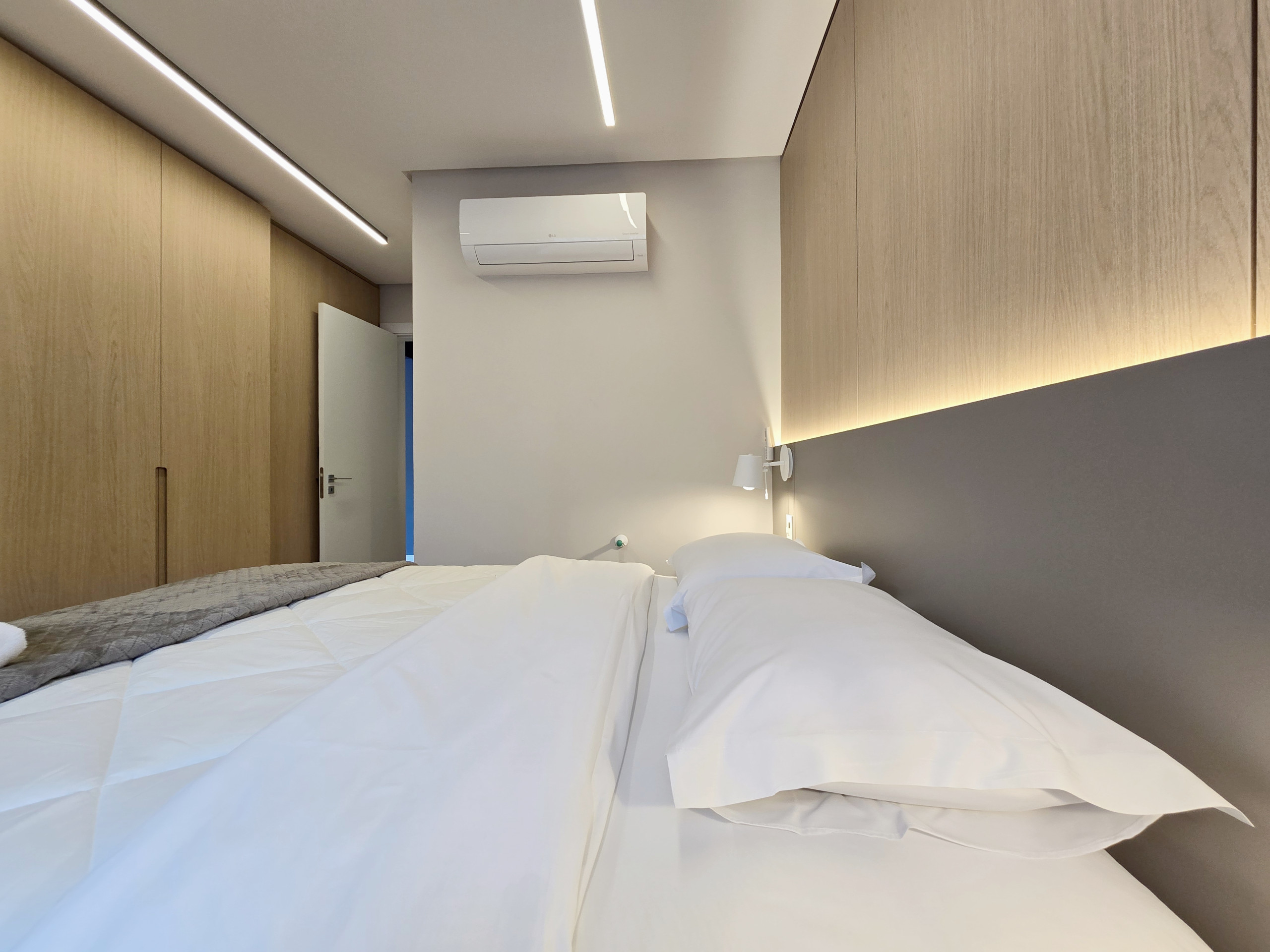 In the intimate area, we find two suites, each with split A/C, blackout blinds and curtains that bring cosiness. One of the suites has a queen bed and the other suite has a double bed.