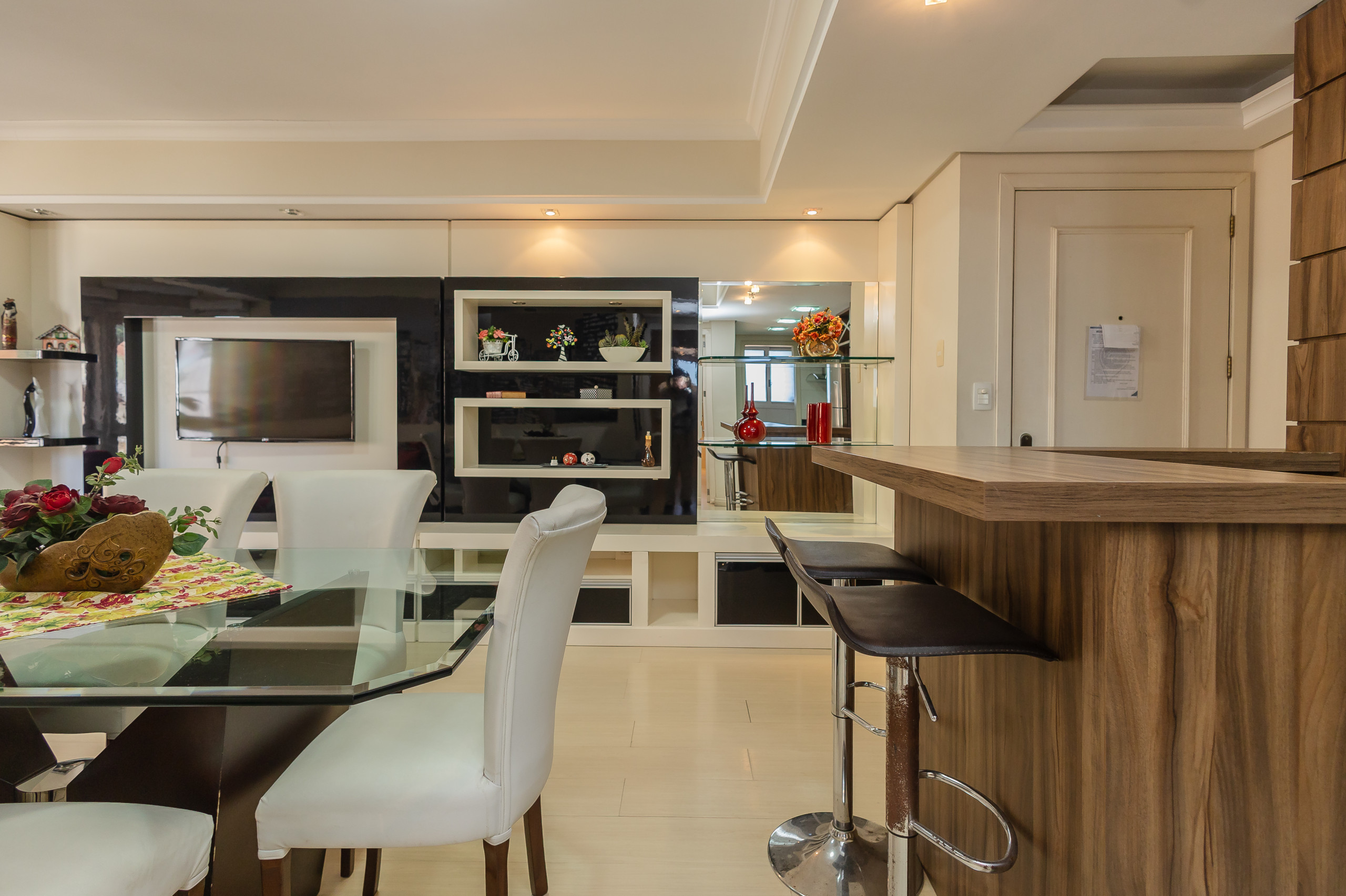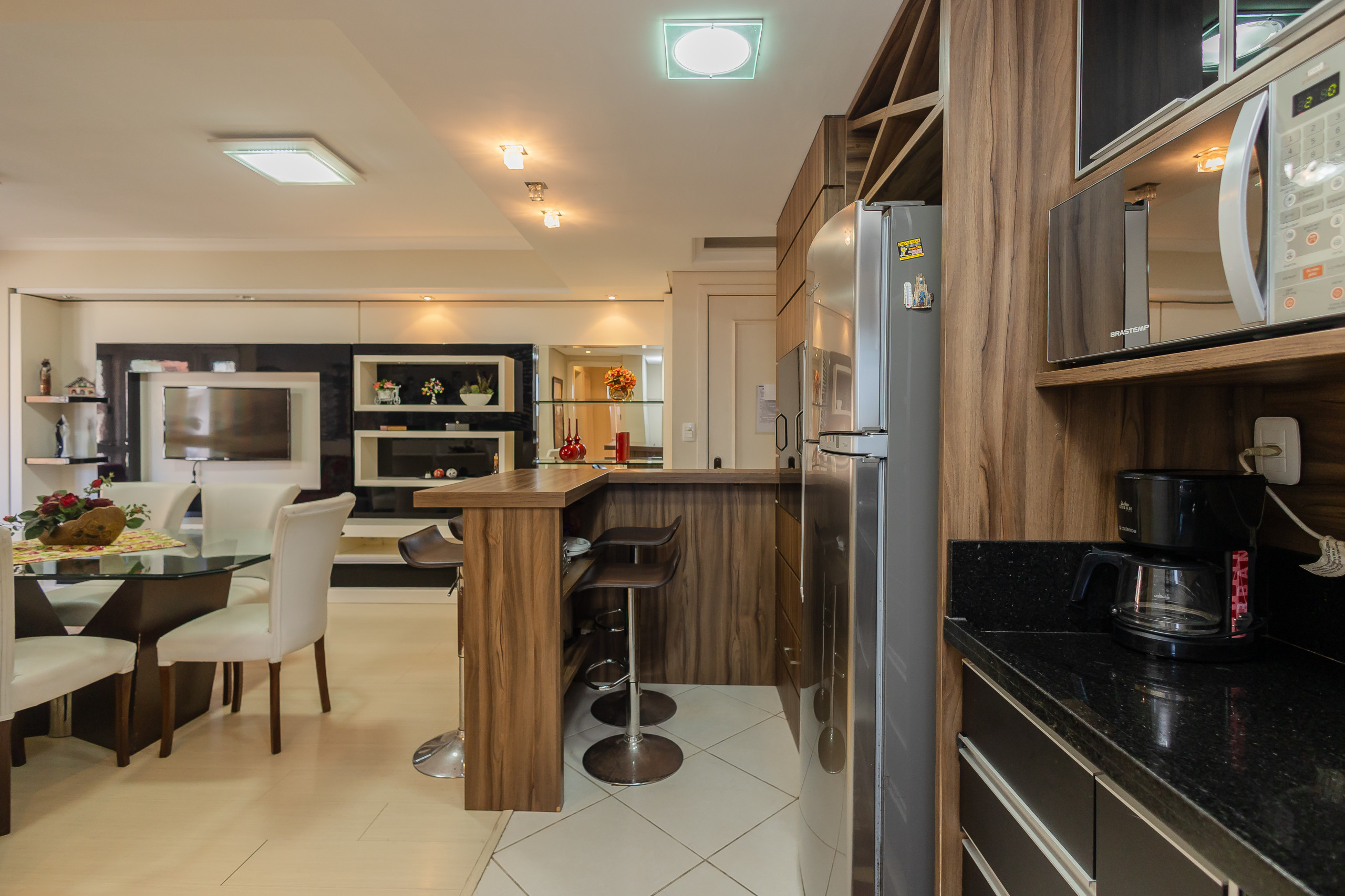 Modern apartment with 2 bedrooms, including one suite, spacious living and dining area integrated with the kitchen (fully equipped) and gourmet area with barbecue grill. It also features a service area with a washing machine, complete social bathroom, 1 garage space, and a complete bed and bath linen set for all guests during their stay. Located on one of the city's main avenues, it is approximately 1km from the covered street, and you will find the best of life here without needing to take the car out of the garage.