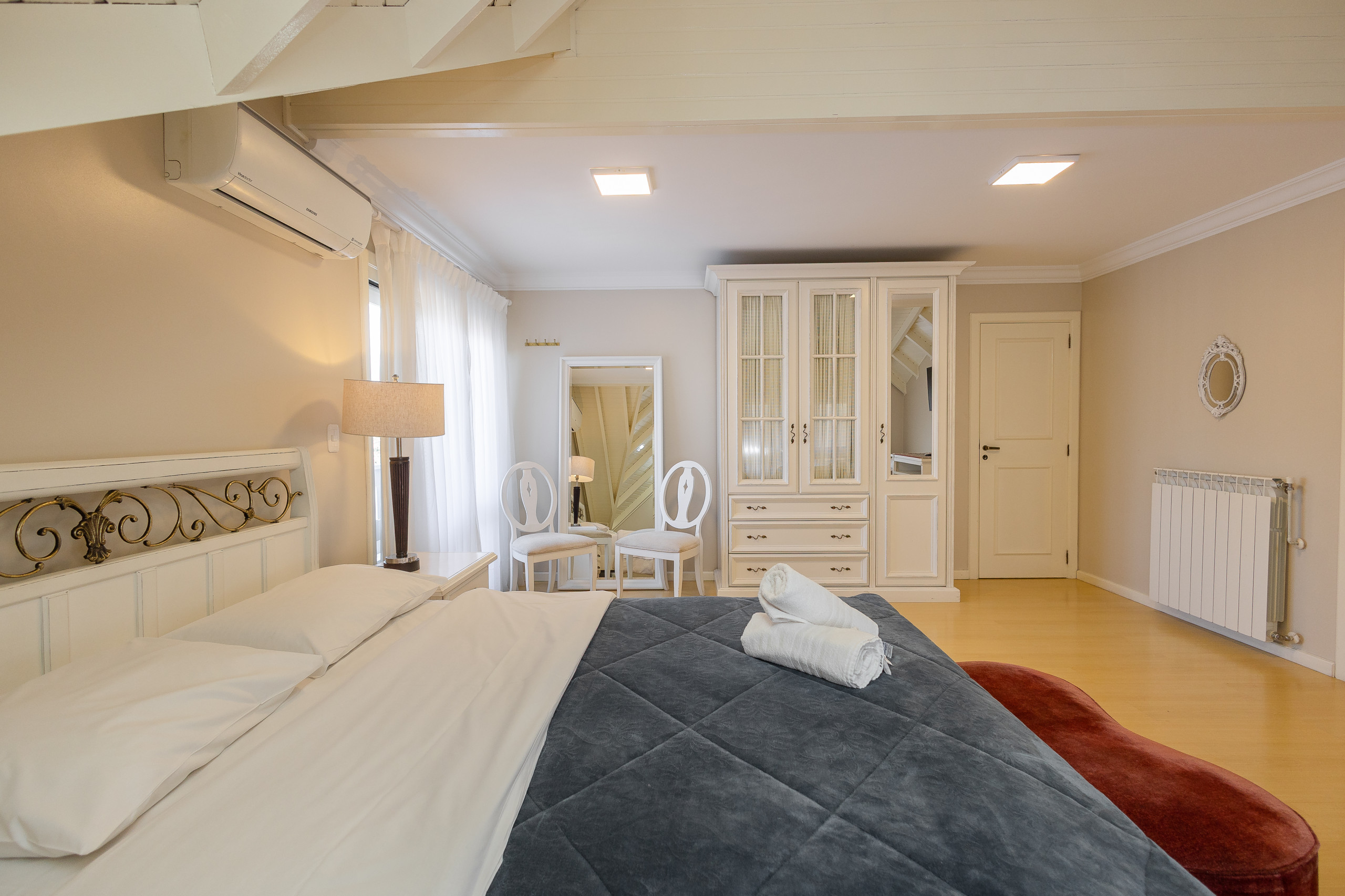 The fully equipped American kitchen is a true highlight, with a refrigerator, washing machine, dryer, oven, microwave, coffee machine, toaster, kettle, and all the necessary utensils for preparing delicious meals. Hot/cold air conditioning in the living room and suites ensures comfort in any season.